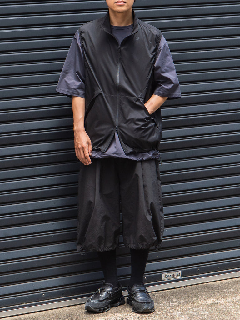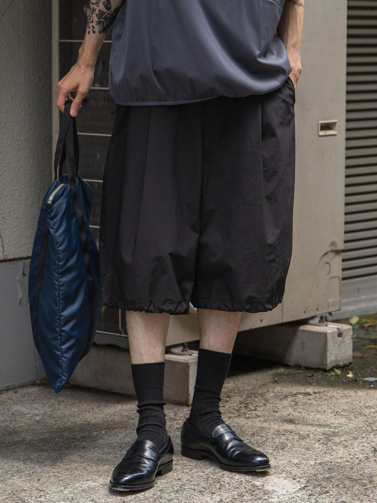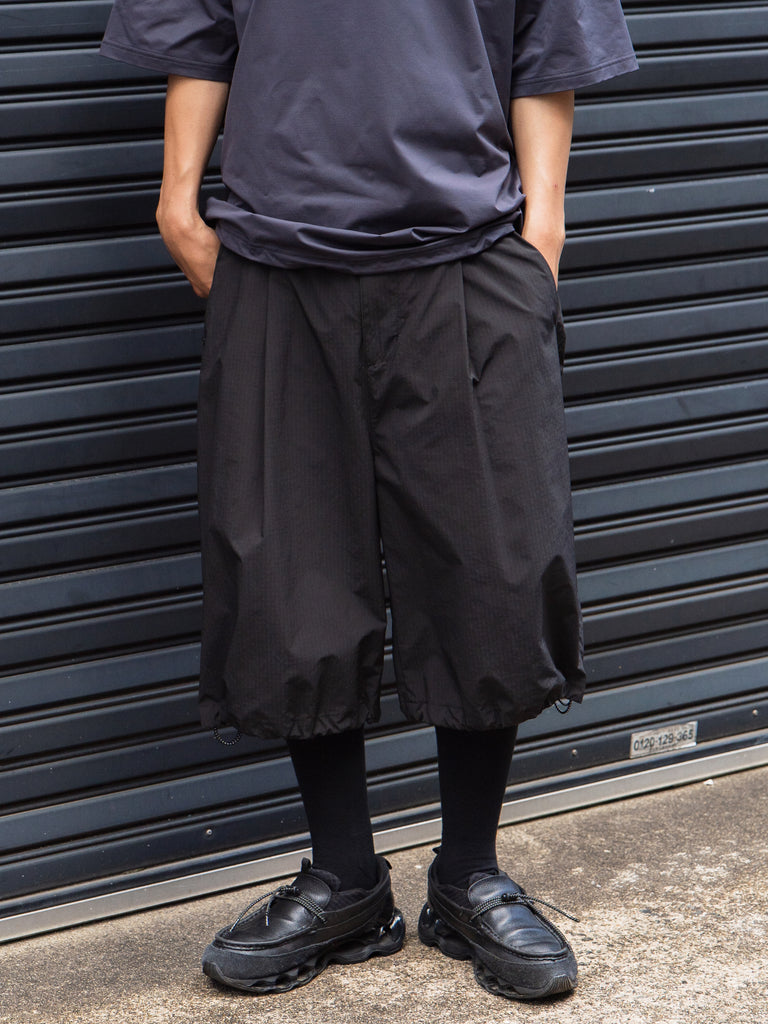 膝下の長めの丈感とポケットのカッティングが特徴で、裾はドローストリングにて絞れる仕様でシルエットの変化を楽しめる1本。