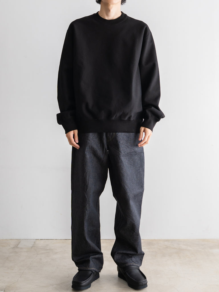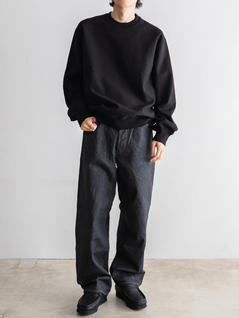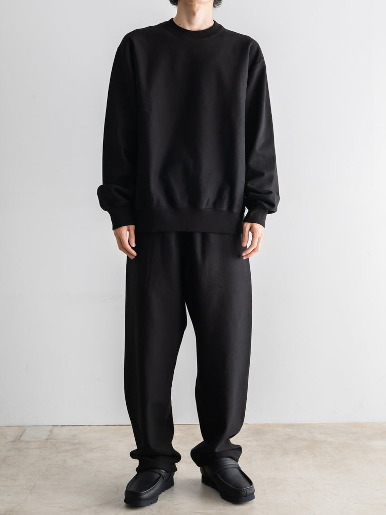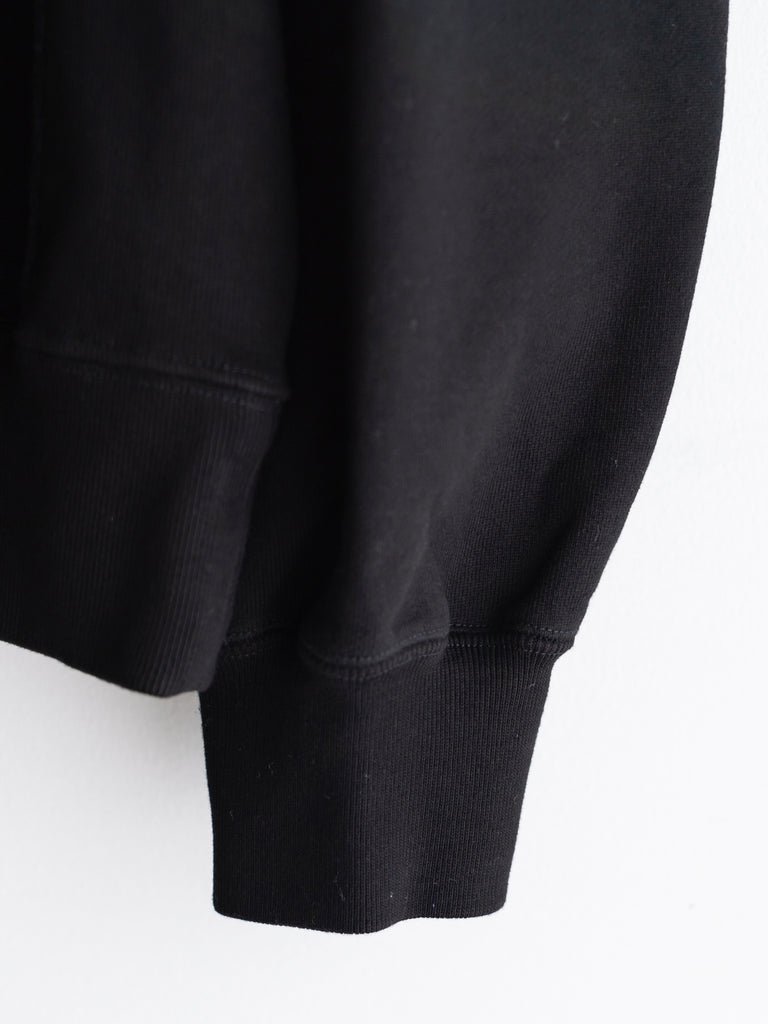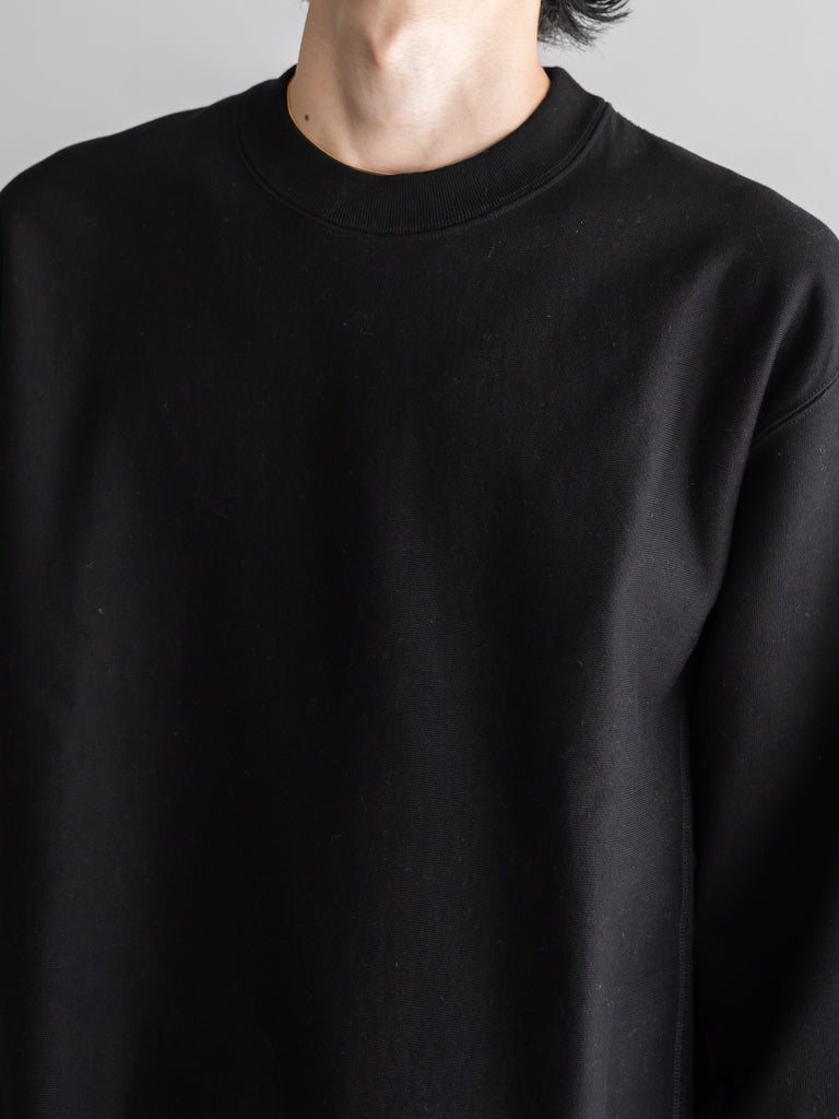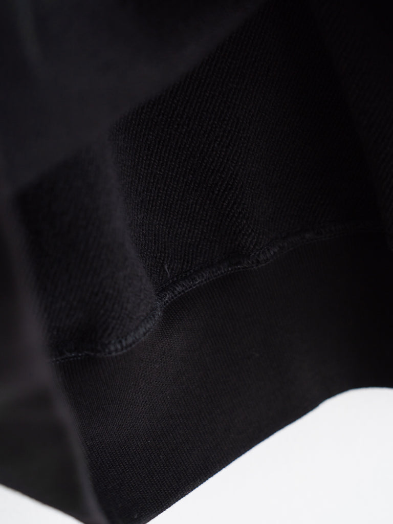 裏のループに無撚糸を仕様して肌触りをソフトに、表面は毛羽を抑え光沢が出るように、しっかりと限界まで度詰めをして、ハードな風合いで仕げているスウェット生地です。
