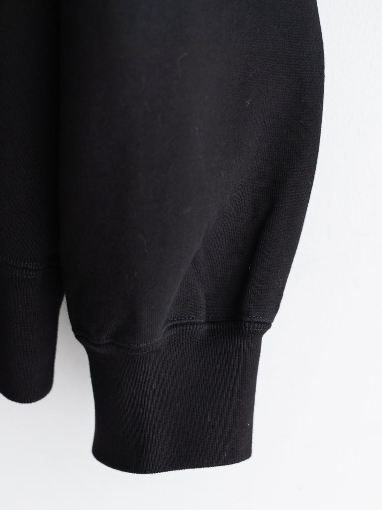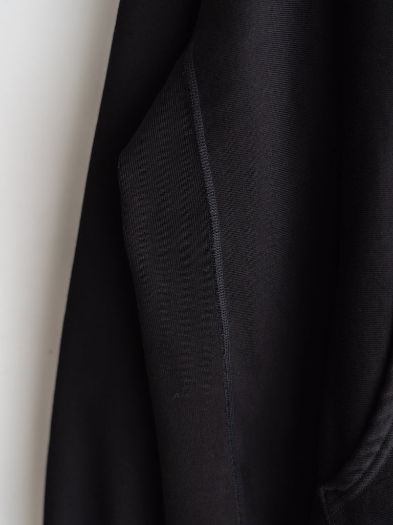 裏のループに無撚糸を仕様して肌触りをソフトに、表面は毛羽を抑え光沢が出るように、しっかりと限界まで度詰めをして、ハードな風合いで仕げているスウェット生地です。