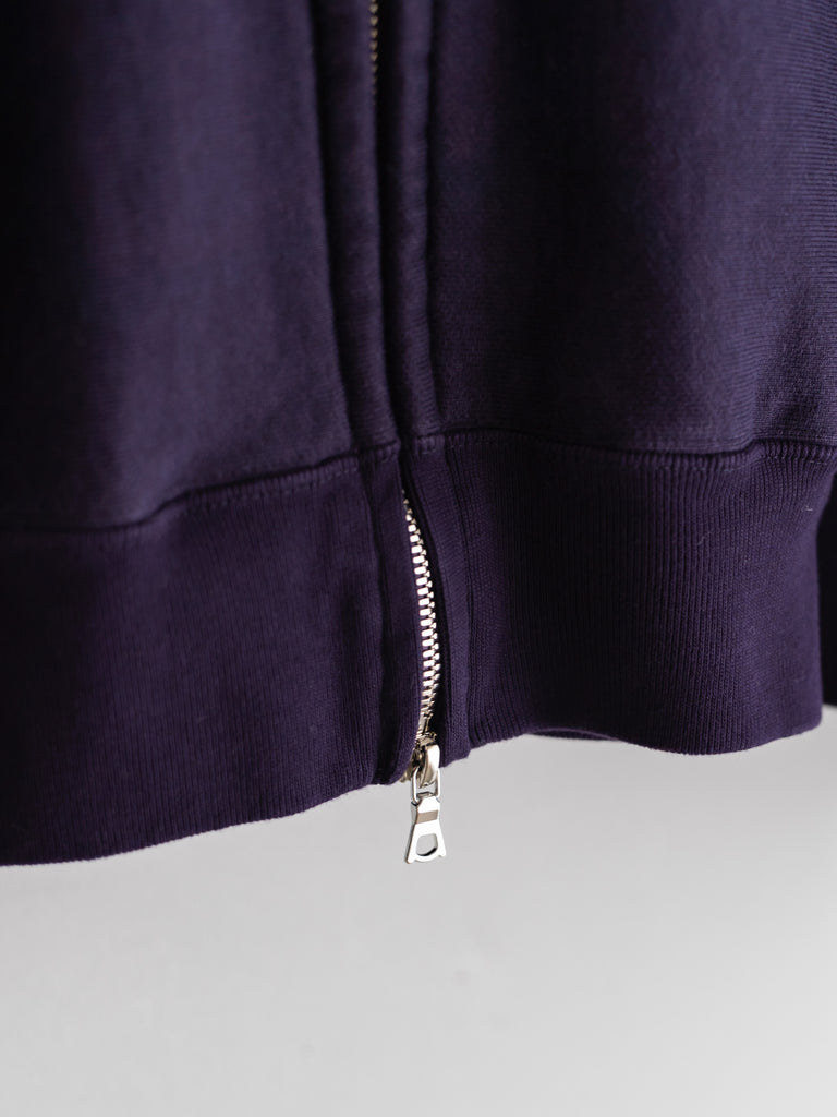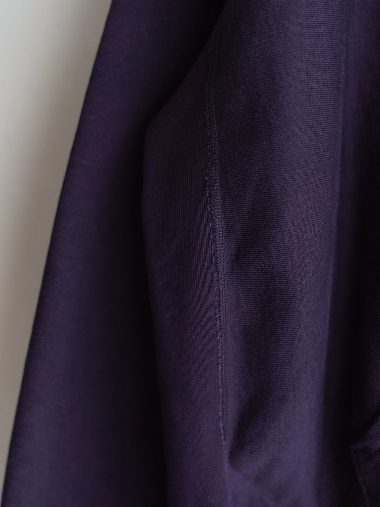 裏のループに無撚糸を仕様して肌触りをソフトに、表面は毛羽を抑え光沢が出るように、しっかりと限界まで度詰めをして、ハードな風合いで仕げているスウェット生地です。