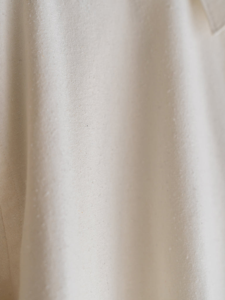 ほどよくネップ感のある⽣地を旧式織機で織り上げ、つまり感のある表⾯感とナチュラルなニュアンスを両⽴してもらいました。