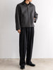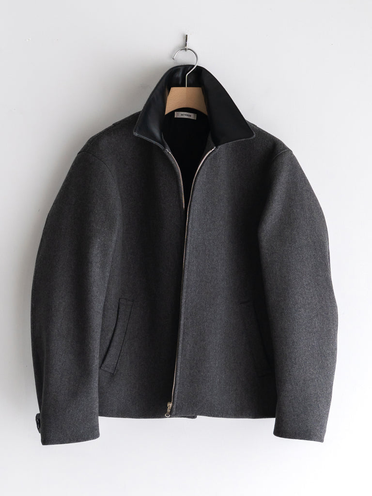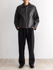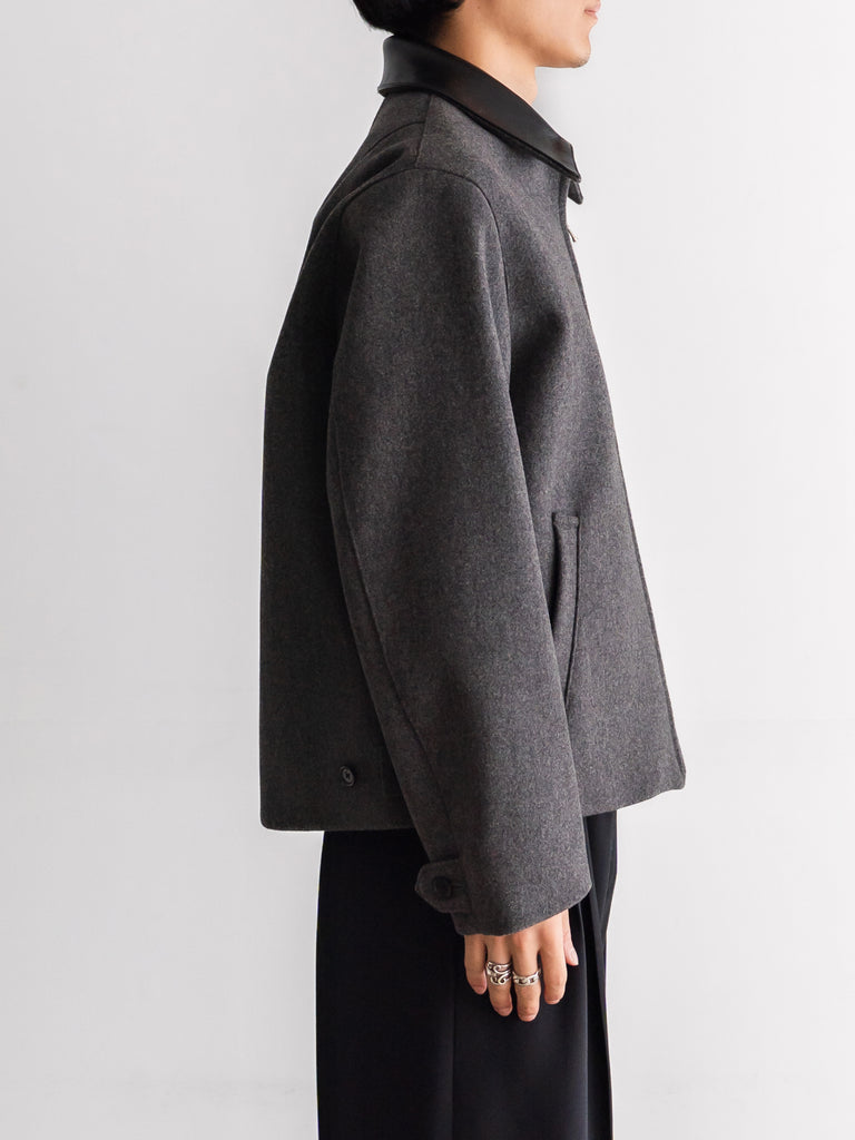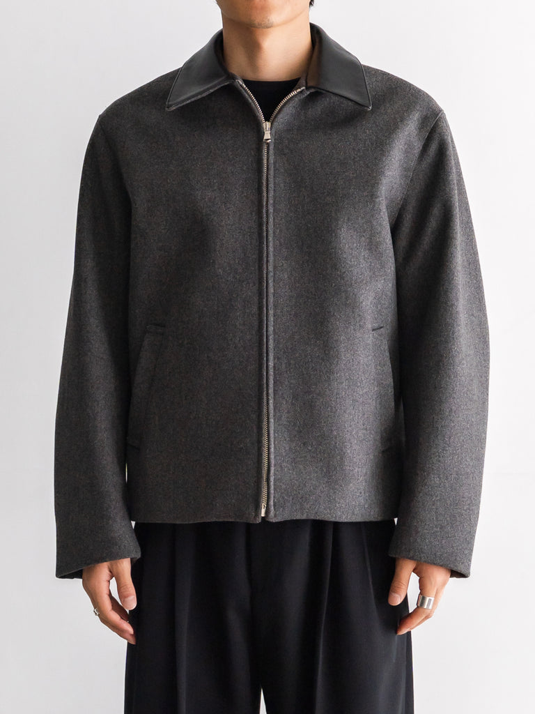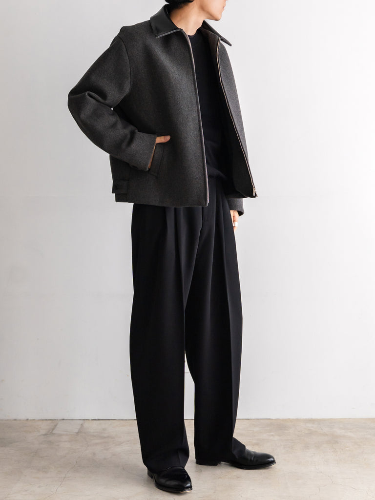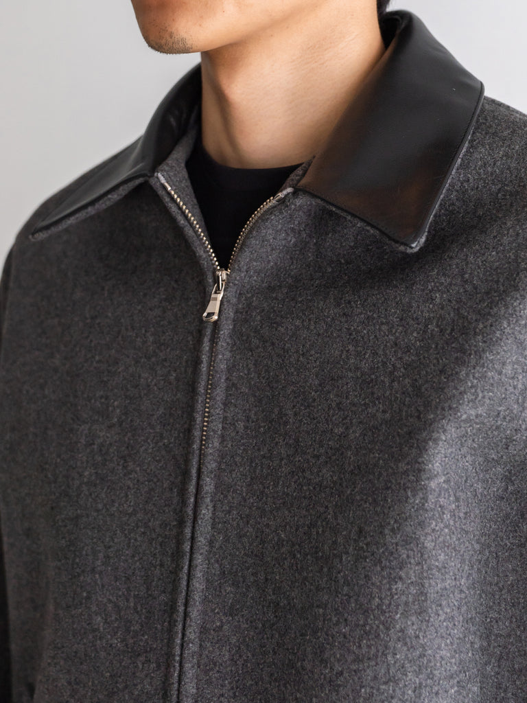 クラシックなスポーツジャケットをベースに、上衿にレザーをあしらうことでアクセントを加えたハリントンジャケット。