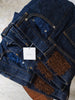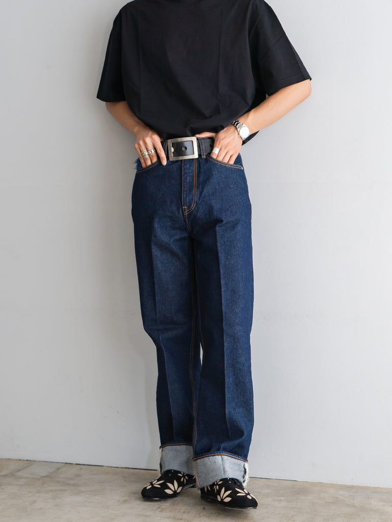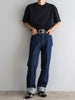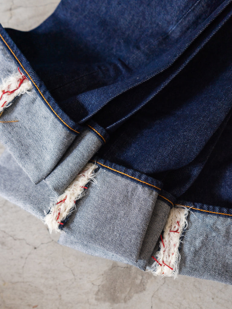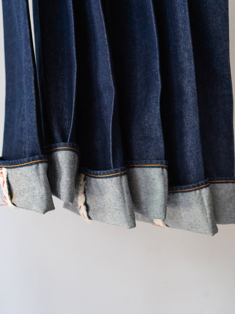 洗った後に裾に出るシワ感を残したかったので、一度パンツを縫製しワンウォッシュした後に裾を解き、赤耳風ニットを縫い込んだ後に再度裾を縫製しています。