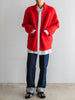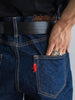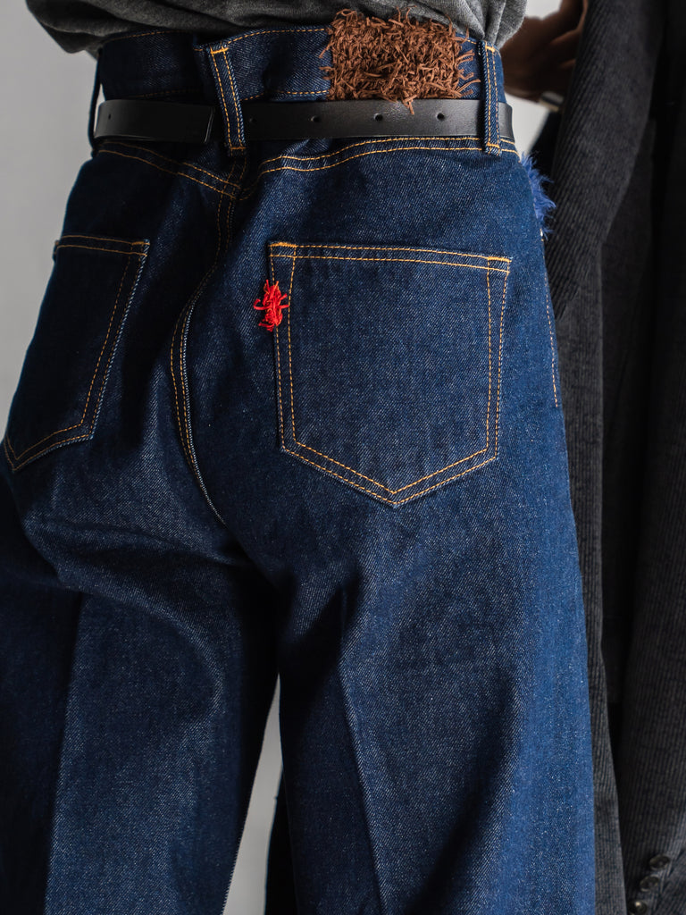 AW22でデニム風のセットアップを作った時に皮パッチや赤タグをニットでやってみてすごく好きだったのでそれをこのデニムにも持ってきて、コインポケットも作りました。