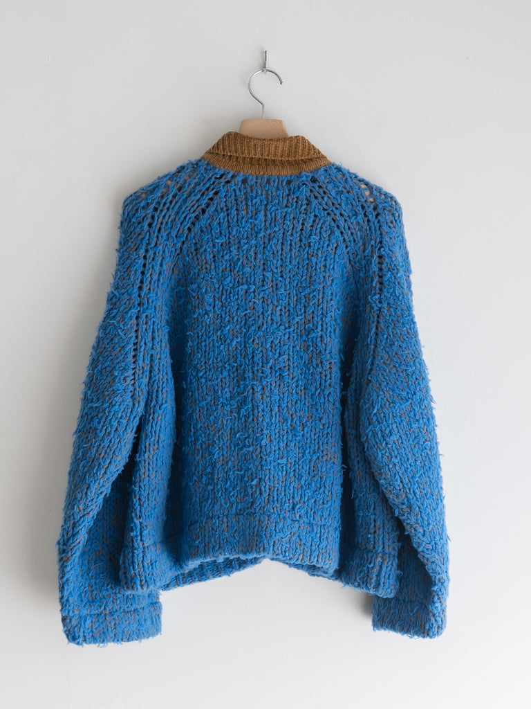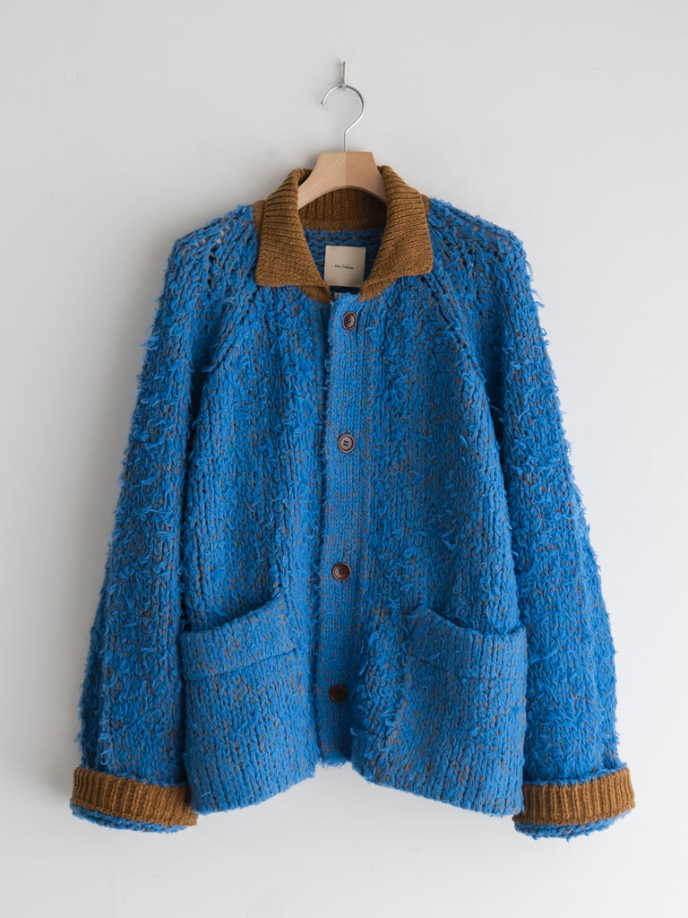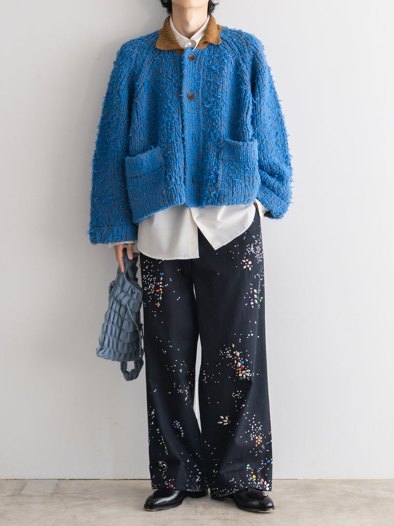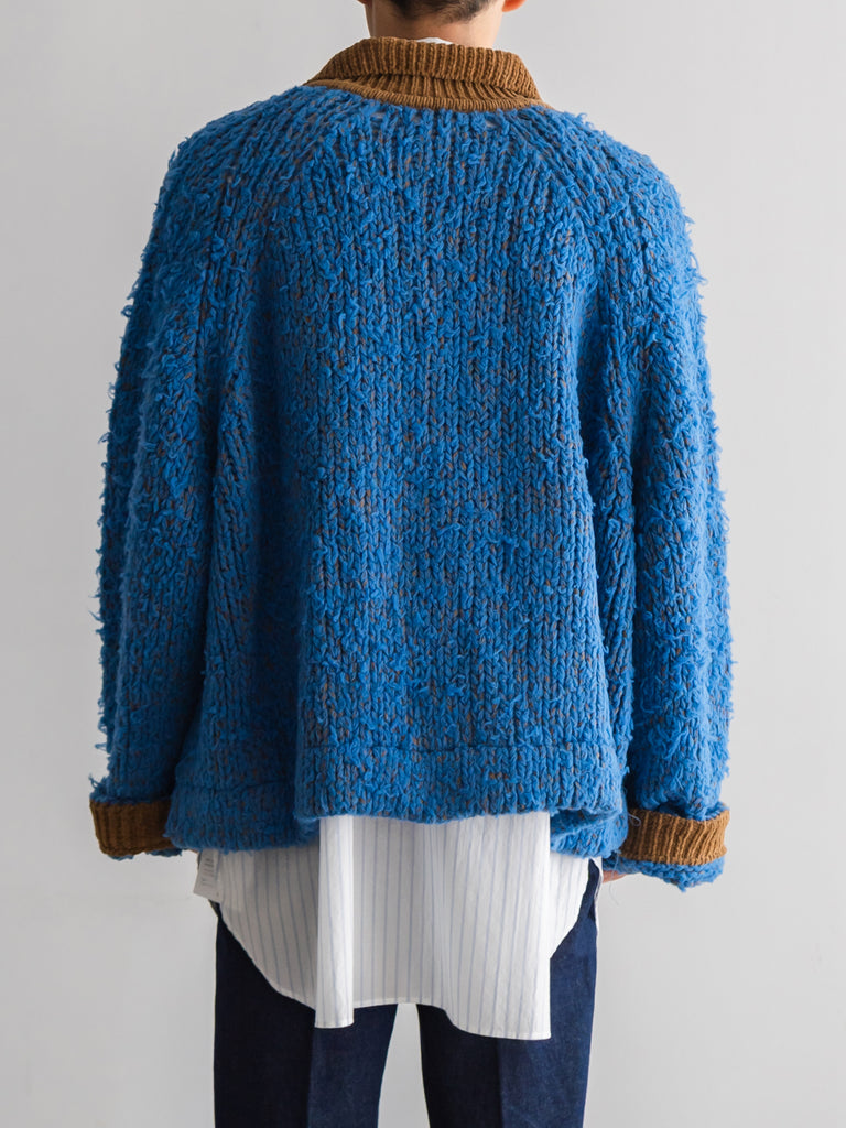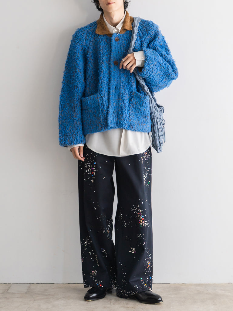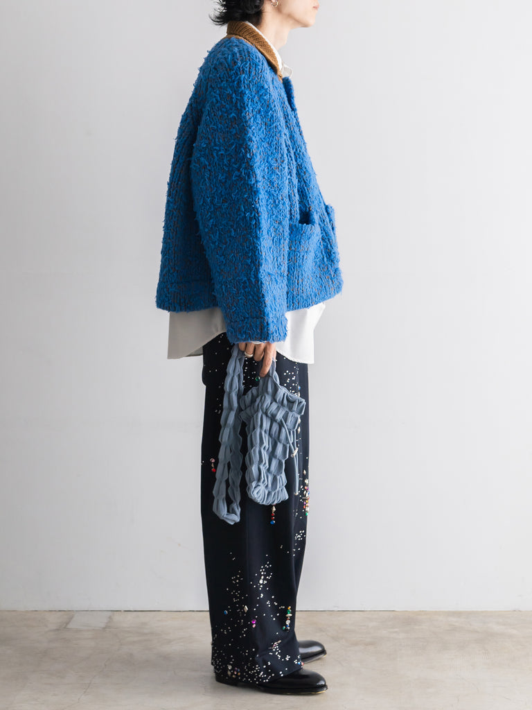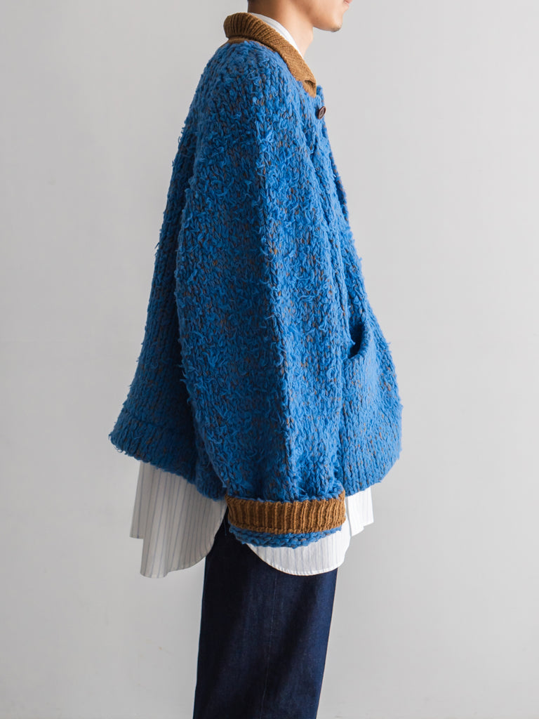 別日にいつもお世話になっている糸やさんから独特の雰囲気の糸を見せていただき、この二つを混ぜたら面白いのでは?と思いこのジャケットを作りました。