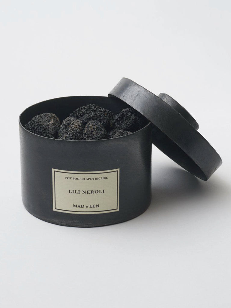 ポプリの香りは世界各地から厳選された花や木、ハーブやスパイスから抽出した天然素材を、ラバロック(溶岩石)に染み込ませるという、昔ながらの手法を用いています。大量生産はせず、アポセカリーのように注文が入ってからすべての工程をひとつひとつ手作業で生産します。