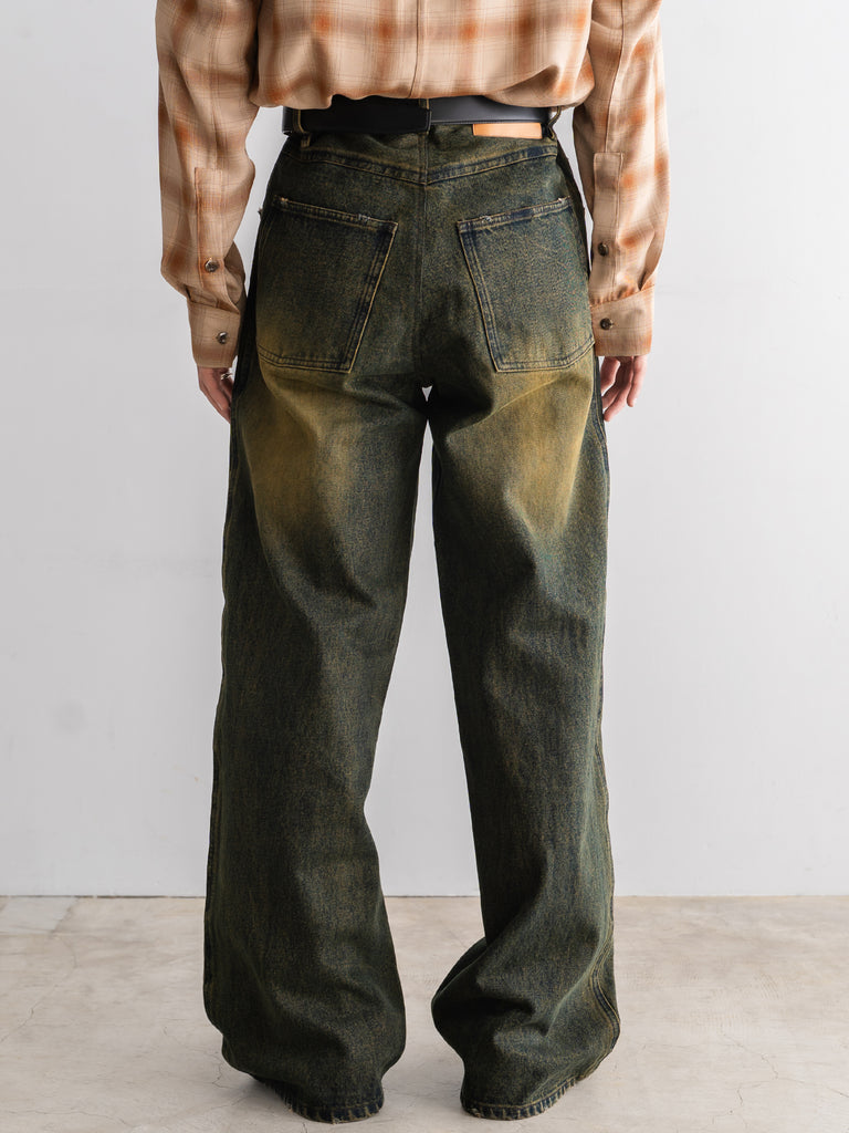 コントラストステッチがクラシックな5ポケットのディテールを際立たせ、ワイドレッグシルエットが都会的な印象を与えます。