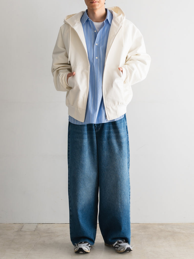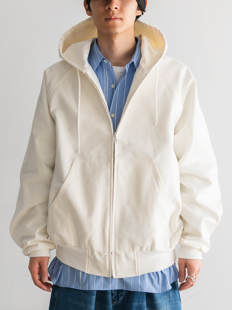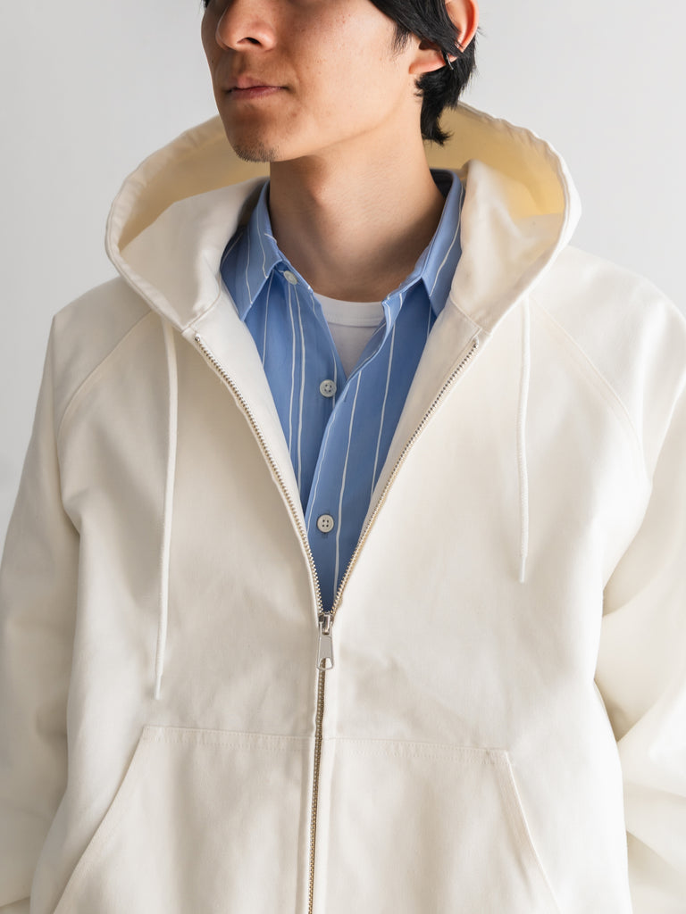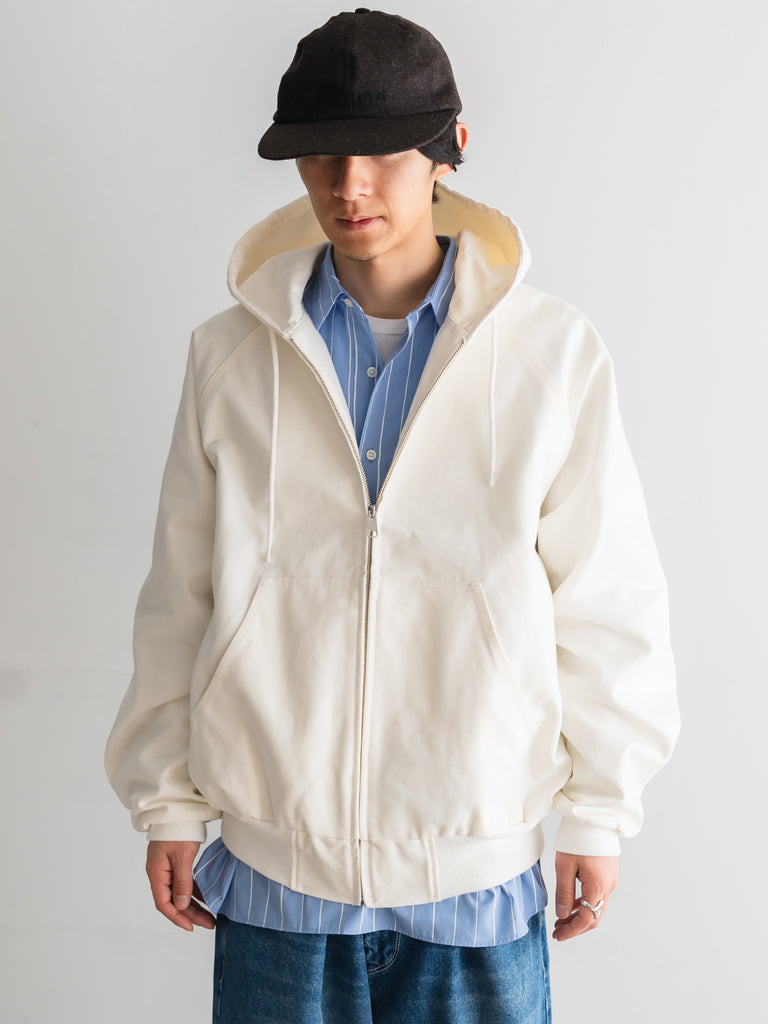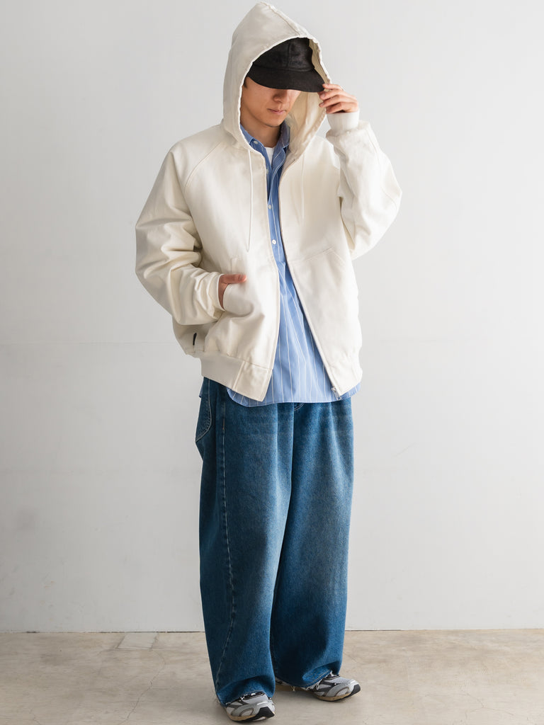 ワークジャケットでありながら、余計なディテールは取り除きクリーンなイメージに仕上げたオーバーサイズのダックフーディージャケット。