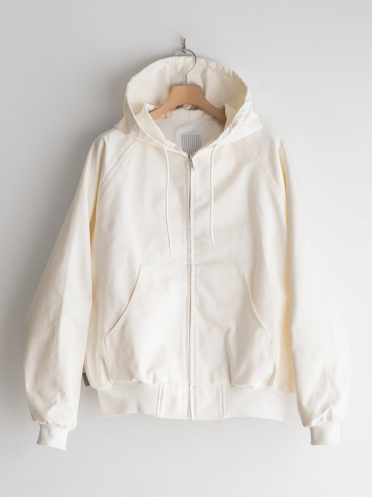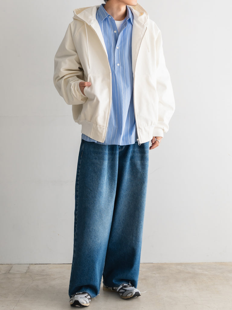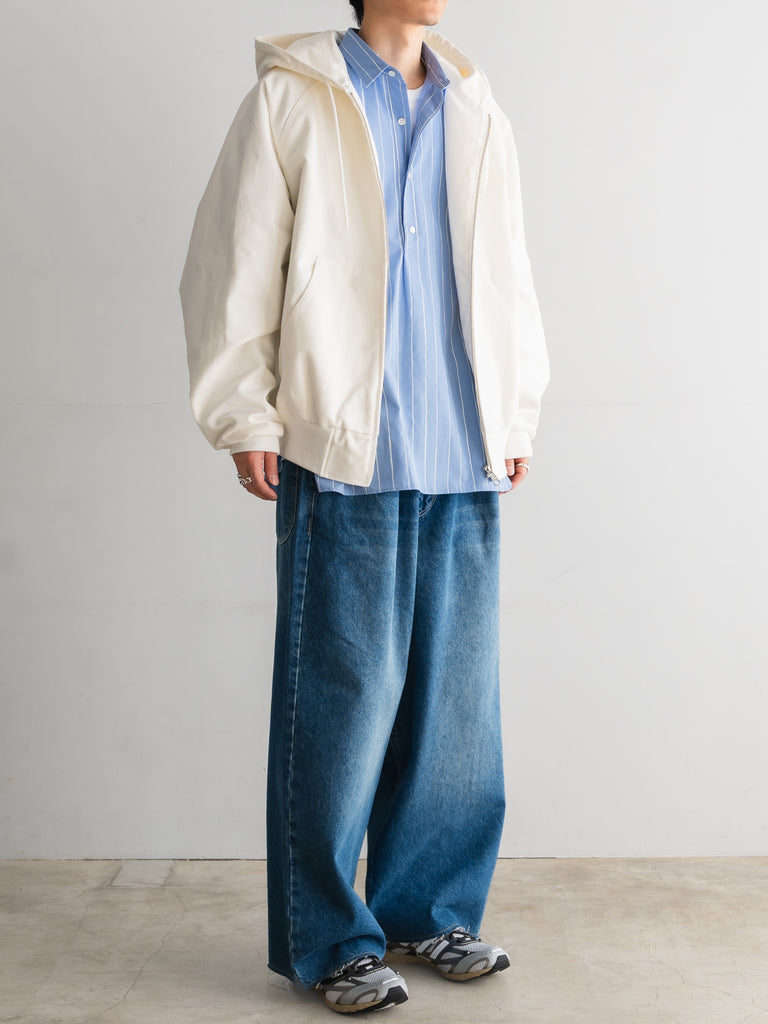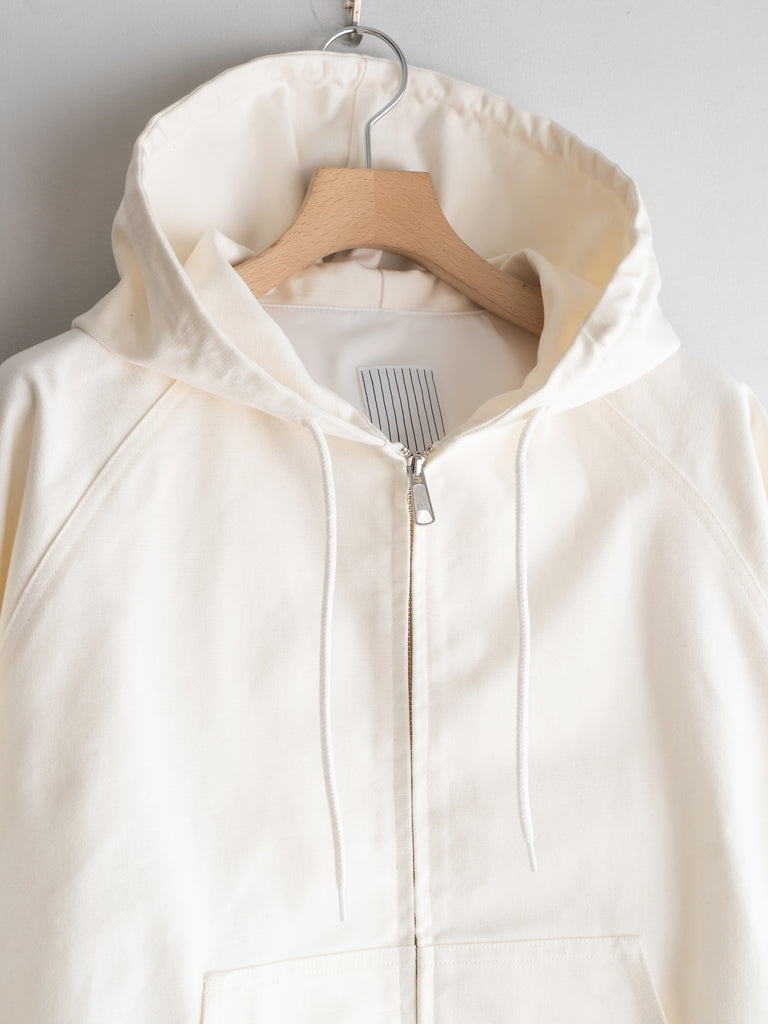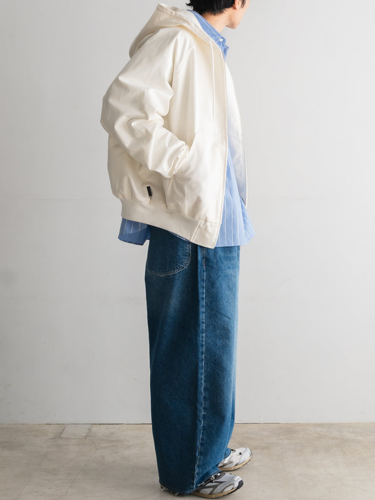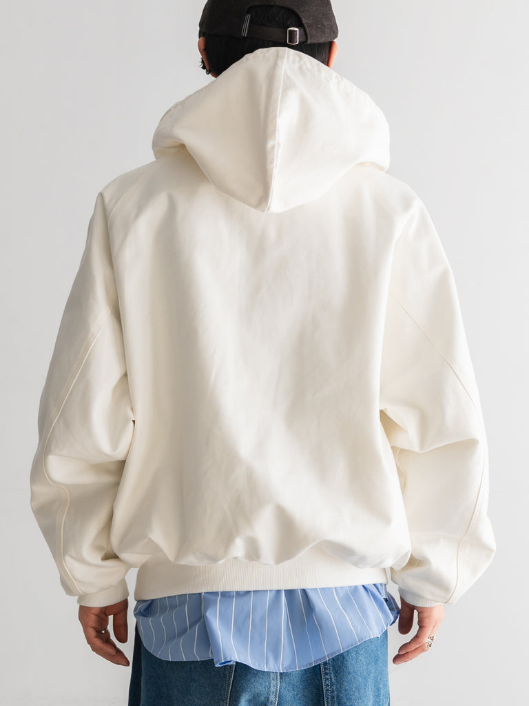 ワークジャケットでありながら、余計なディテールは取り除きクリーンなイメージに仕上げたオーバーサイズのダックフーディージャケット。