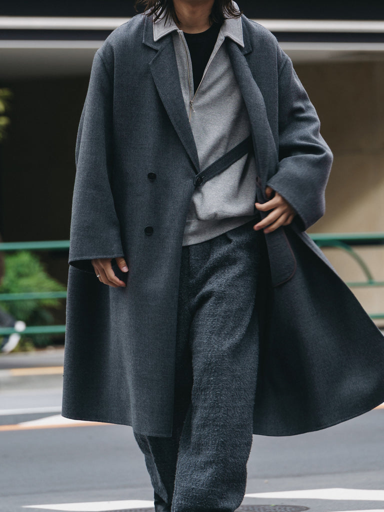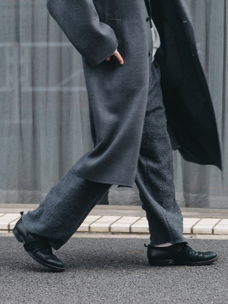 フリンジの糸や、ノットヤーン、丸胴のチューブ状の糸など、自分の理想とする5種類全てを今回のツイードに織り込み、あえて5種類の糸全てを1色にすることで、無地面の中に奥行きと表情を込めて作って頂きました。
