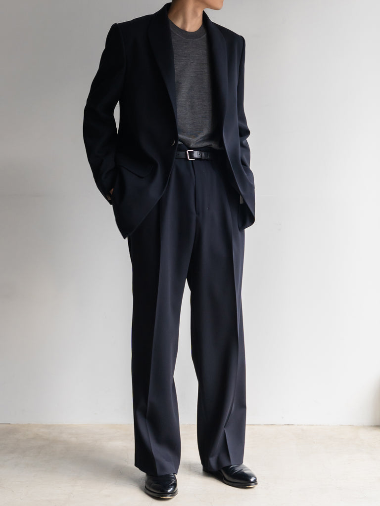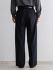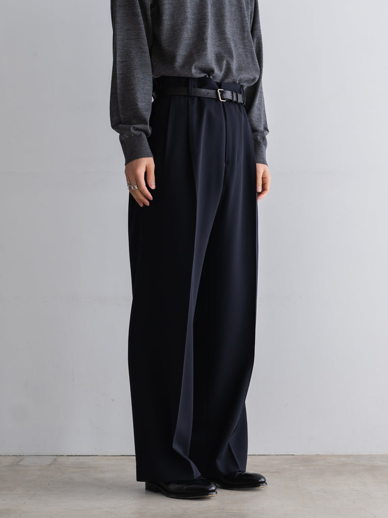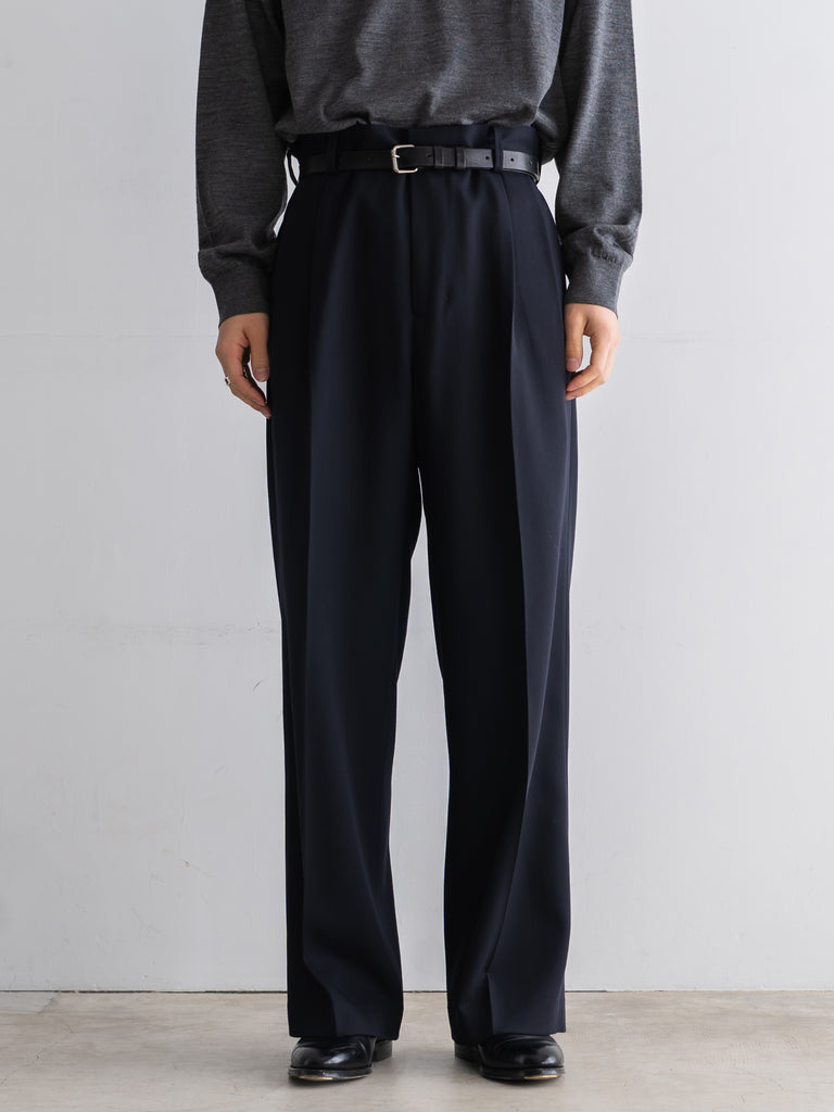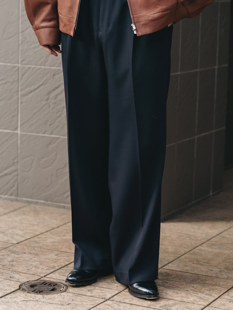 朱子織のウール素材を使用した、前裏付きツータックワイドトラウザーズ。
