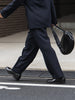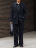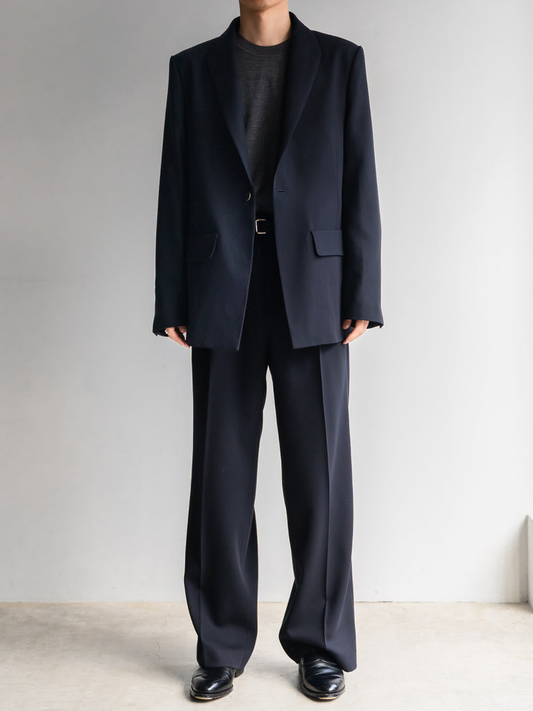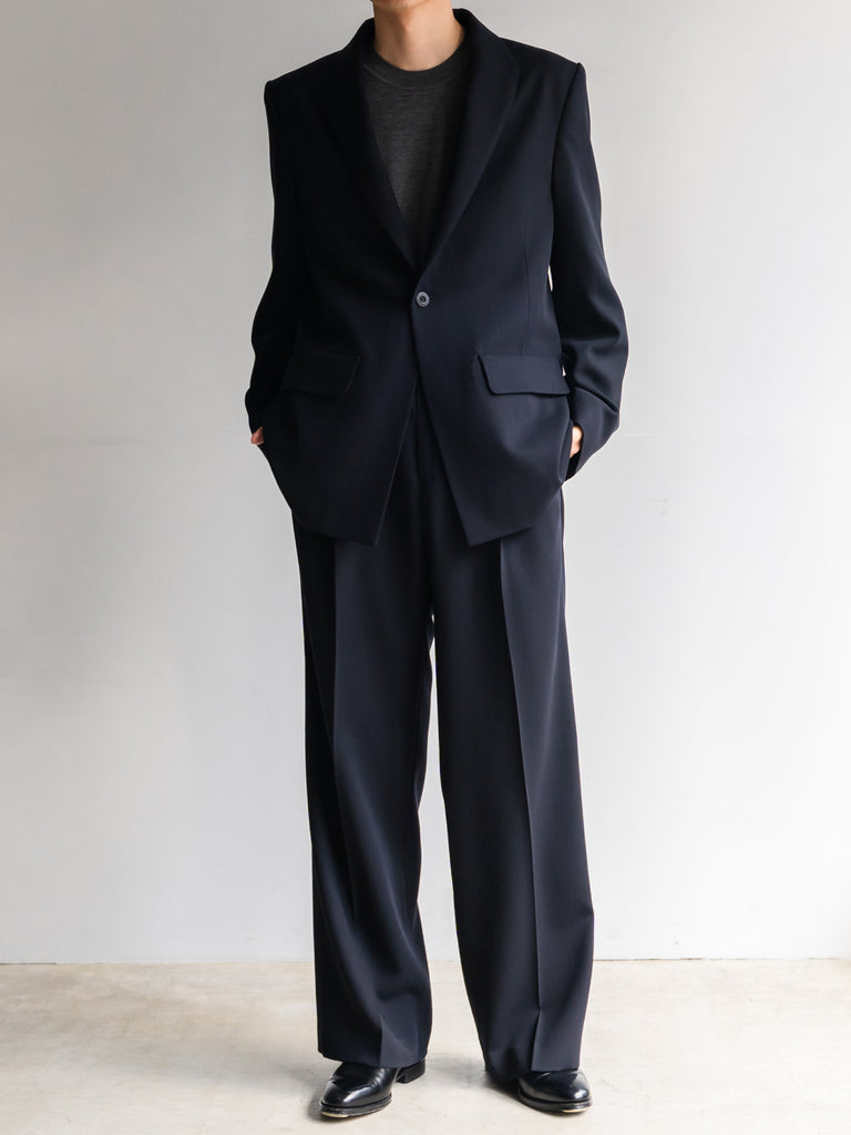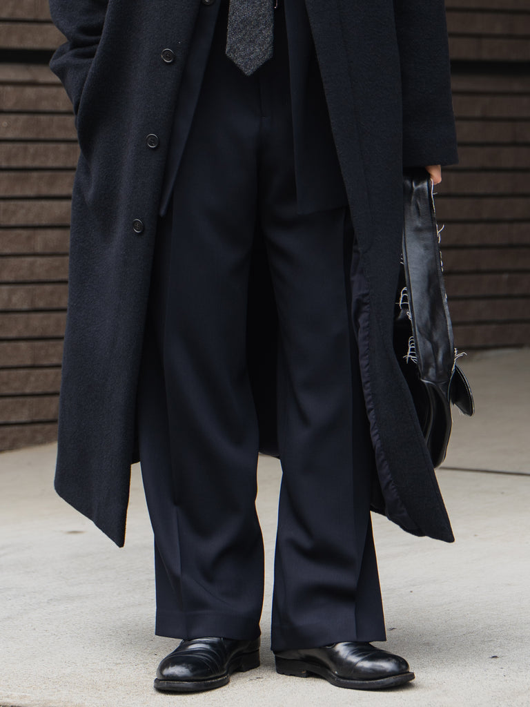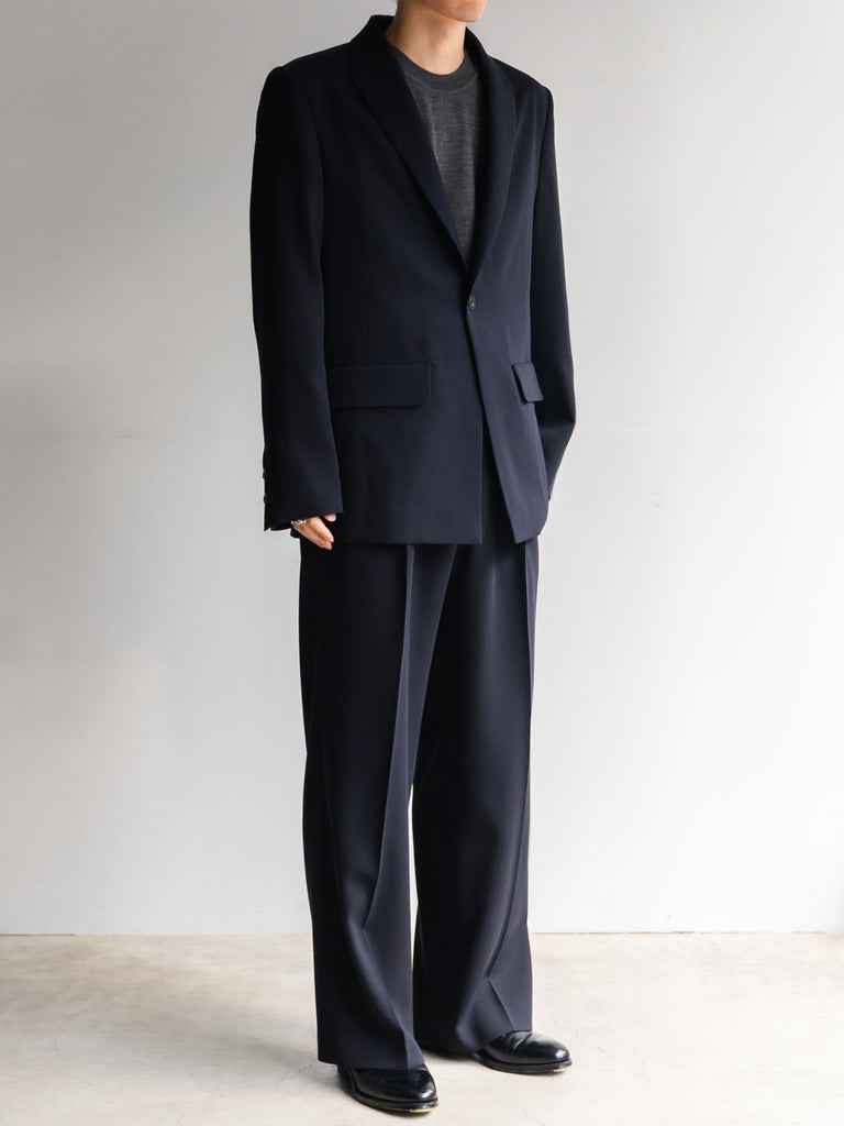 朱子織のウール素材を使用した、前裏付きツータックワイドトラウザーズ。