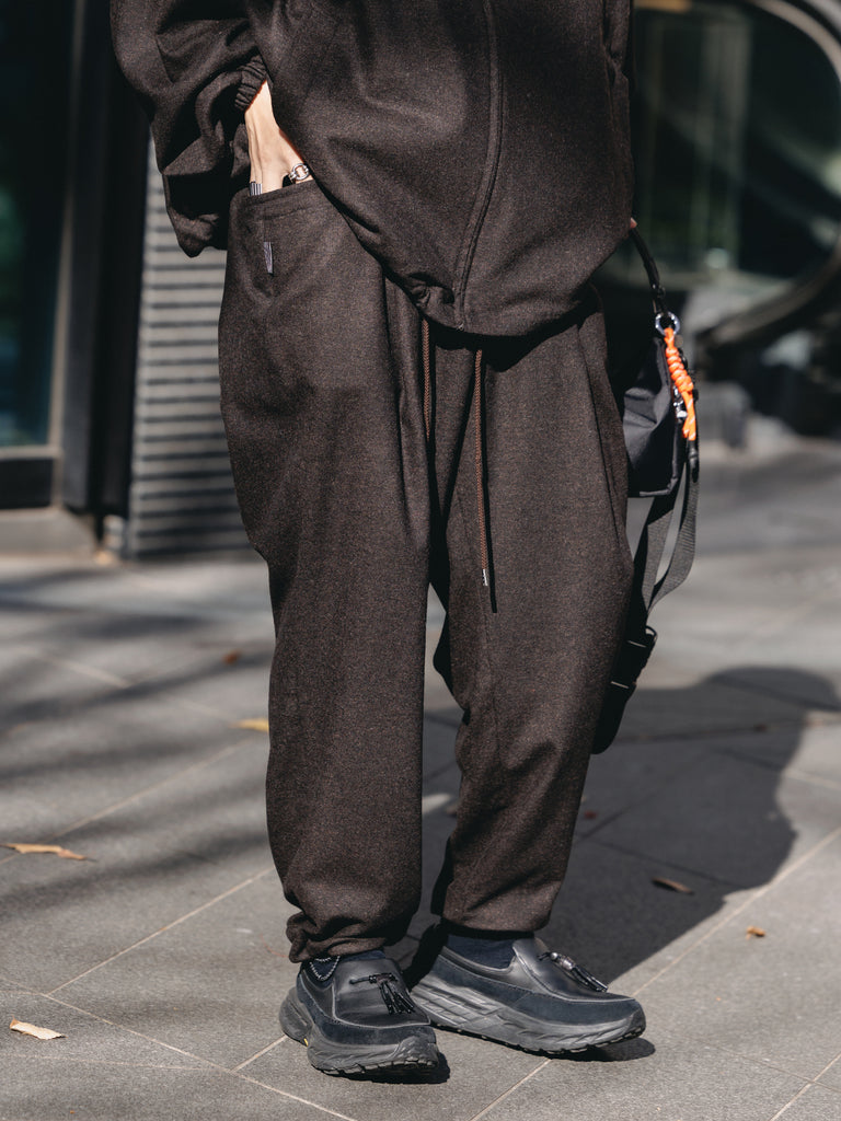 素材にはジャケットと同じ、ウール・ポリエステル・カシミヤ混紡のブラウンカラーの生地を使用。