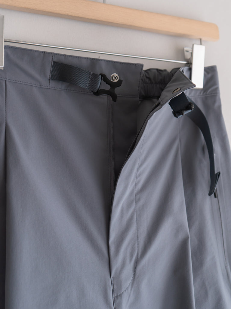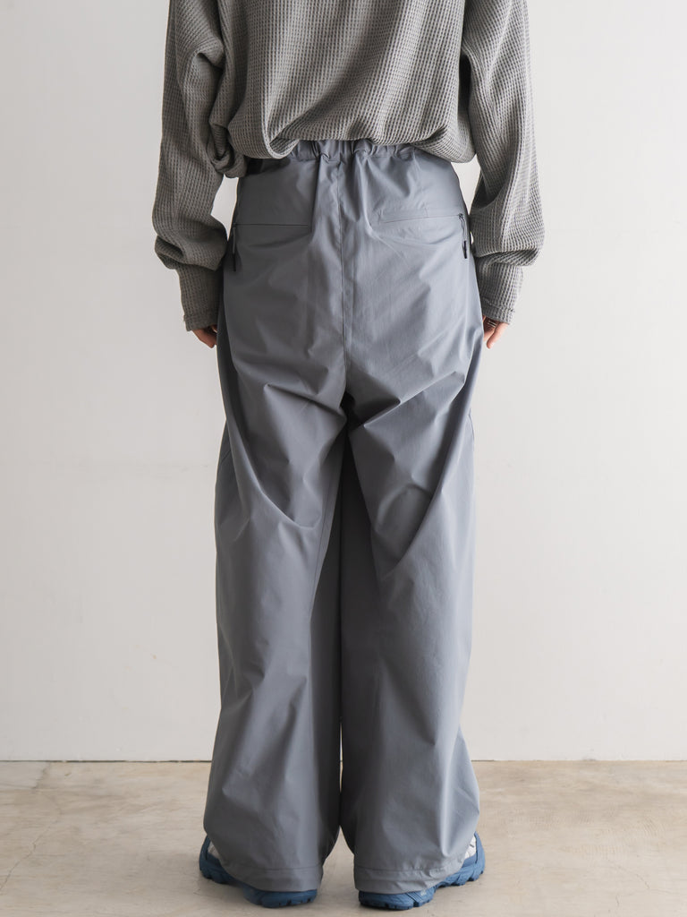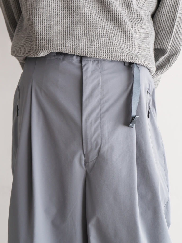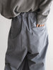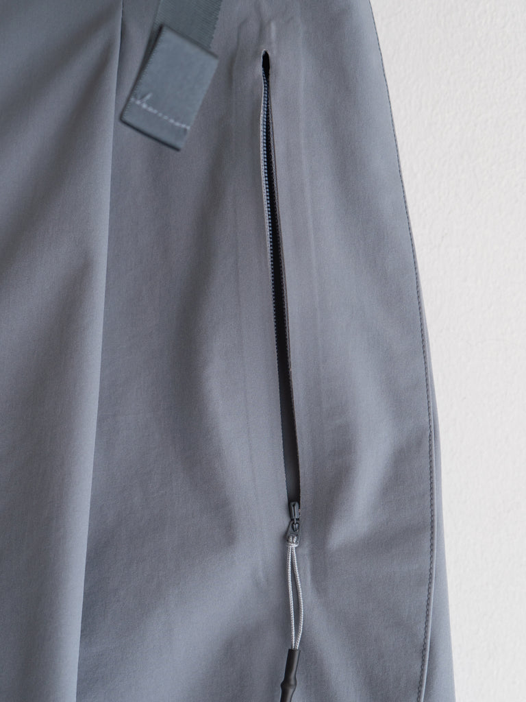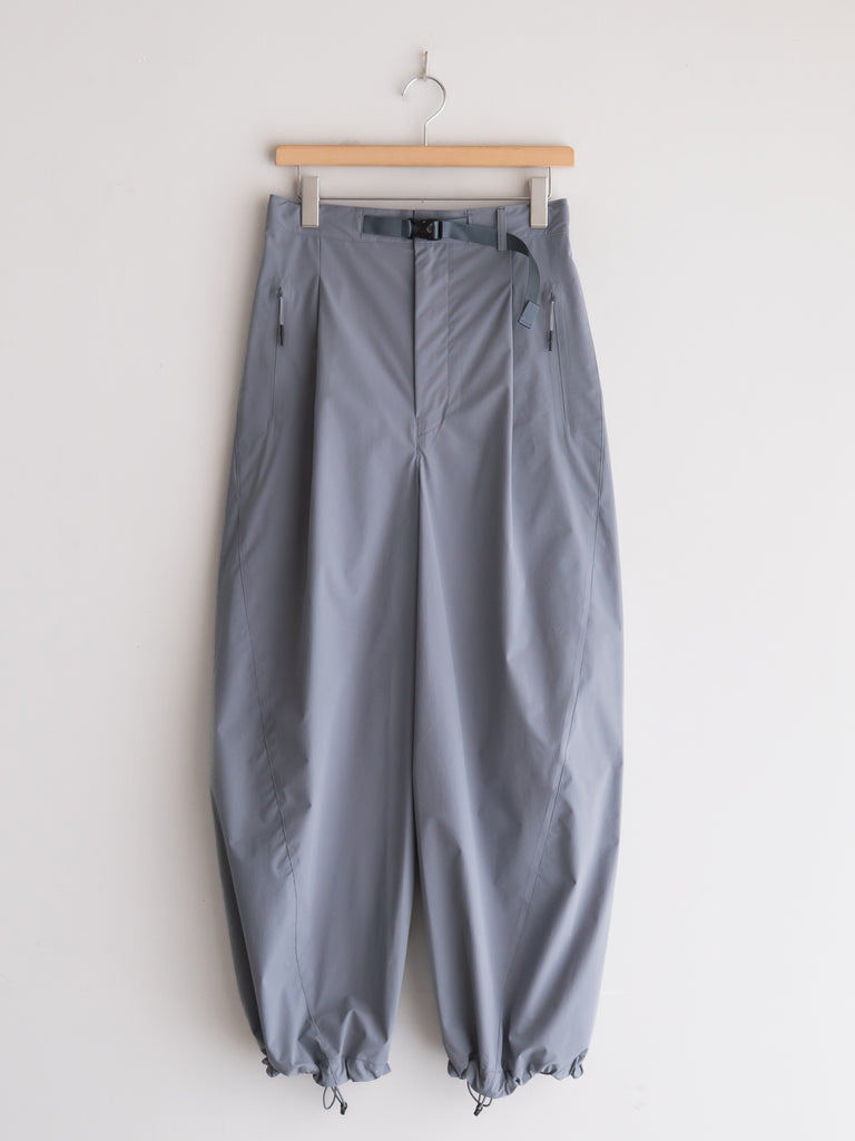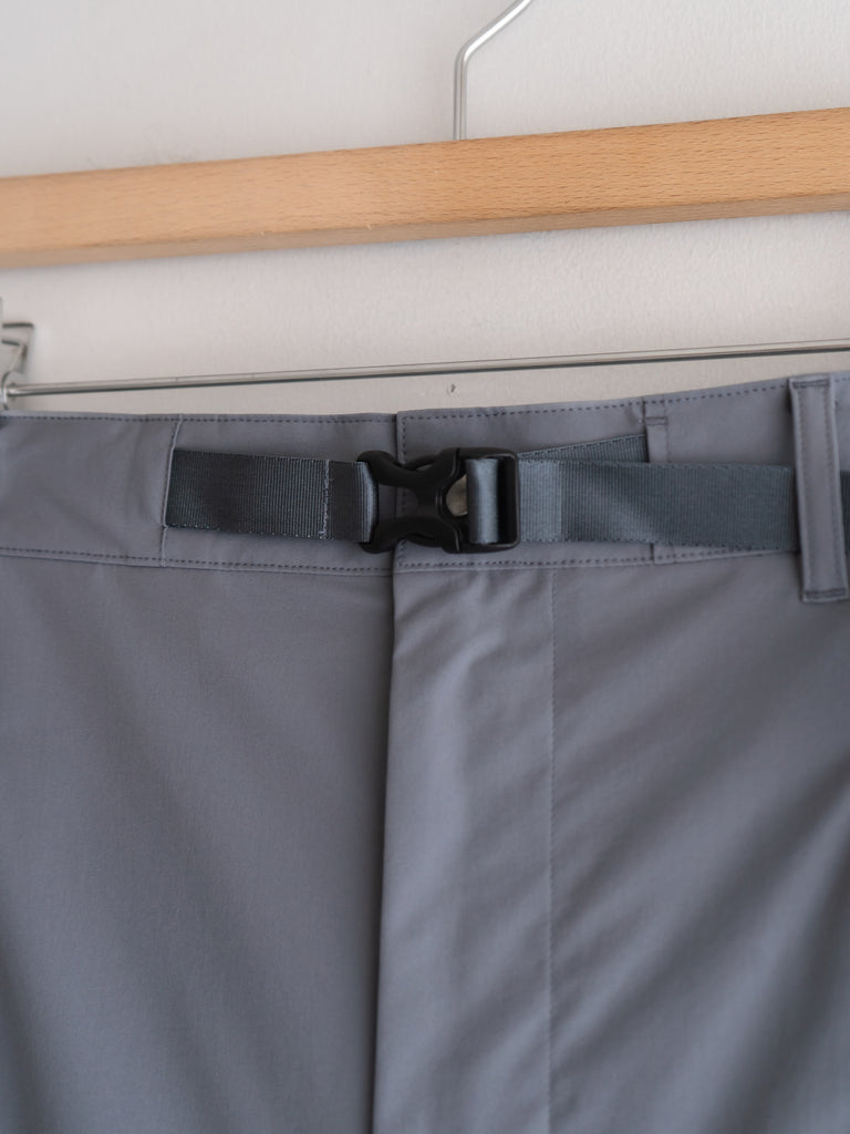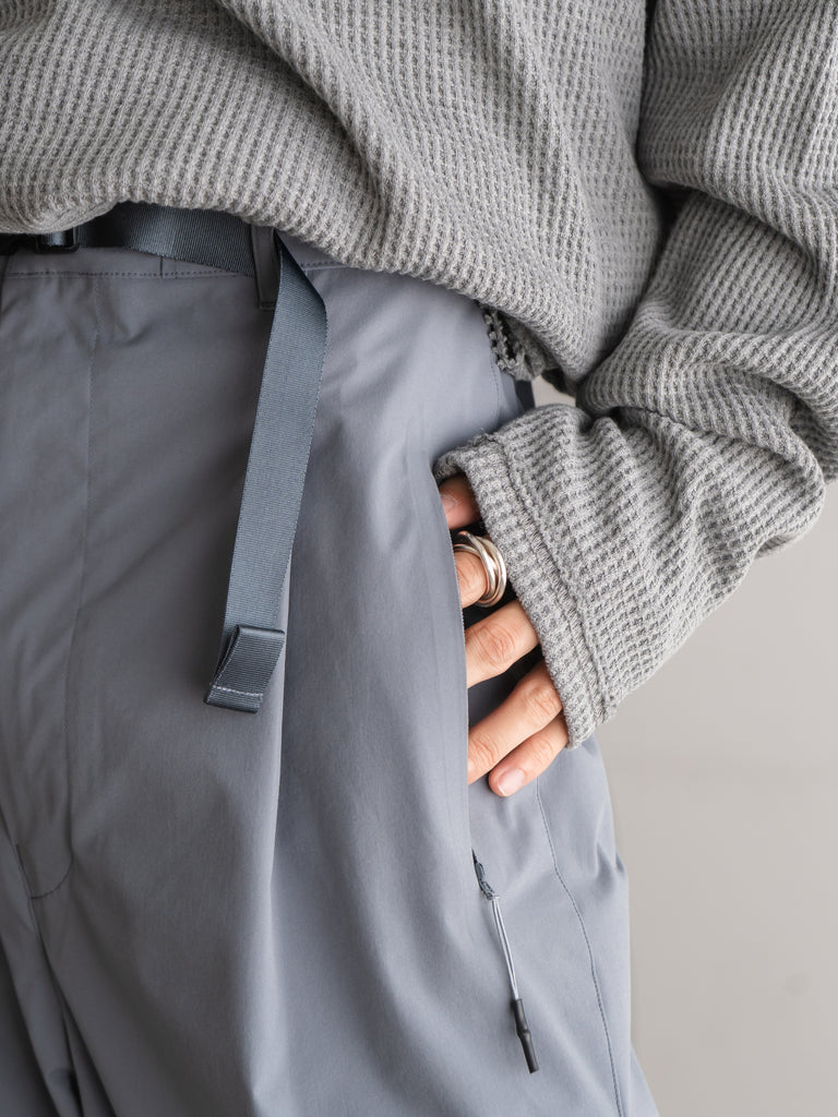 ウエストは付属のバックルベルト、裾口はゴムピンドルにより、機能的にサイズ、シルエット調節が可能。ポケットの玉縁部分は圧着仕様に。