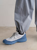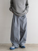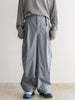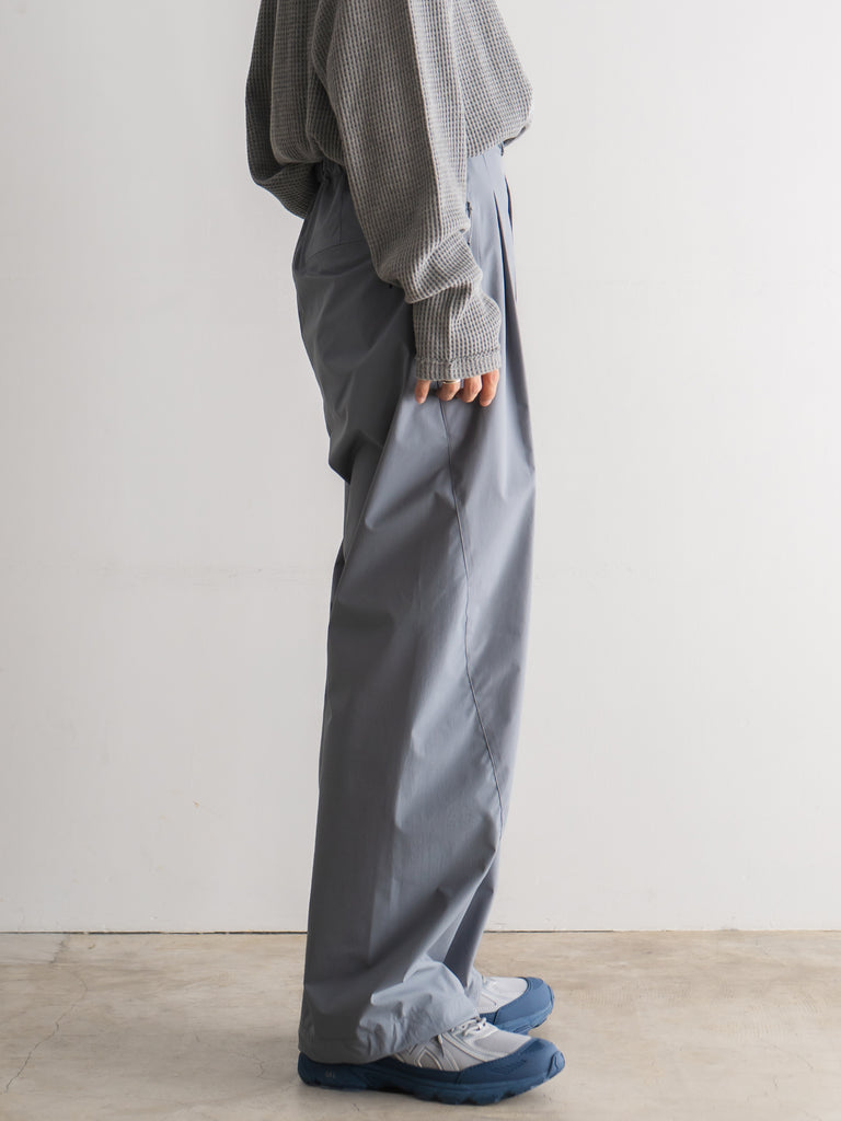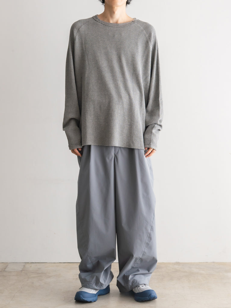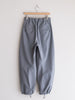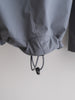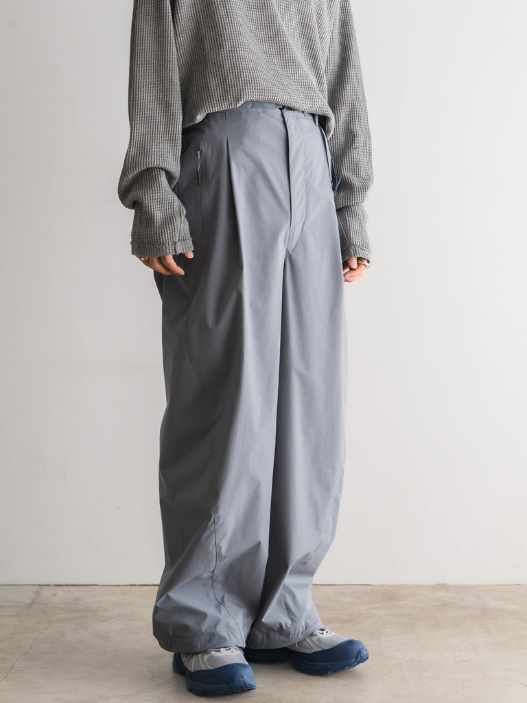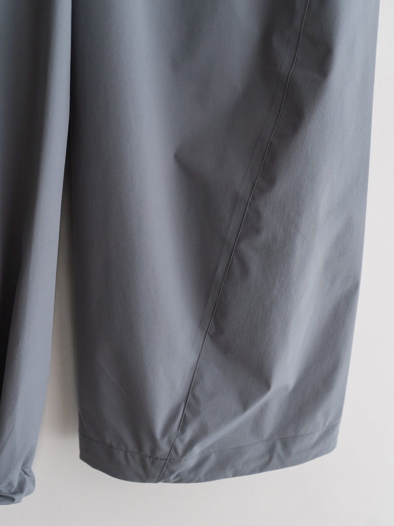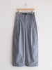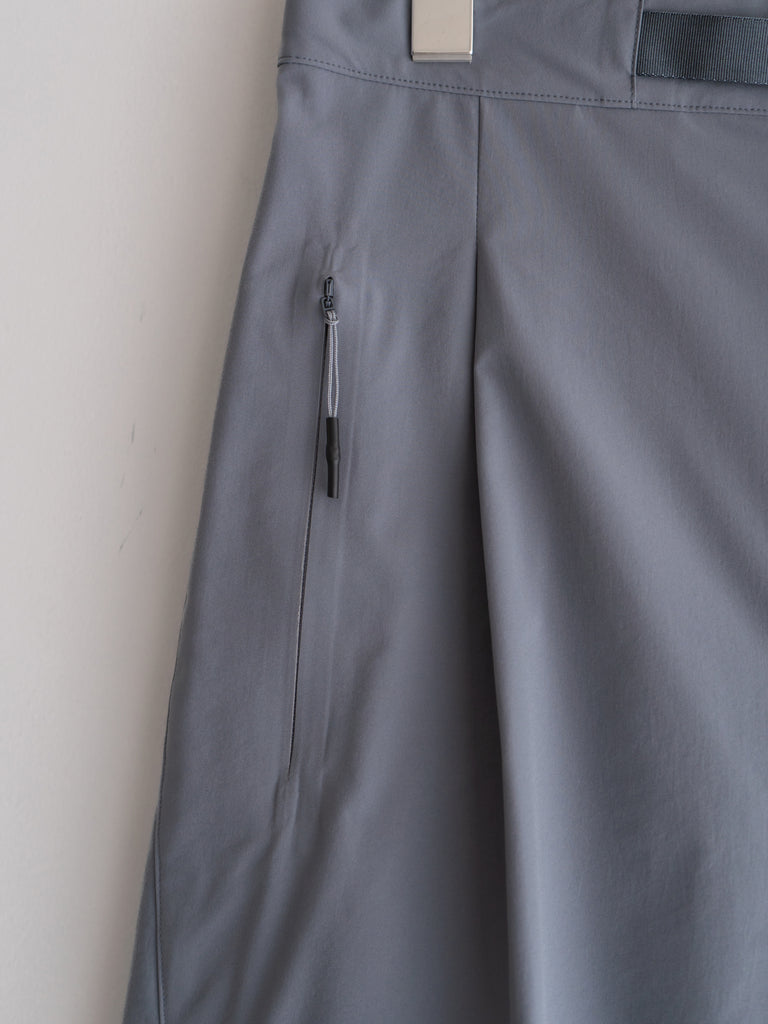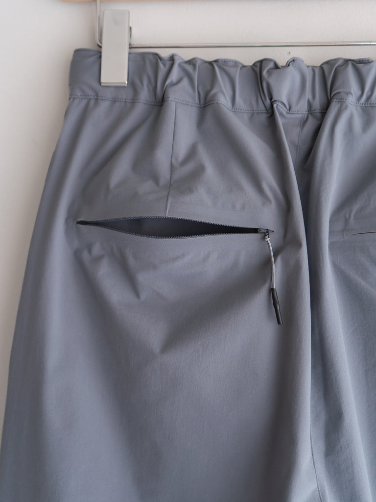 ウエストは付属のバックルベルト、裾口はゴムピンドルにより、機能的にサイズ、シルエット調節が可能。ポケットの玉縁部分は圧着仕様に。