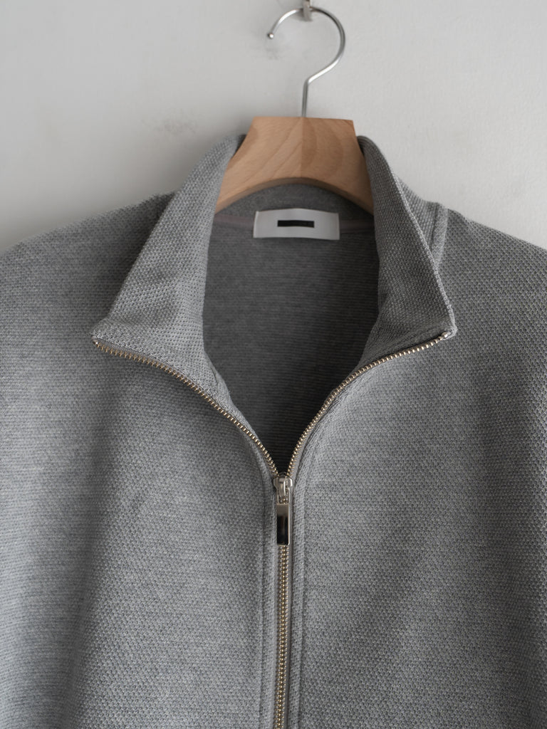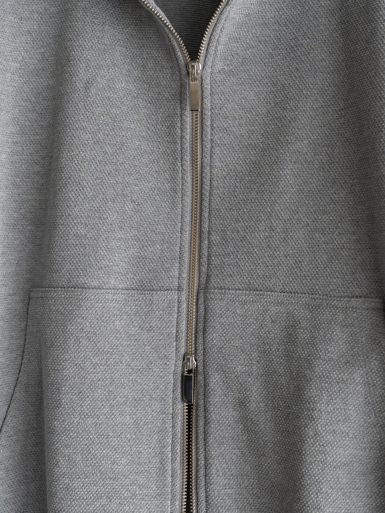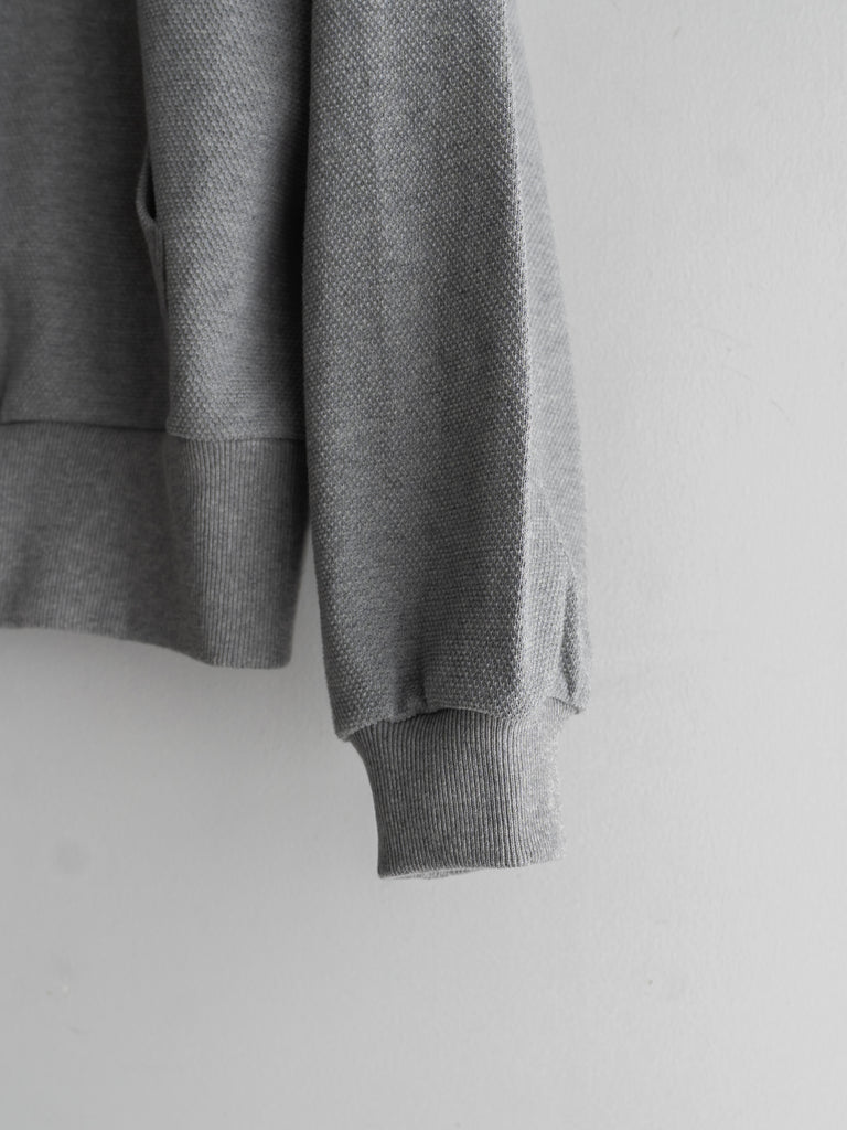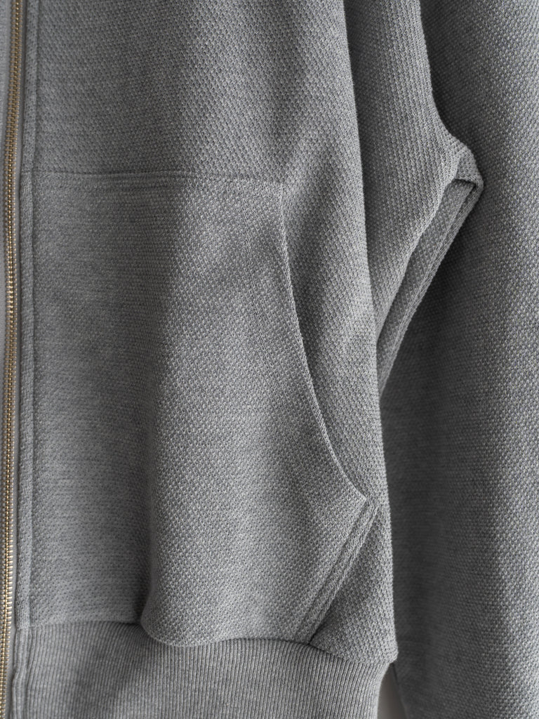カンガルーポケットを配したスタンドカラーデザインで、素材には鹿の子生地を使用している。