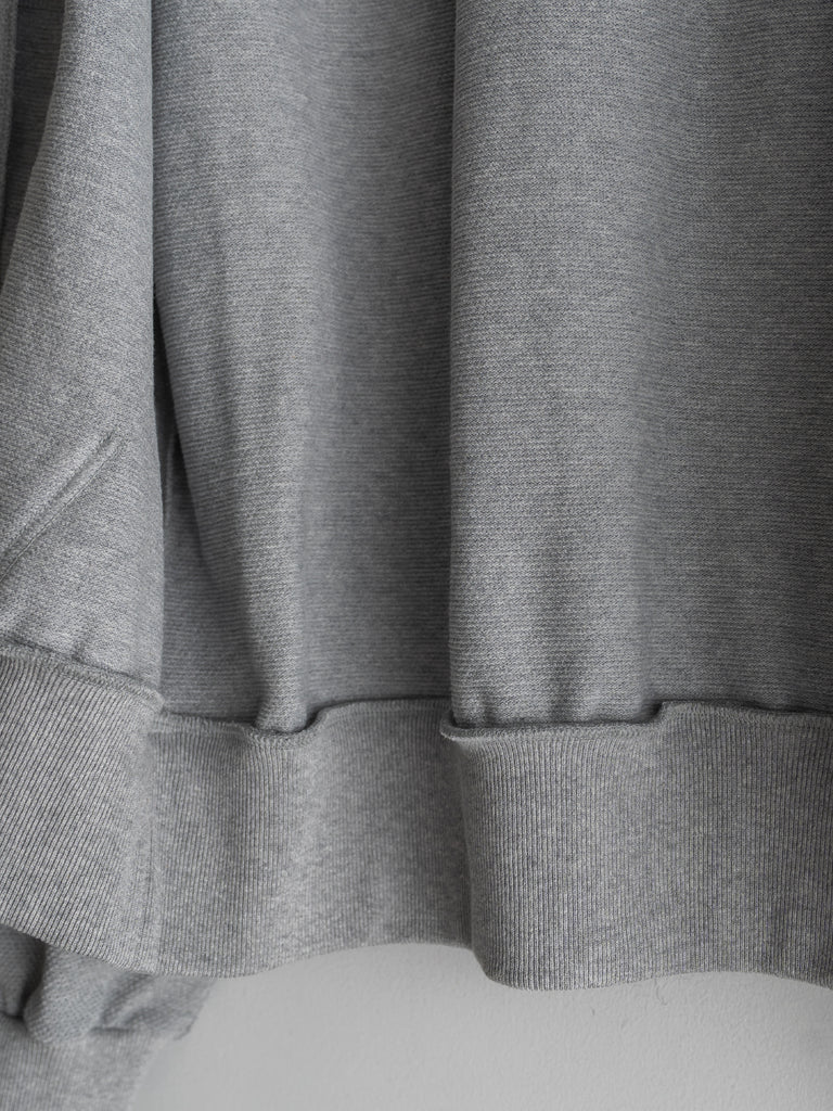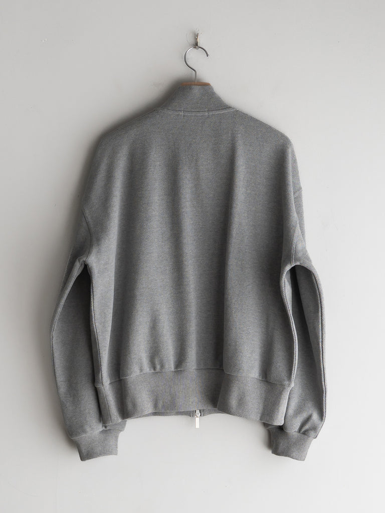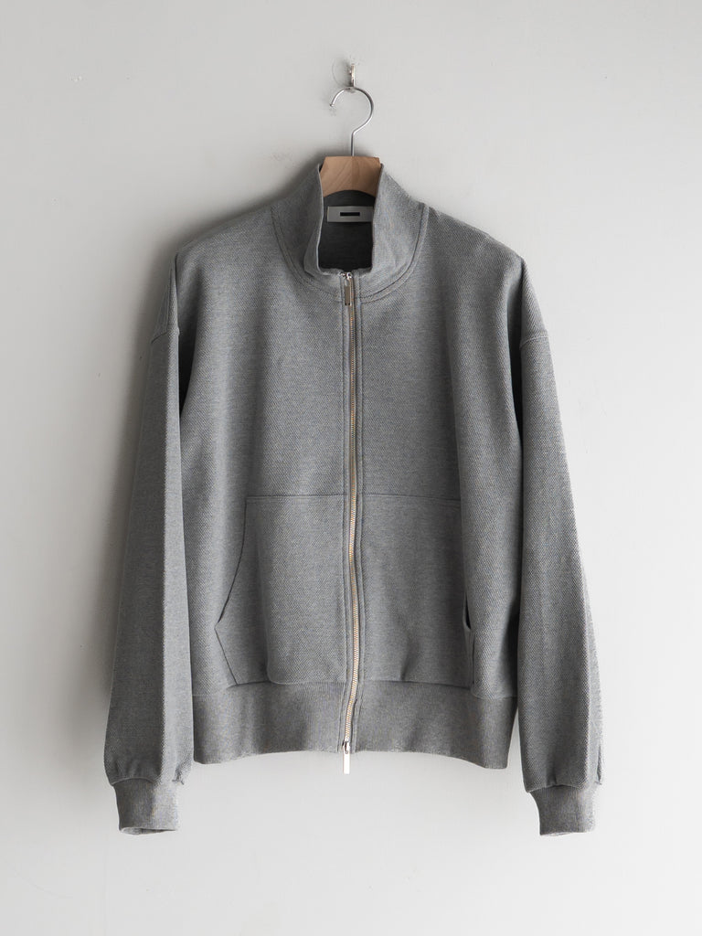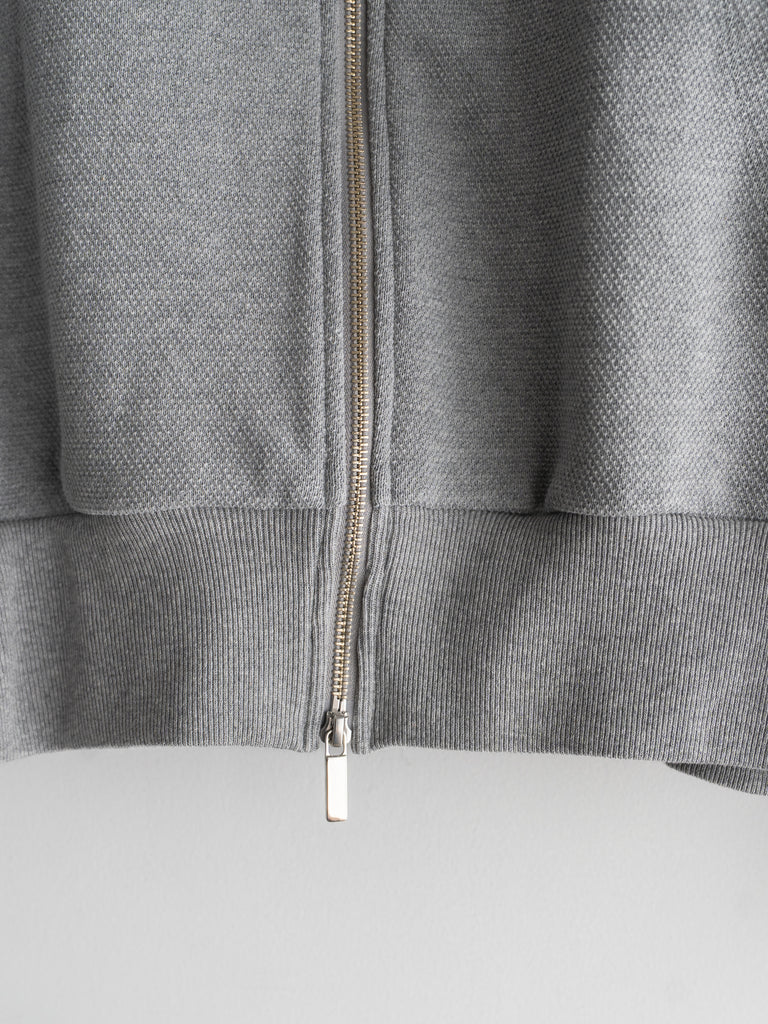 カンガルーポケットを配したスタンドカラーデザインで、素材には鹿の子生地を使用している。