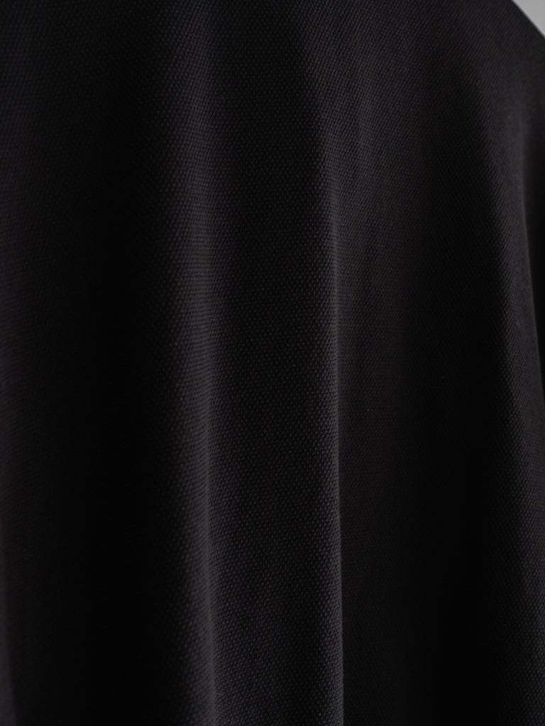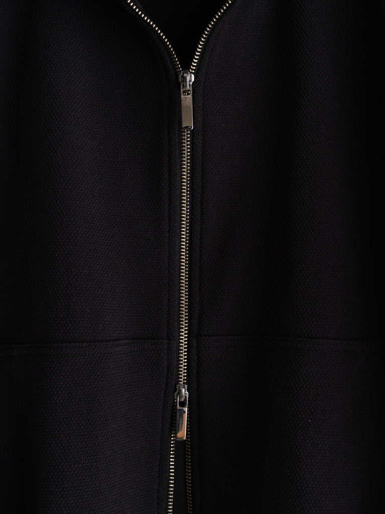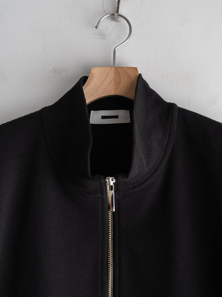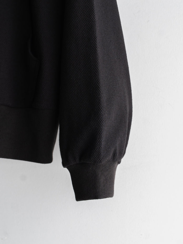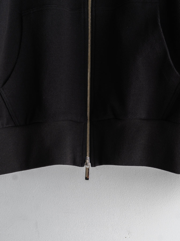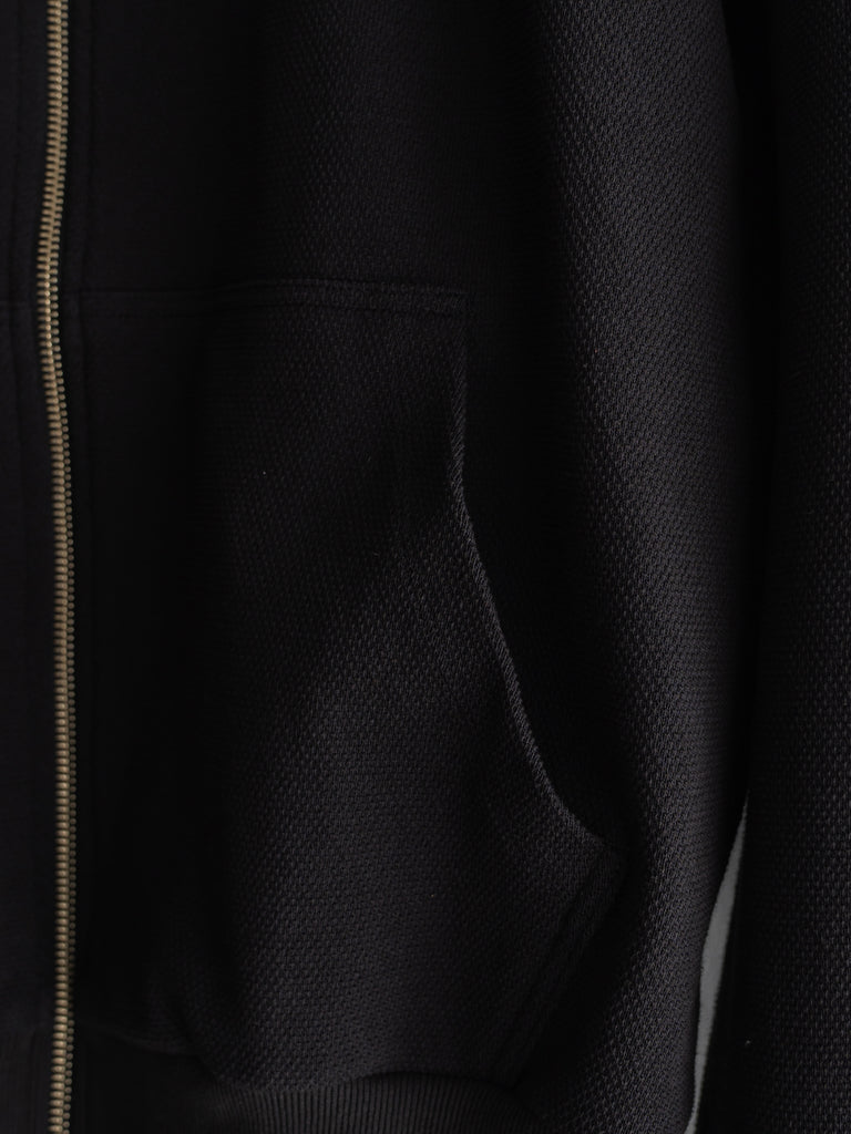カンガルーポケットを配したスタンドカラーデザインで、素材には鹿の子生地を使用している。