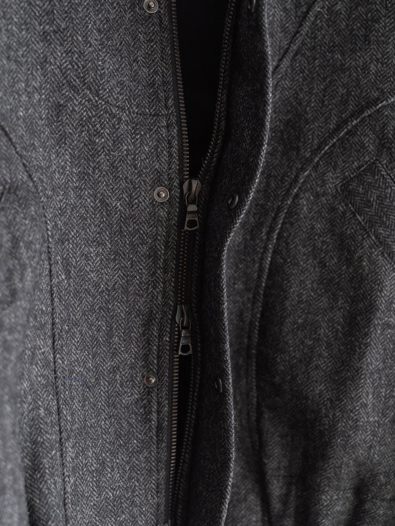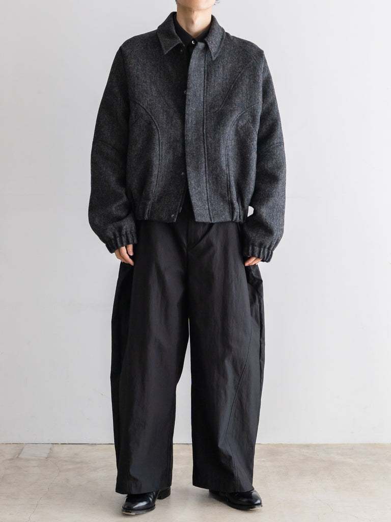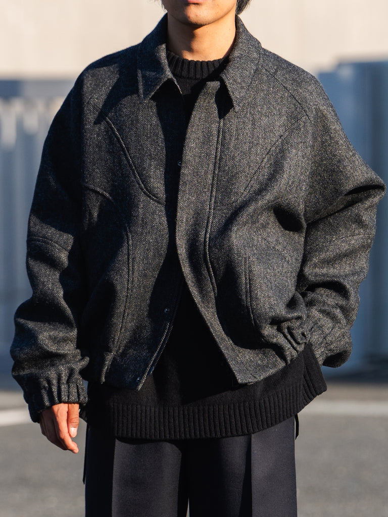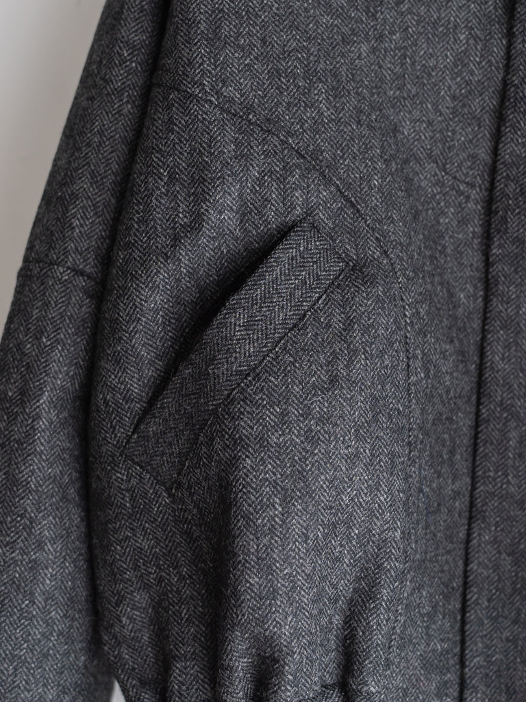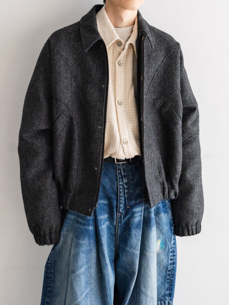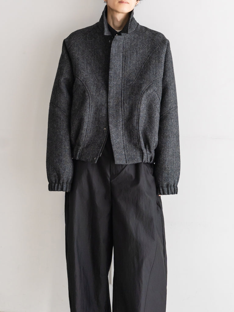 英国ツイードのヘリンボーンウールを使用した、カーブしたパネルが特徴的なクロップド丈ジャケット。