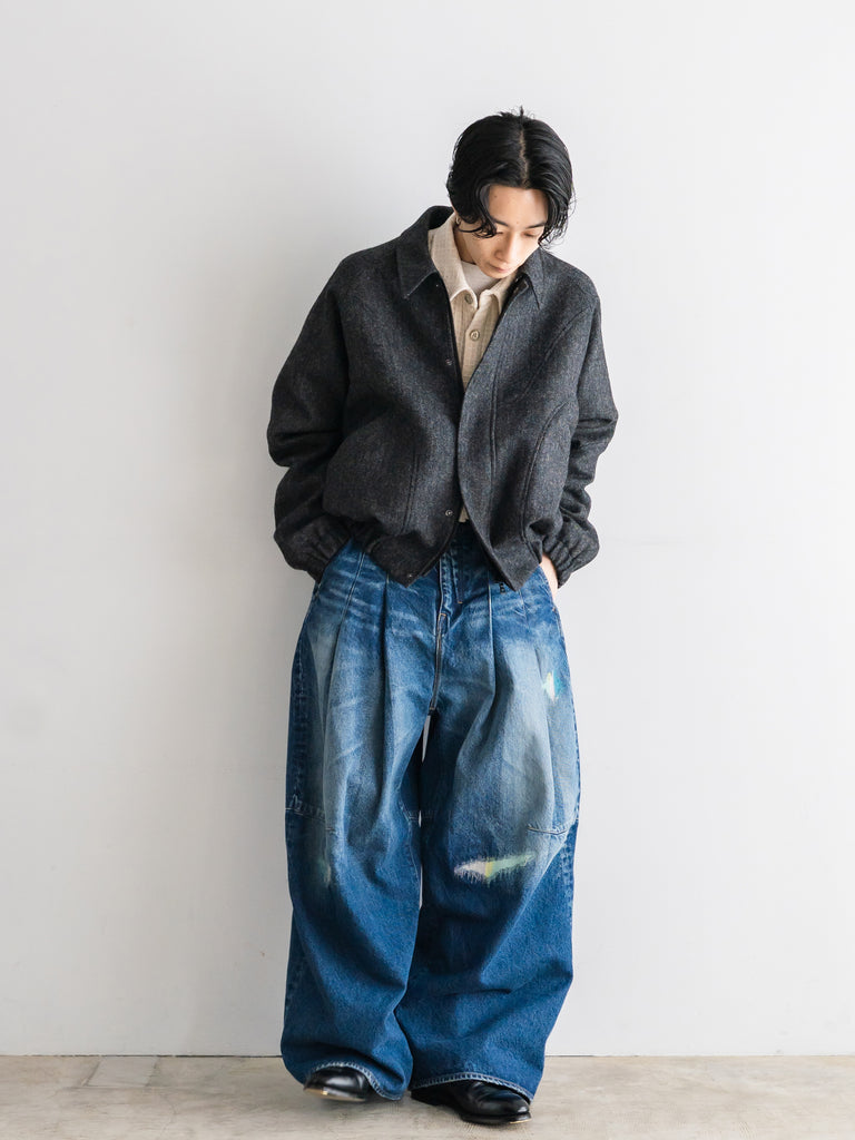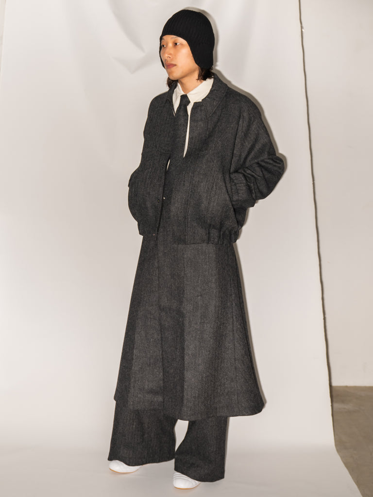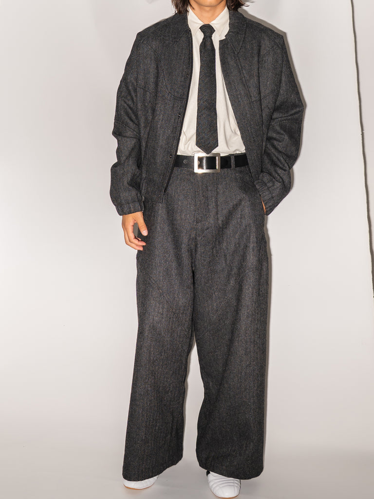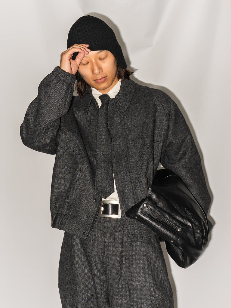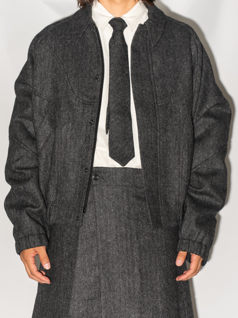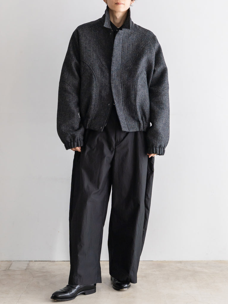 英国ツイードのヘリンボーンウールを使用した、カーブしたパネルが特徴的なクロップド丈ジャケット。