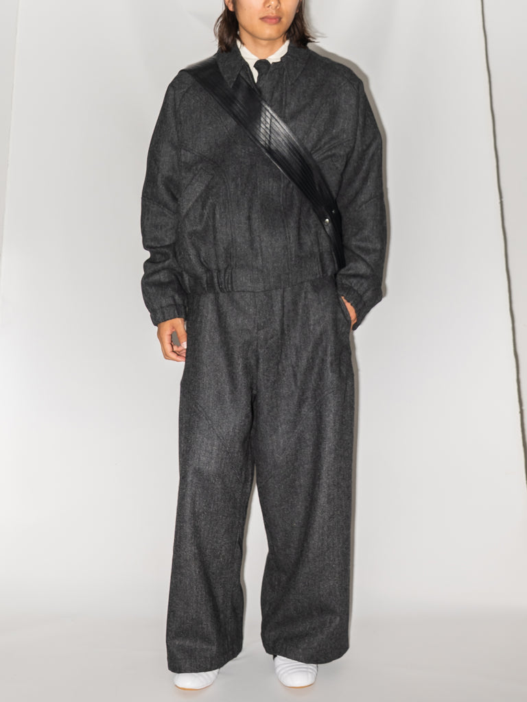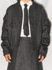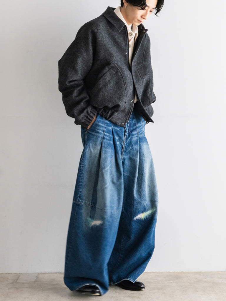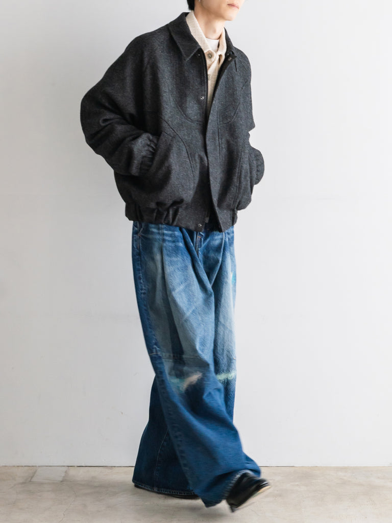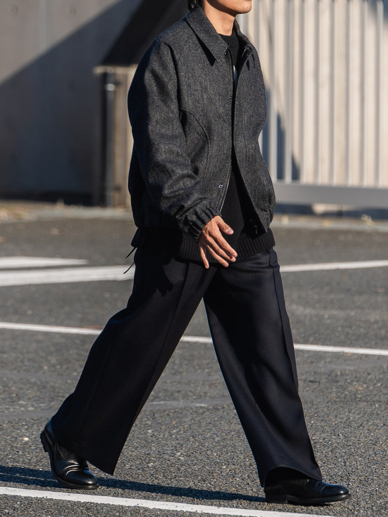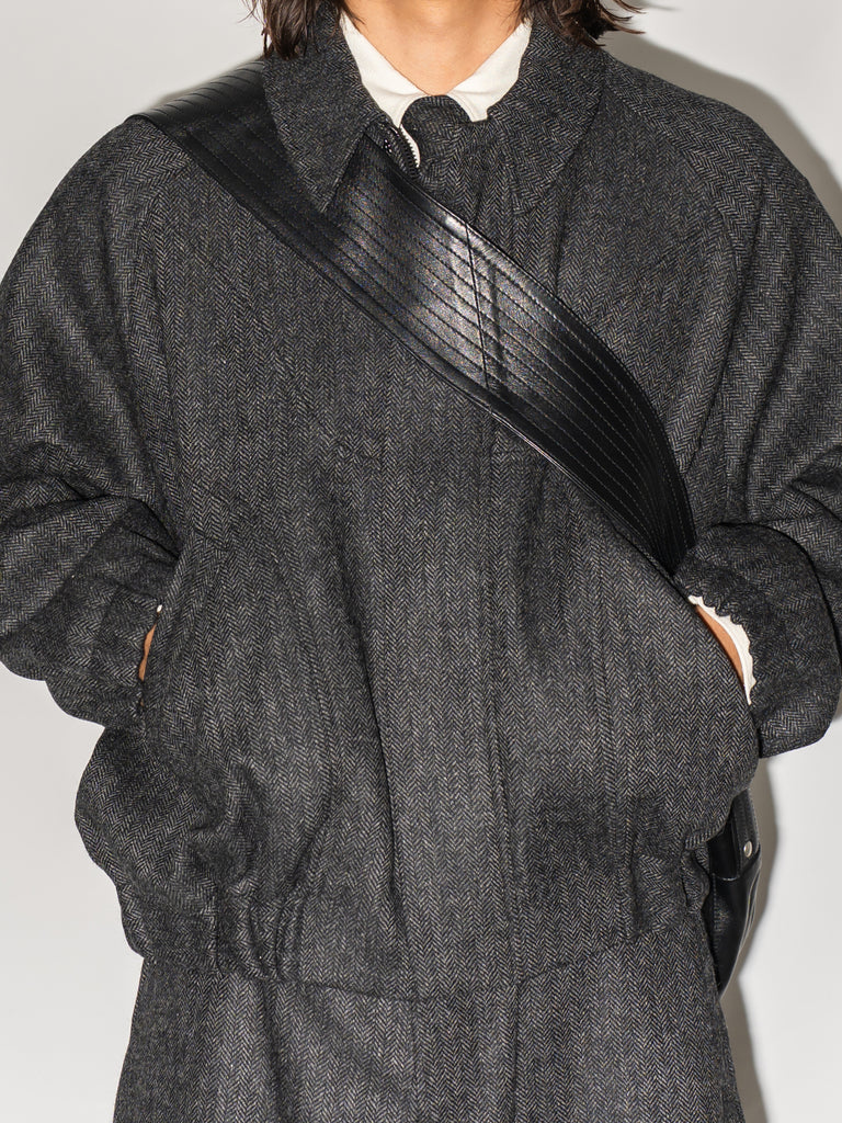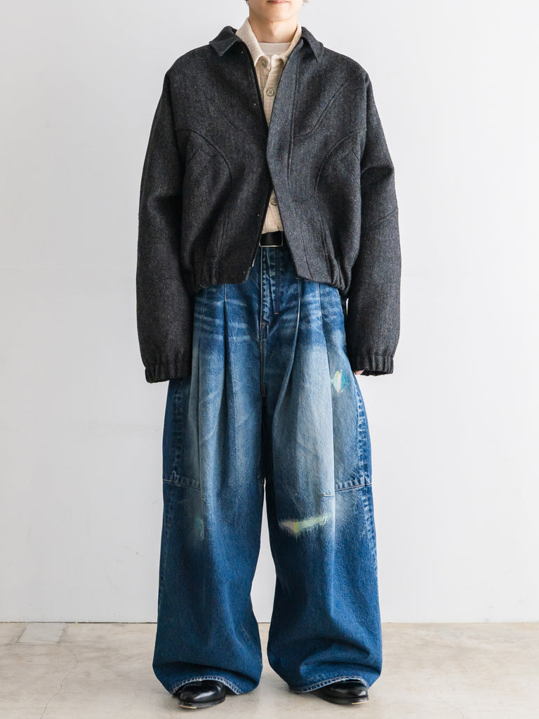 英国ツイードのヘリンボーンウールを使用した、カーブしたパネルが特徴的なクロップド丈ジャケット。