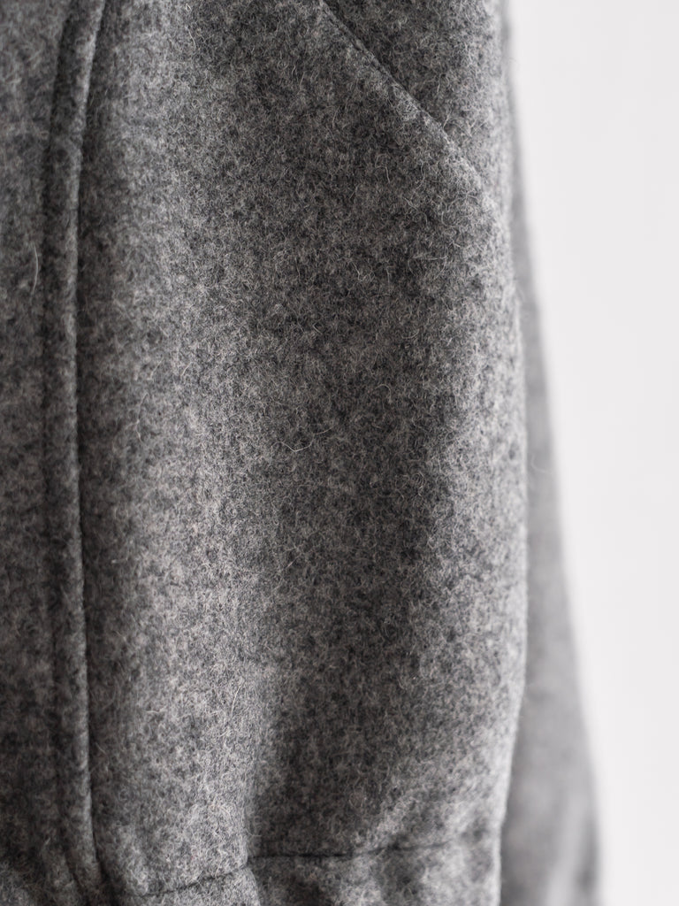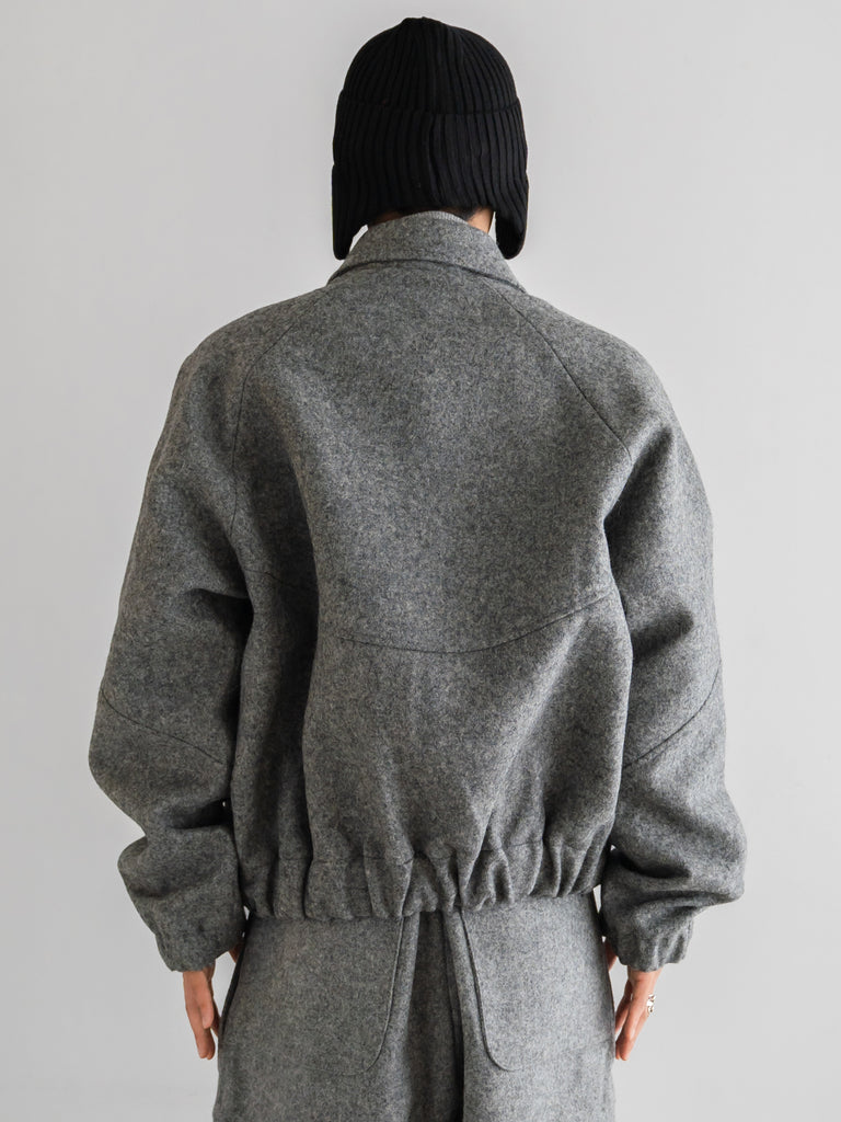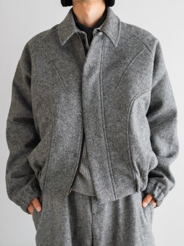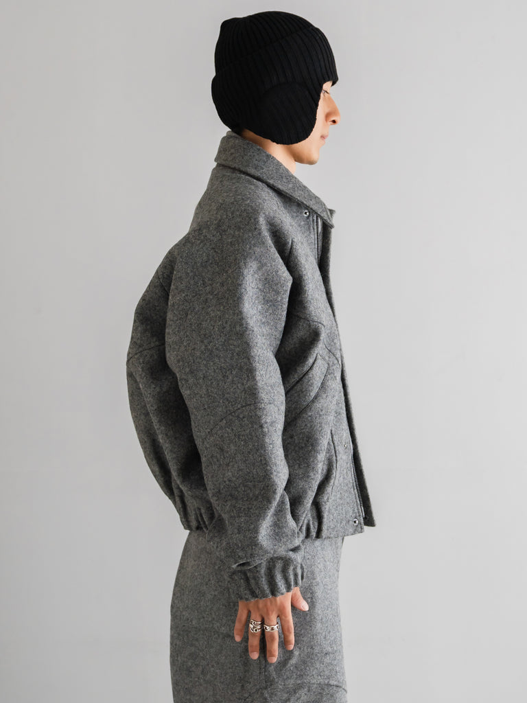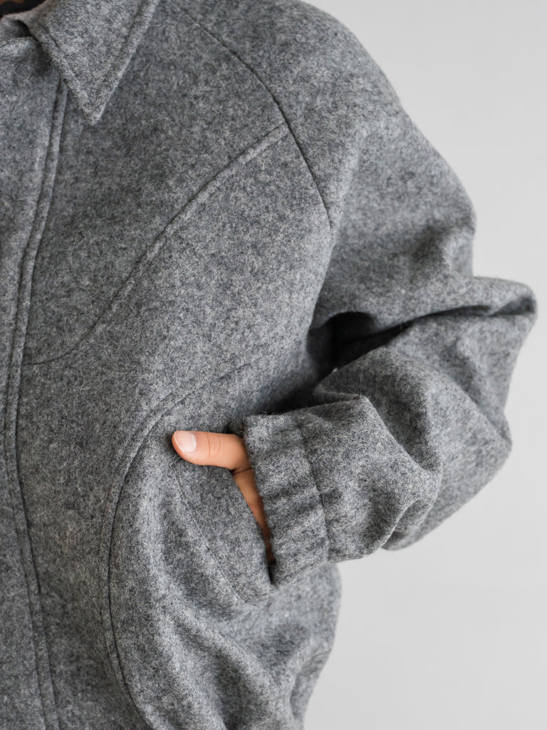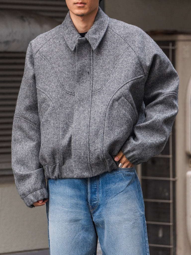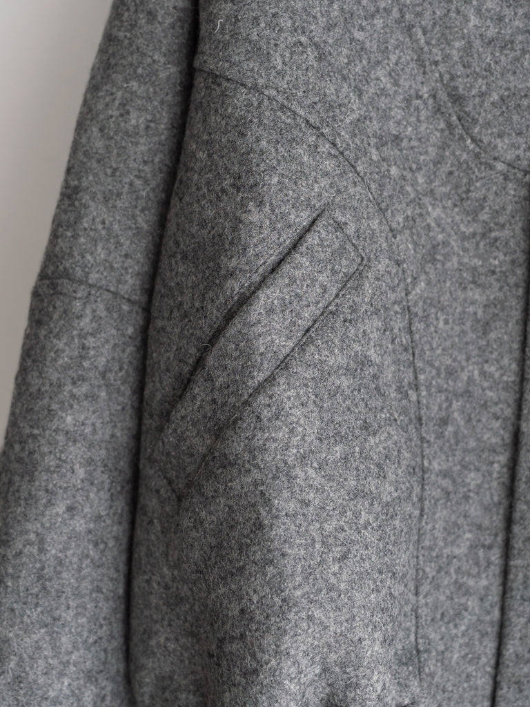 英国ツイードのヘリンボーンウールを使用した、カーブしたパネルが特徴的なクロップド丈ジャケット。