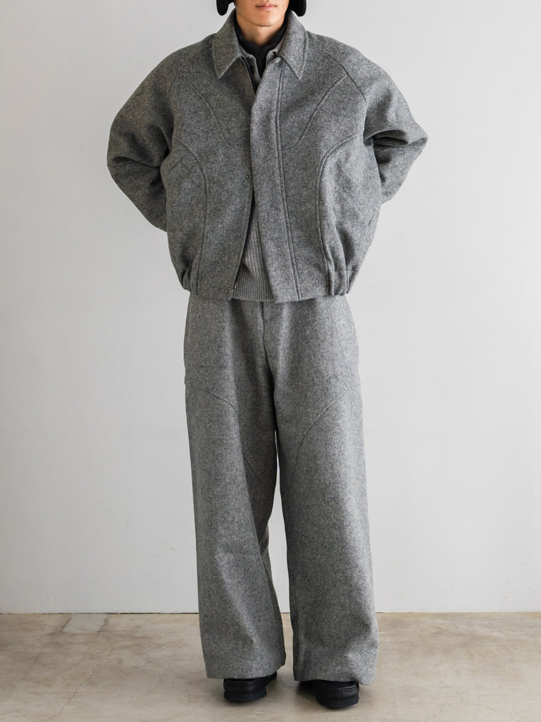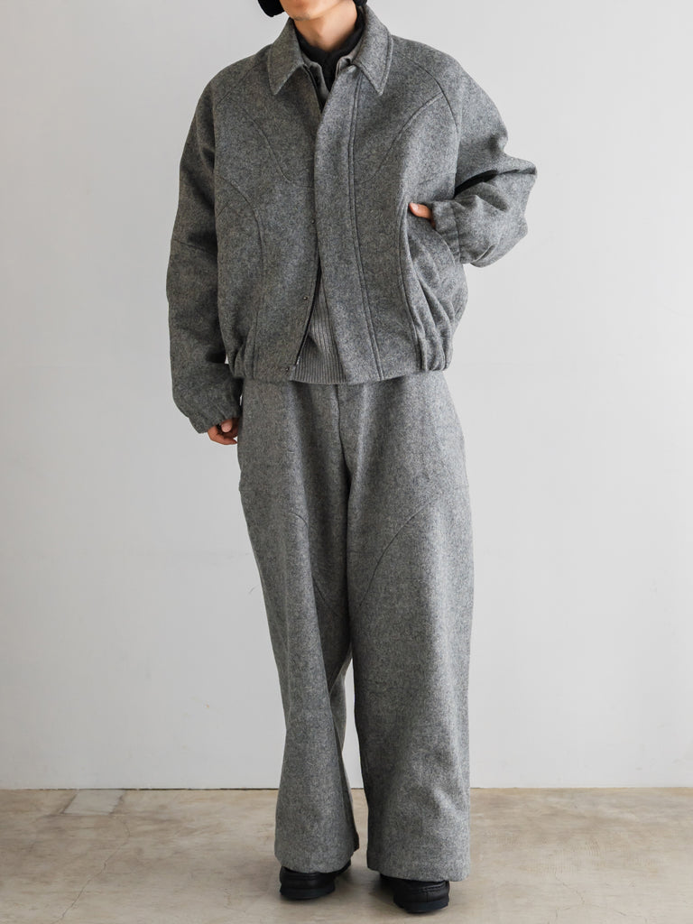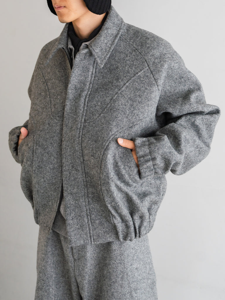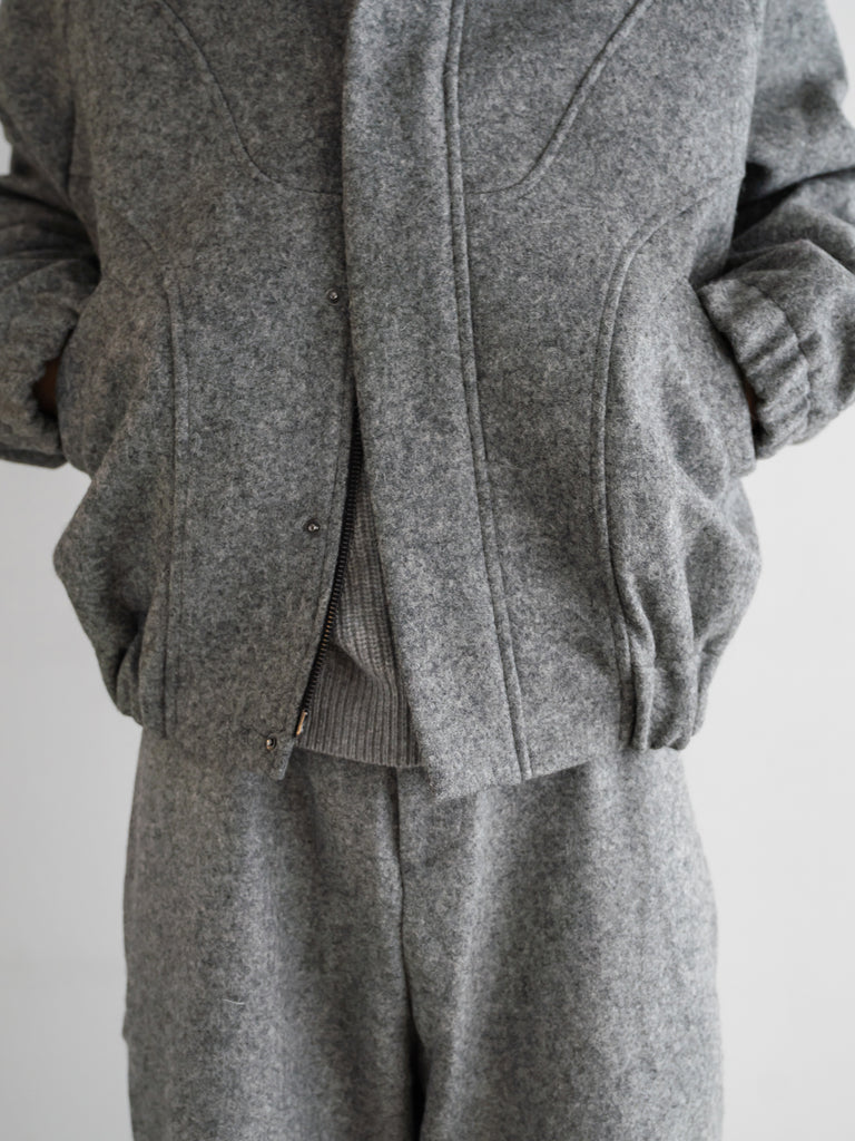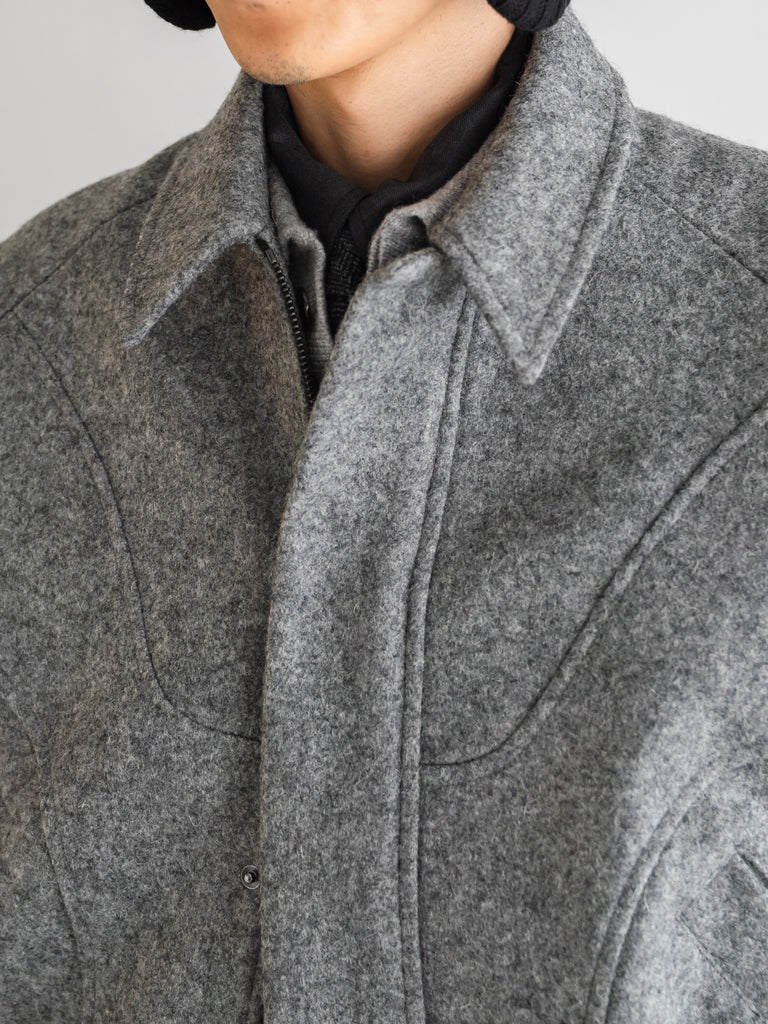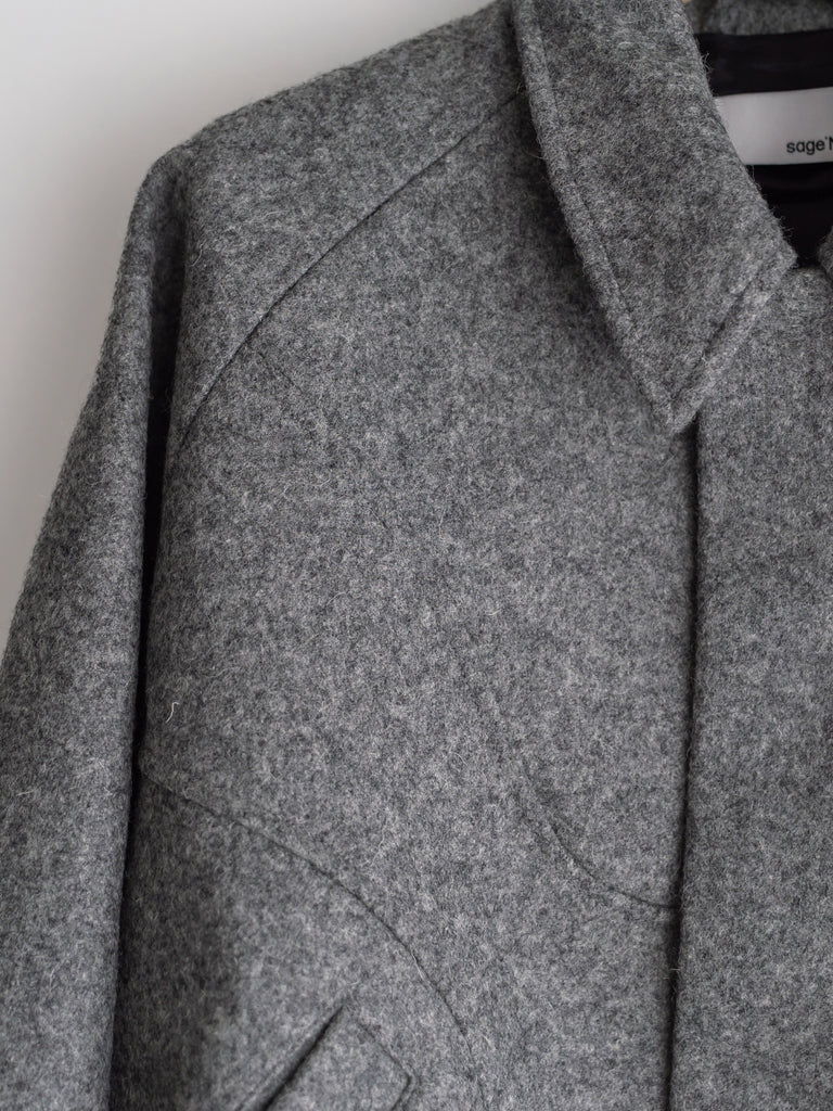 英国ツイードのヘリンボーンウールを使用した、カーブしたパネルが特徴的なクロップド丈ジャケット。