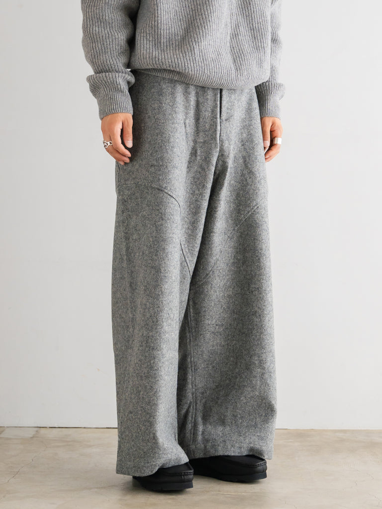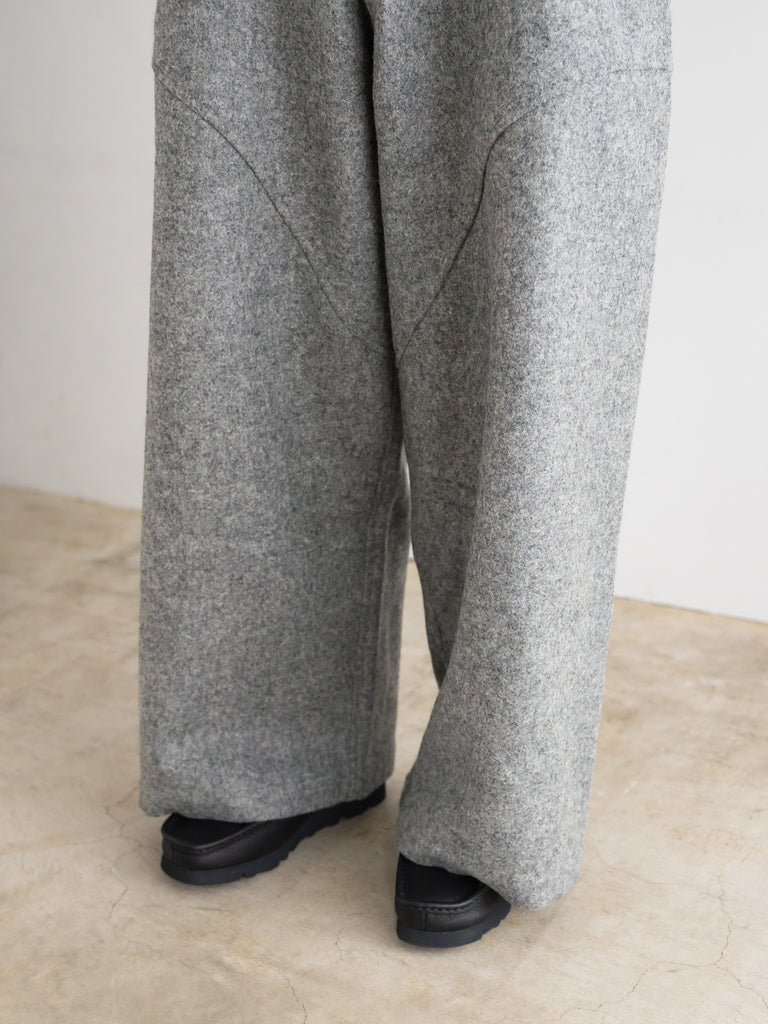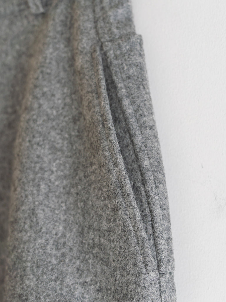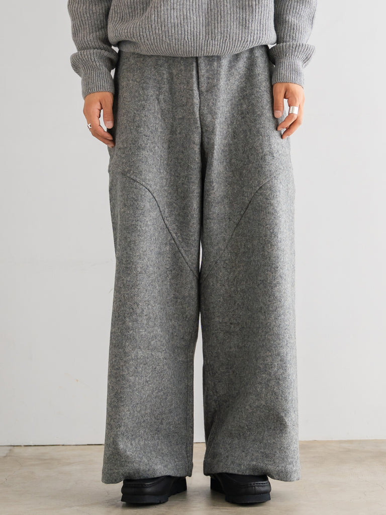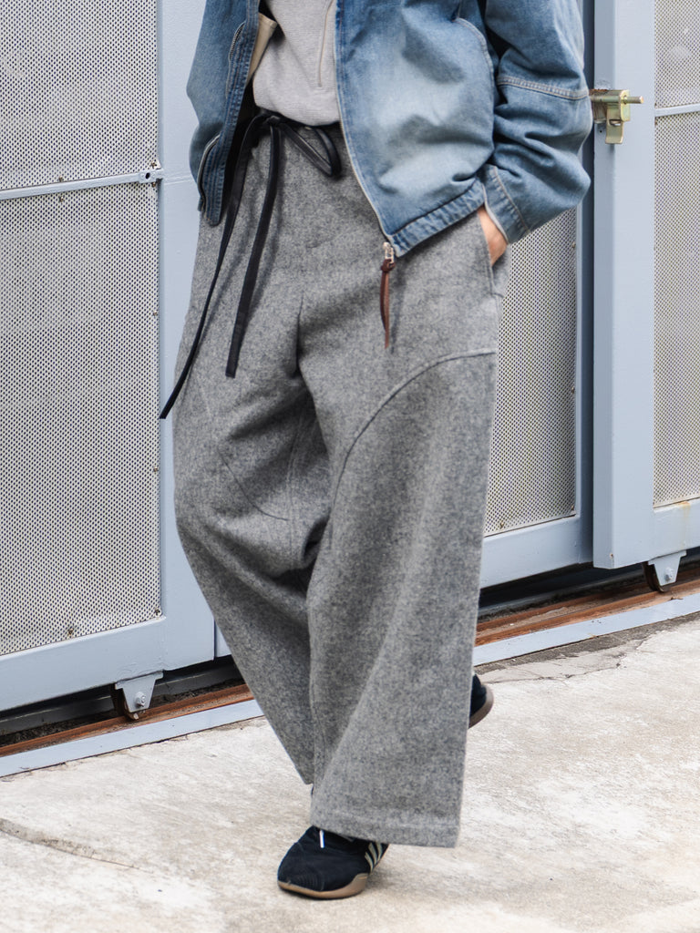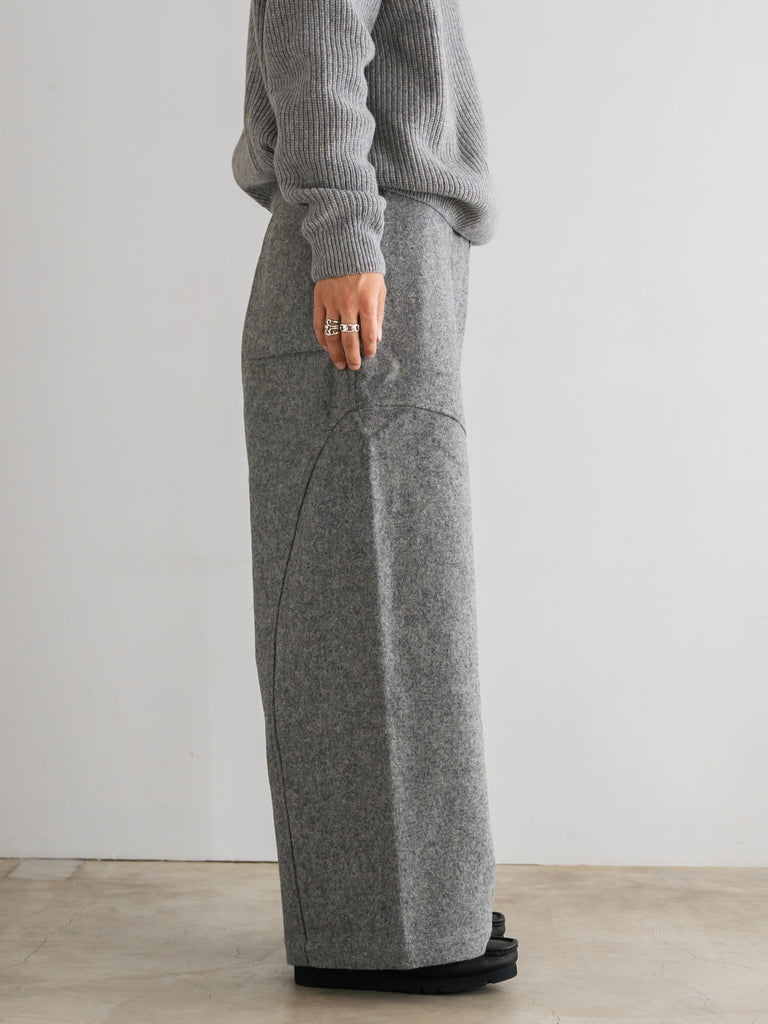 英国ツイードのヘリンボーンウールを使用した、カーブシームのディテールが美しいトラウザー。