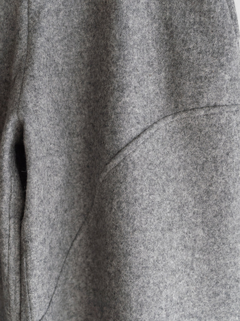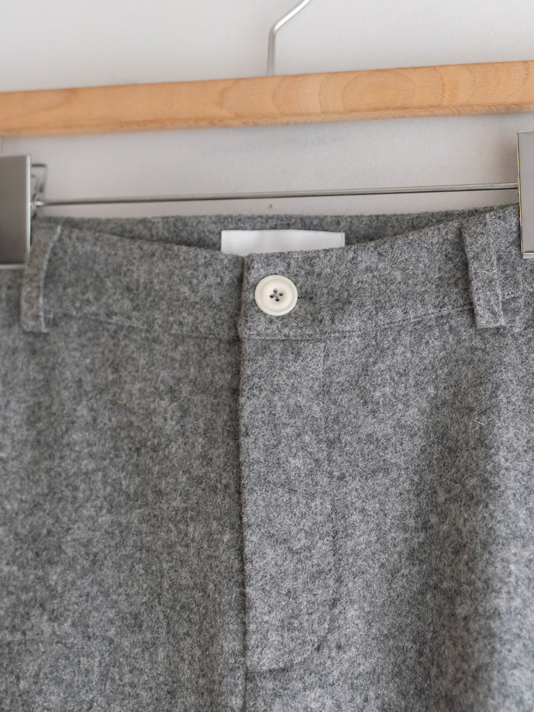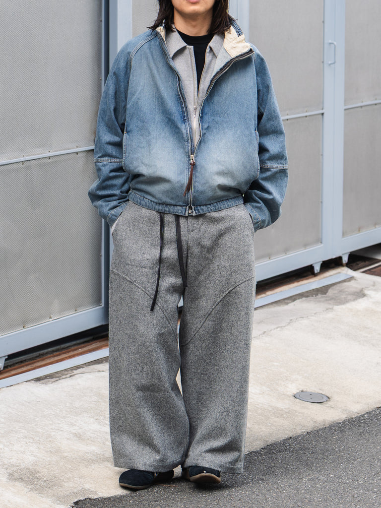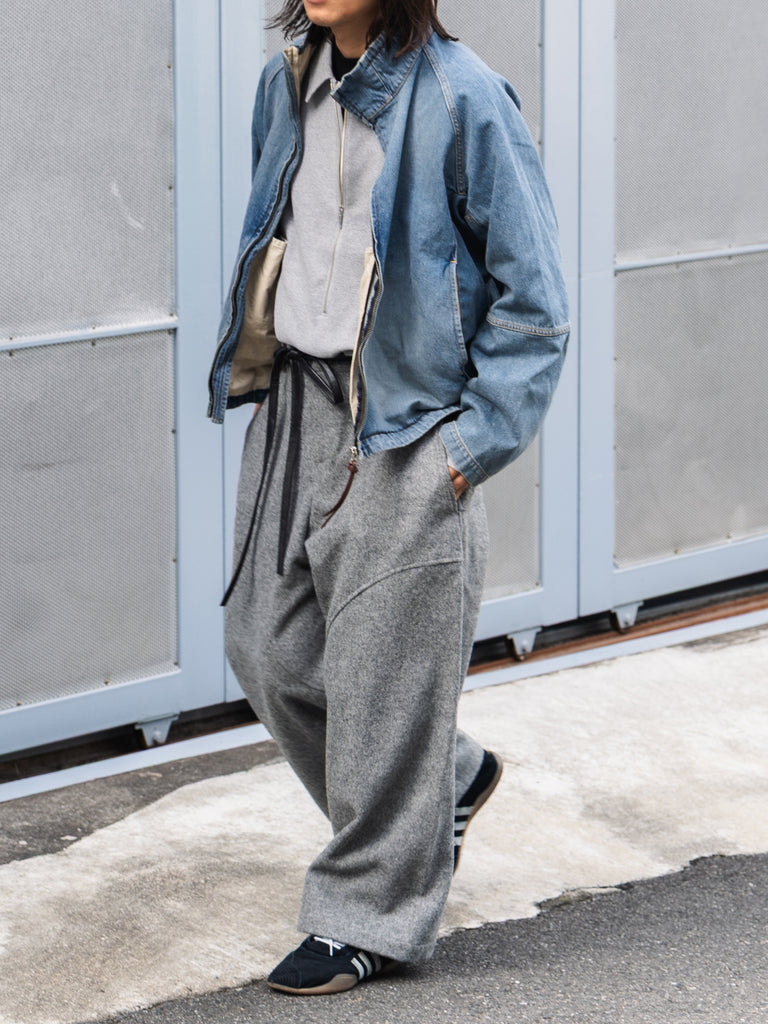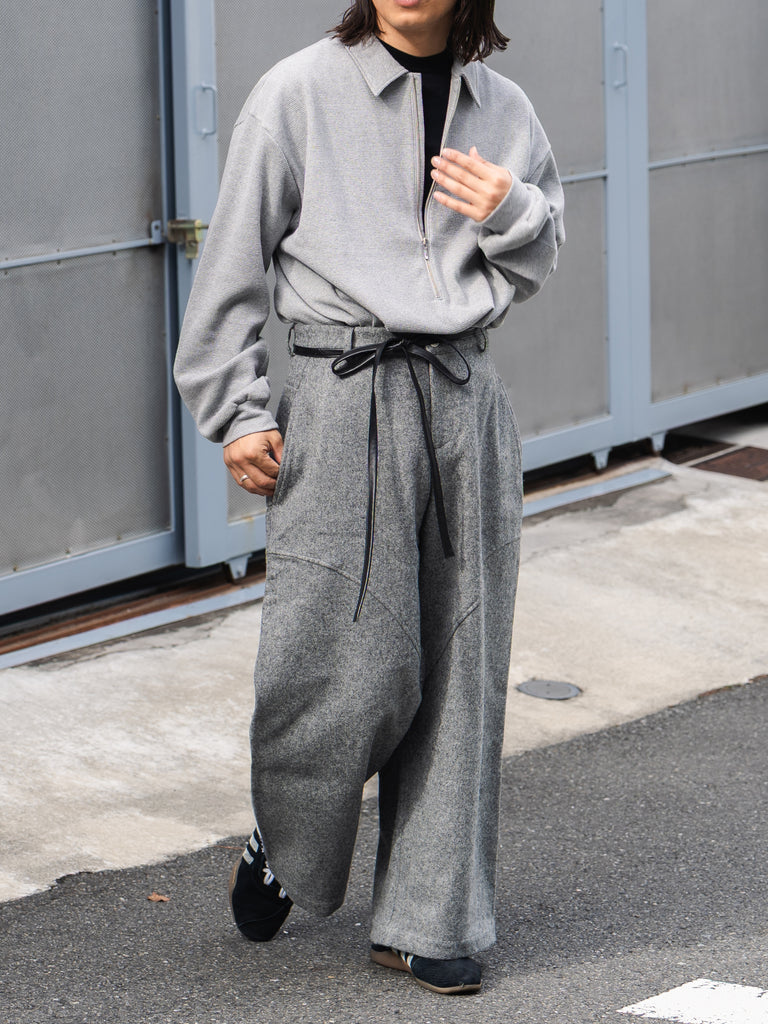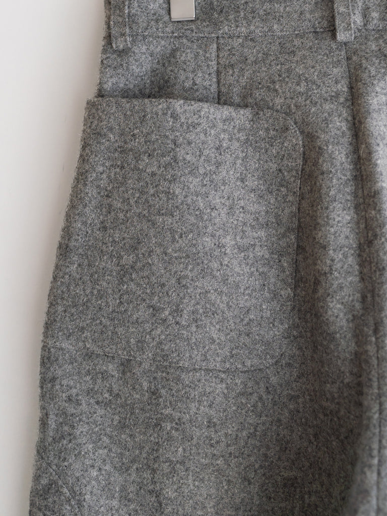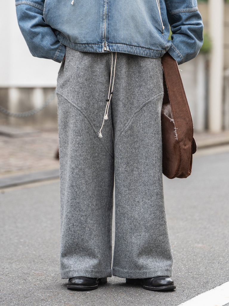 英国ツイードのヘリンボーンウールを使用した、カーブシームのディテールが美しいトラウザー。