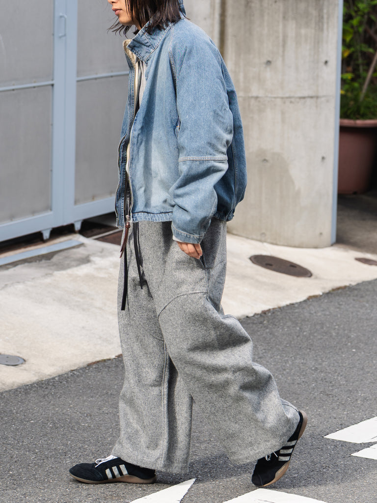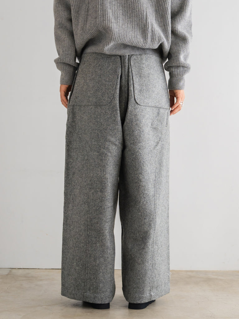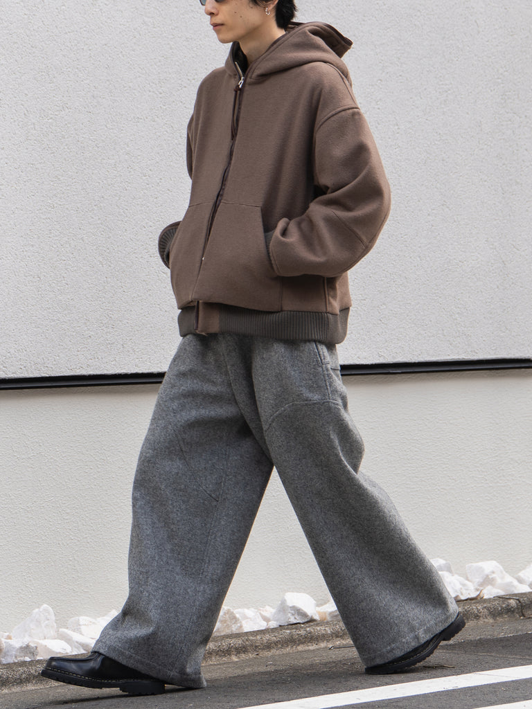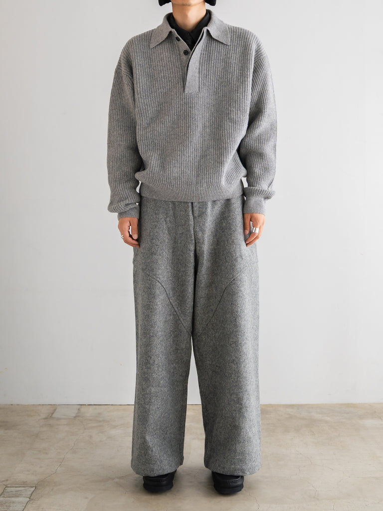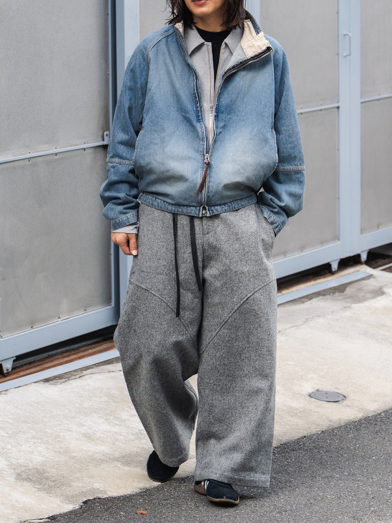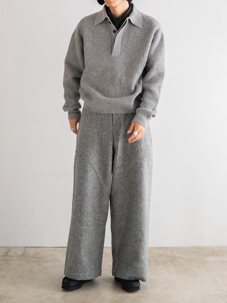 英国ツイードのヘリンボーンウールを使用した、カーブシームのディテールが美しいトラウザー。