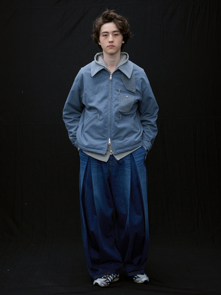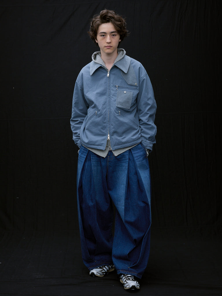 継続的に作成しているBOX PLEAT TROUSERは、鳶職人が履く“ニッカポッカ”や”ボンタン"などから着想を得て作成されたパンツ。