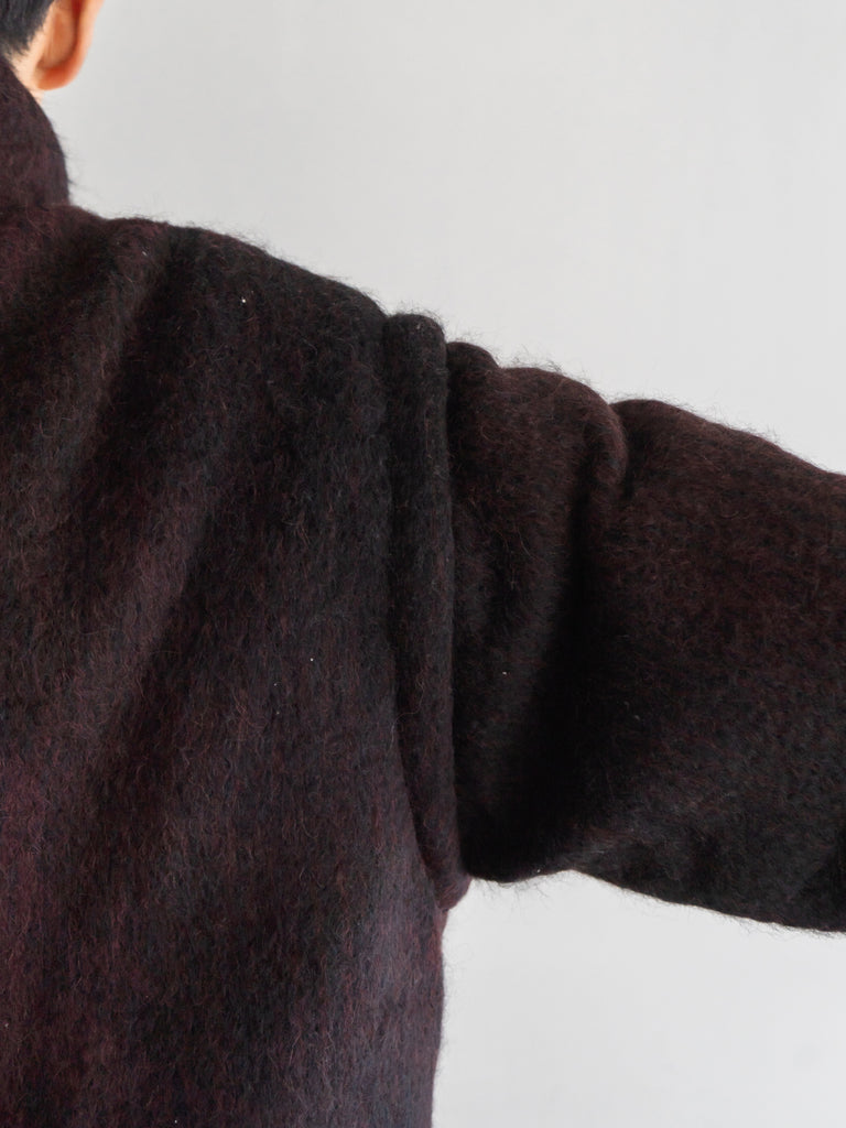 太い番手のアルパカウールのループの糸を使用した淡いシャドーの生地。