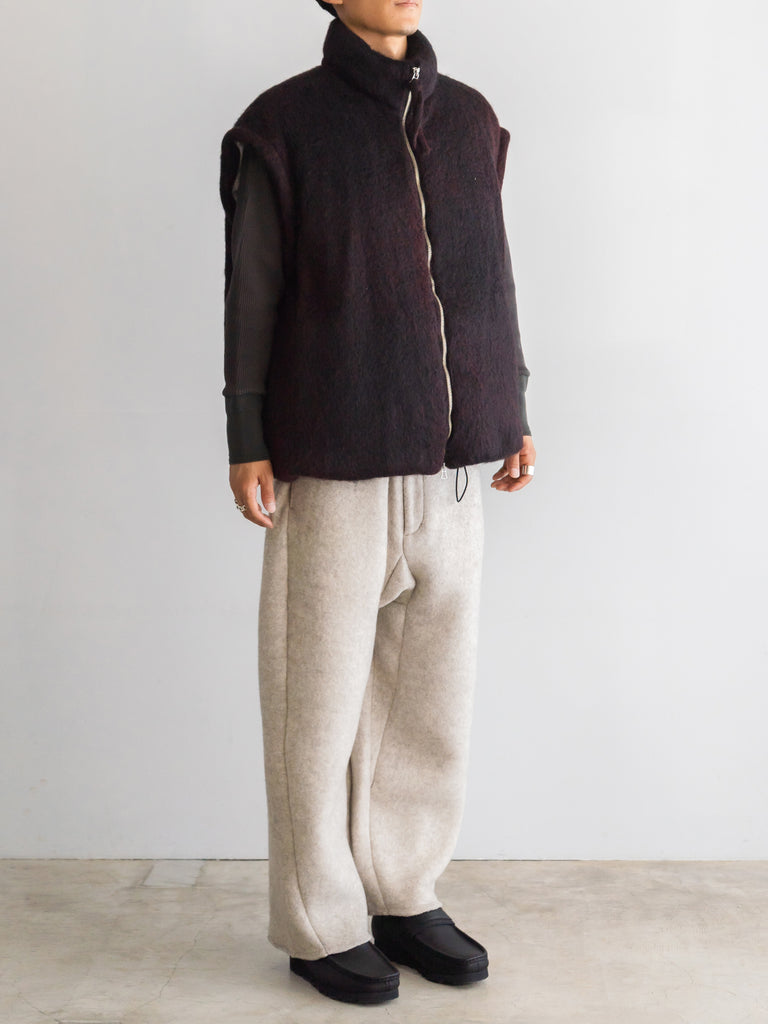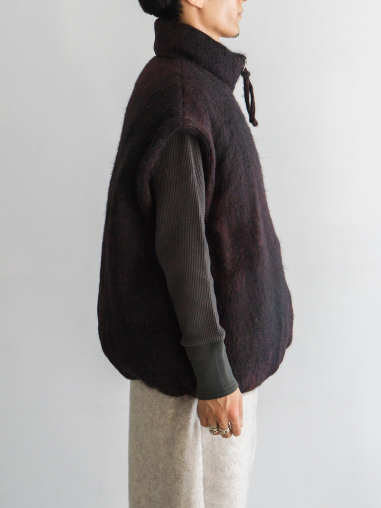 アルパカの毛質とループ糸の形状の糸を起毛することで毛足の長い起毛素材を製作しました。