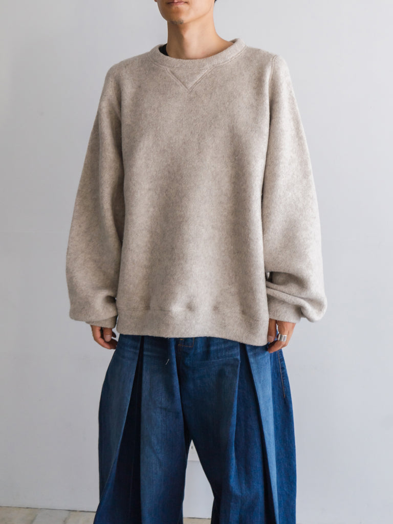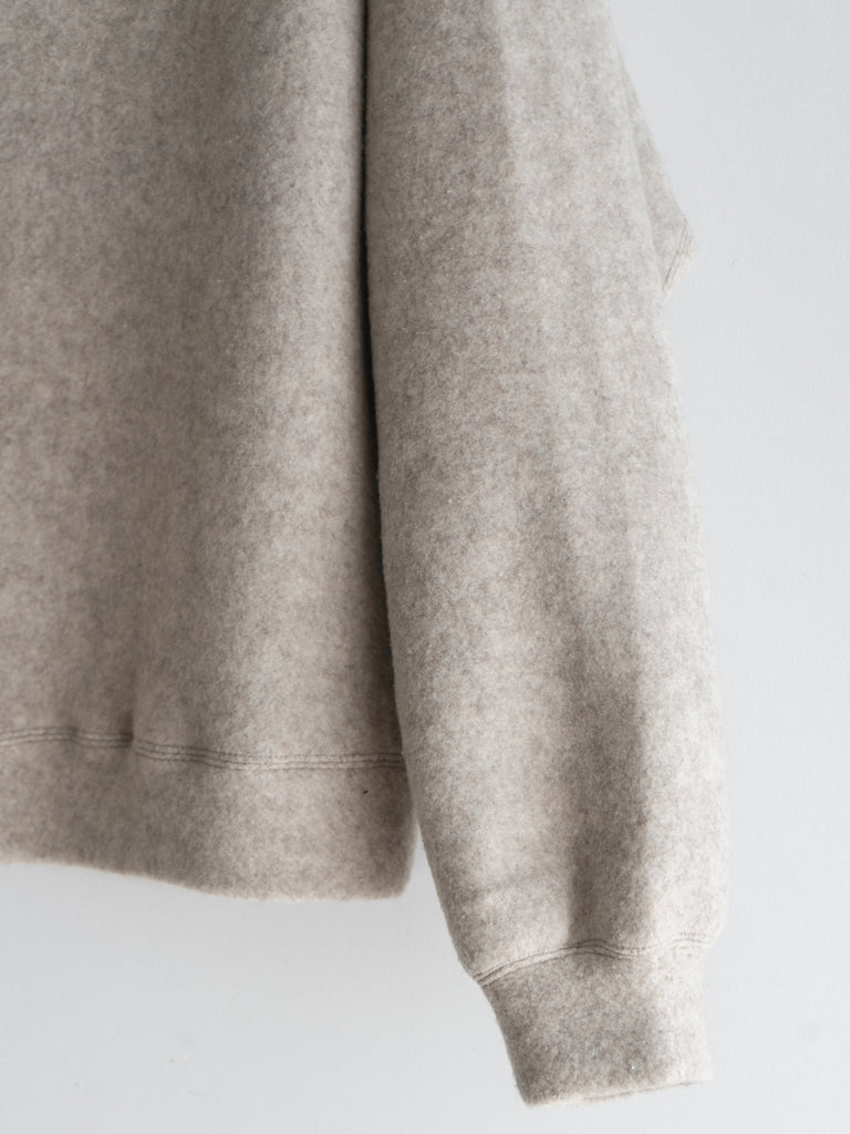 紡毛専門の紡績工場に別注し、ひいてもらった糸を使用し起毛加工を施して柔らかな風合いを持つリバース仕様の生地。