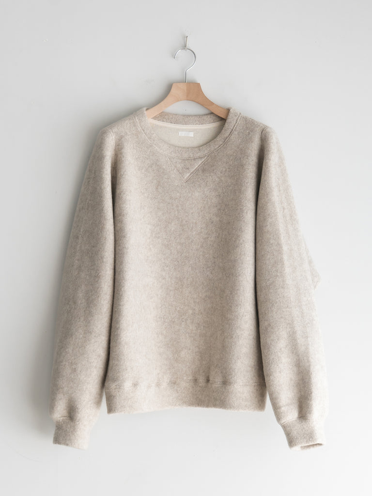 荒ゲージで編み上げた裏毛は軽くてふんわりした風合いを持ち、柔らかい着心地も特徴です。