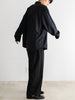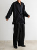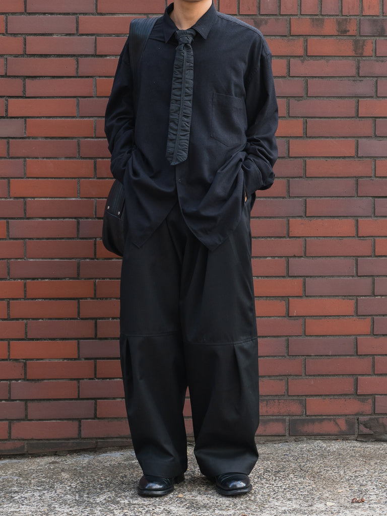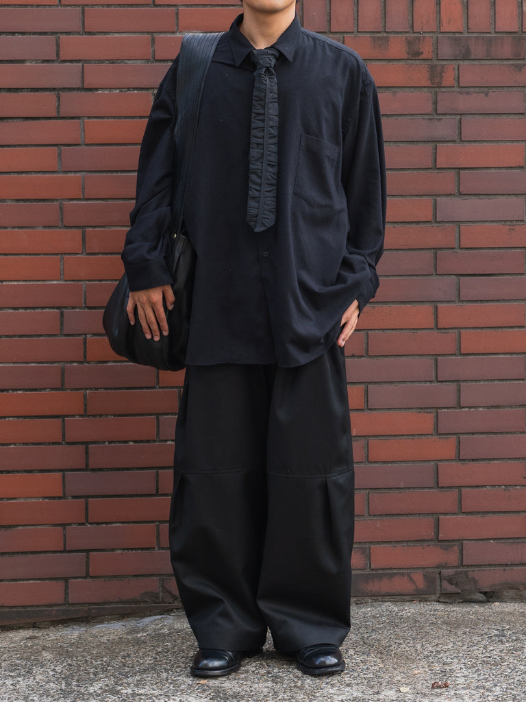 ⾝⼱、着丈、アームホールをゆったりととったシルエットに⼩さめの襟を合わせ、タックイン・アウトいずれにもマッチするバランス感に仕上げました。