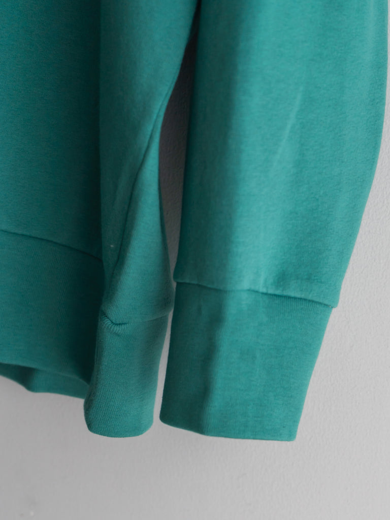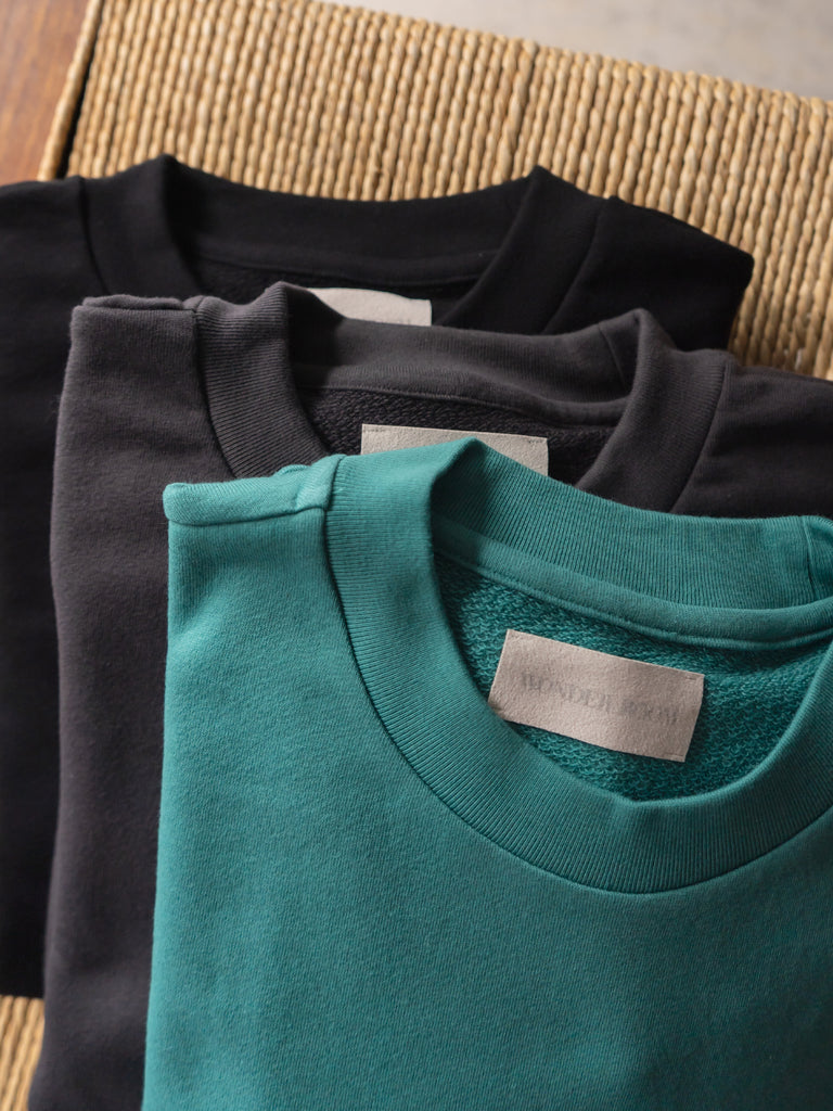 365 日、72 時間、身につけられる様な極上の着心地と、精神的な豊かさ、そして、洗濯耐性を持ち合わせる生地は、表、中、裏の糸質と撚糸をそれぞれ変えることから拘ることにより、友達との日常を尊む感覚を想像させる温かさを感じさせる。