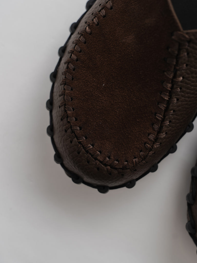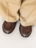 アッパーにはクロムとタンニンのコンビなめしによる型押しシュリンクレザーを使用。ドラム空打ちで仕上げることで、程よいコシと柔らかさを両立しています。