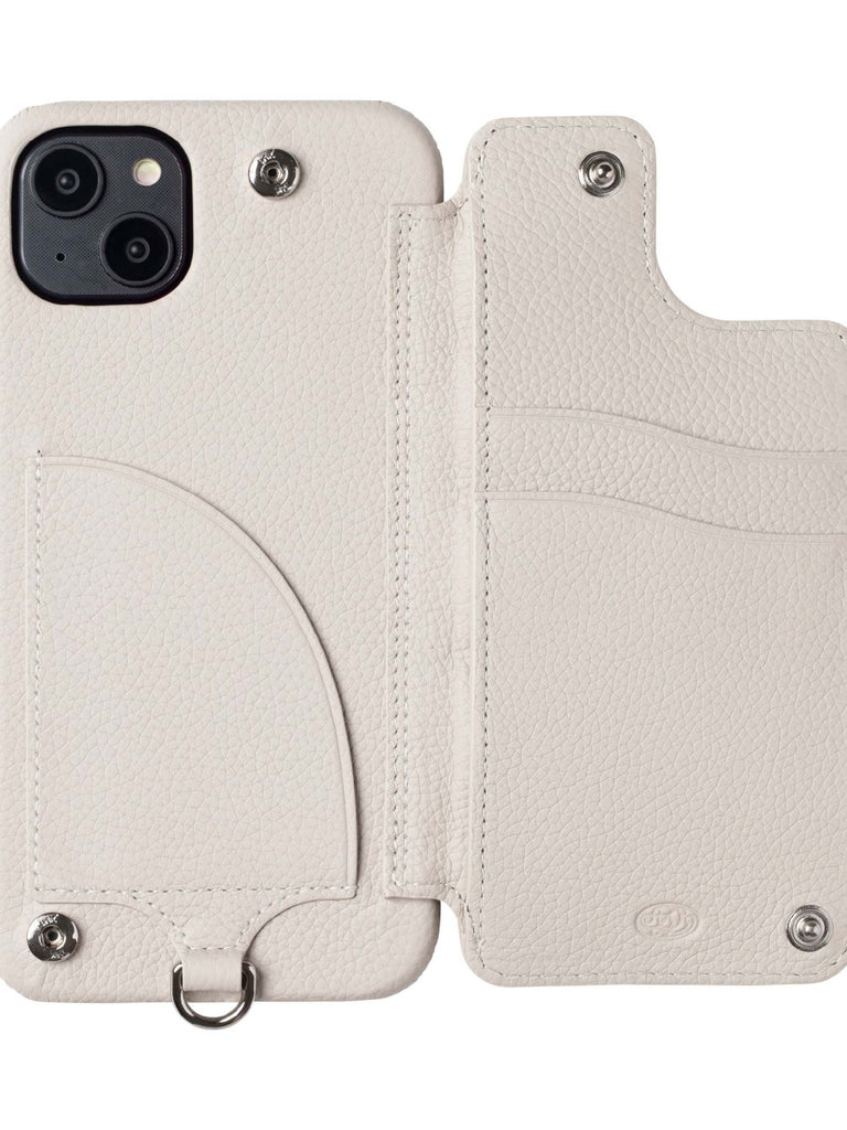 It is an item with outstanding presence with its eye-catching design and texture. A convenient item with a two-stage card slit and a hidden pocket on the inside of the right door and a storage pocket on the left side.