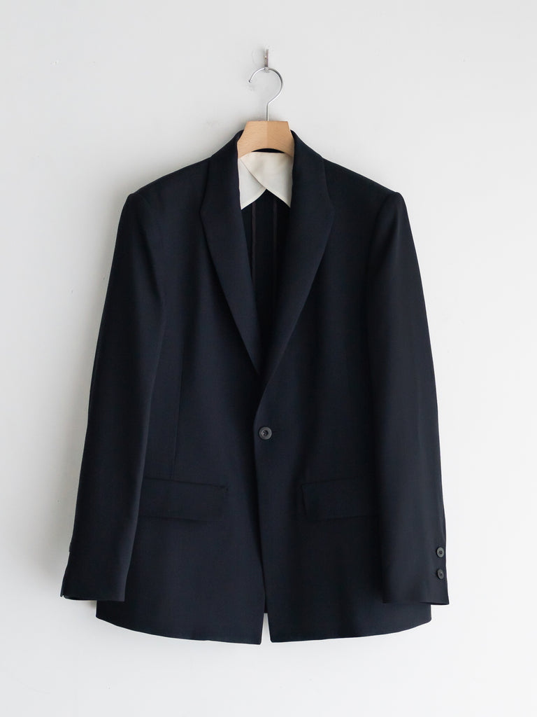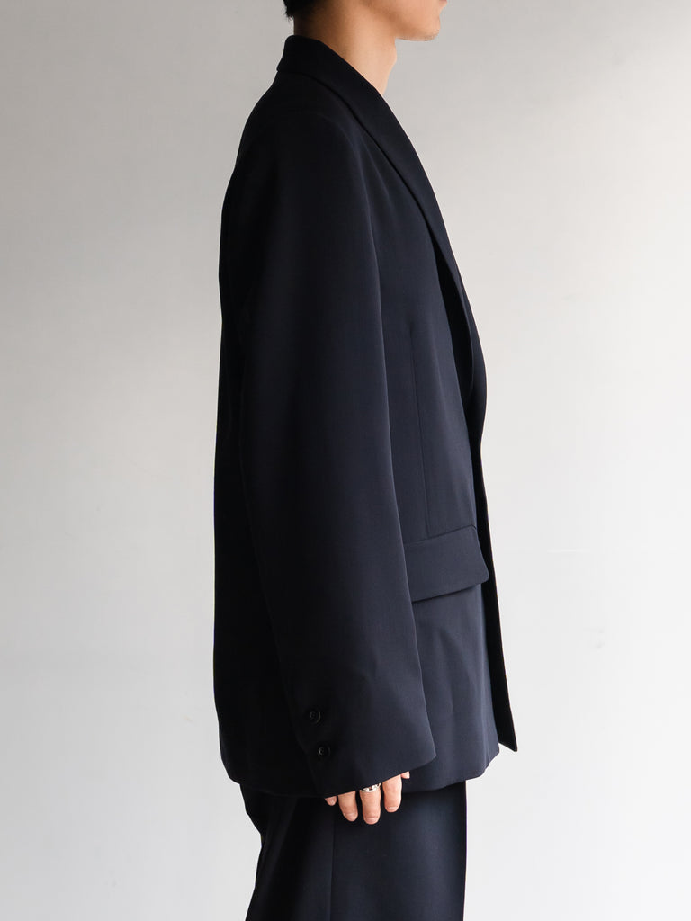 朱子織のウール素材を使用した、 背裏仕立てのショールカラージャケット。
