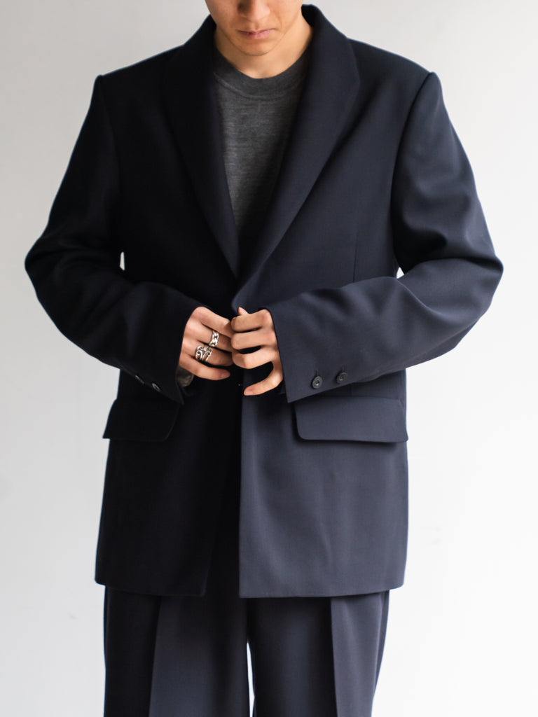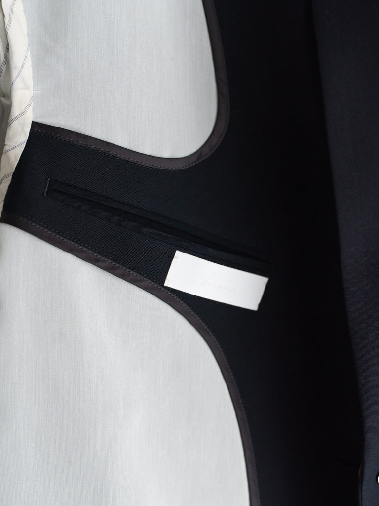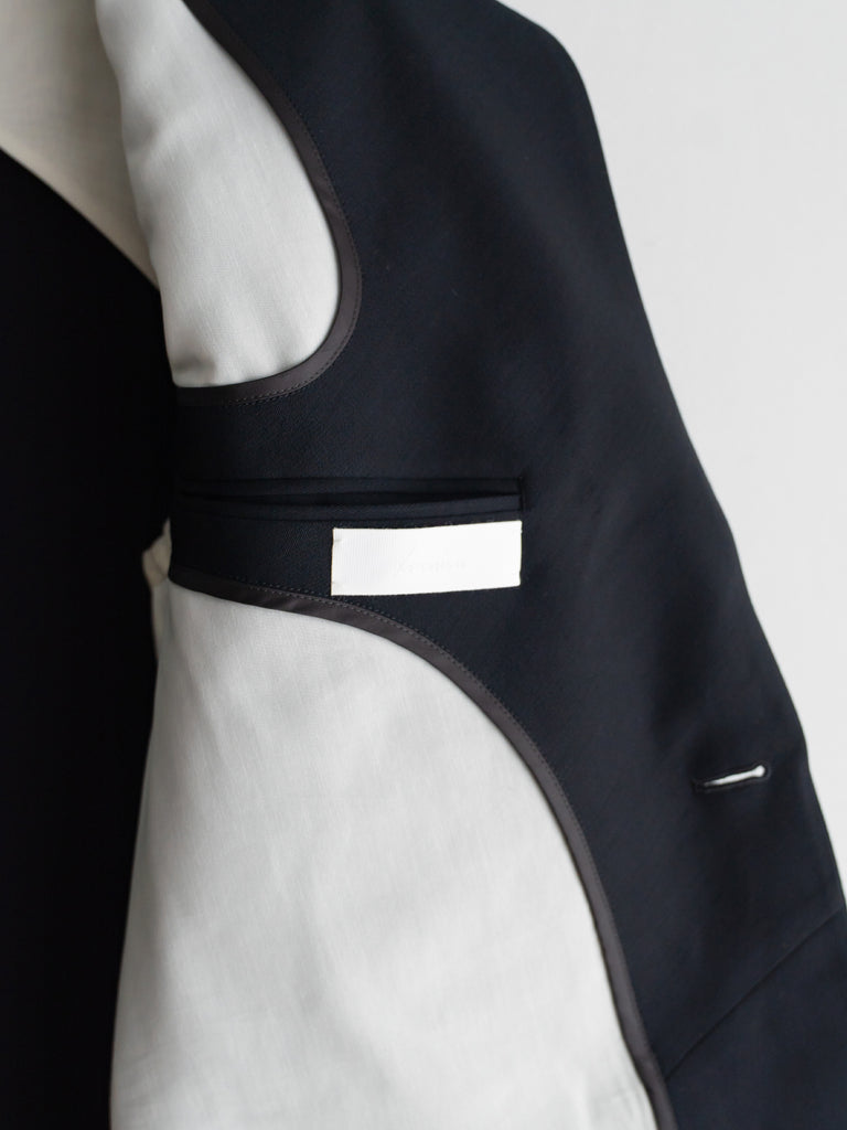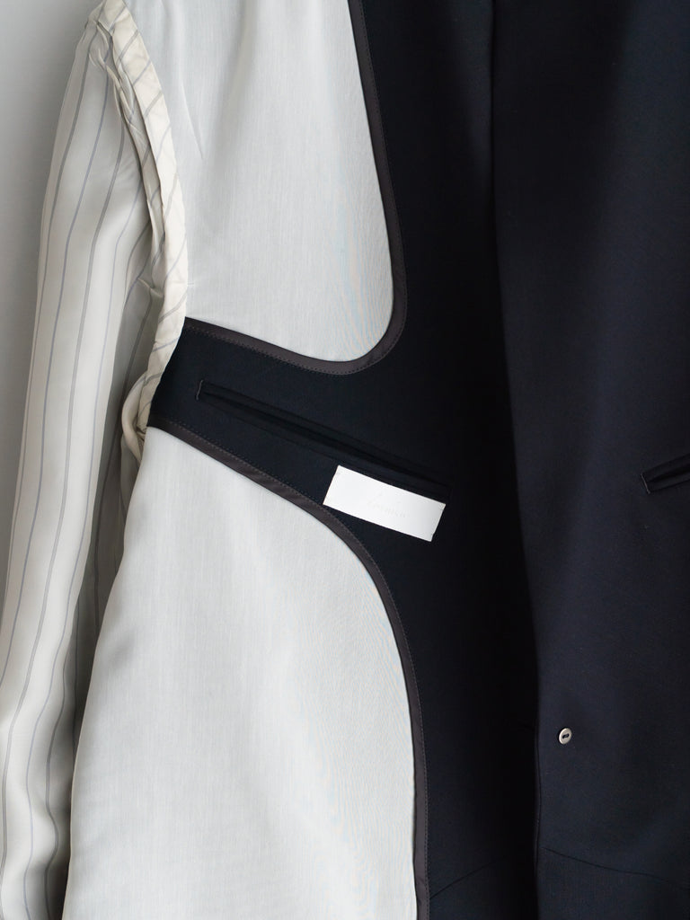 極薄の肩パットを入れて、中の仕立てをしっかりと作り込む事で、通常のジャケットにはない軽い着心地を体感頂ける1着になっています。