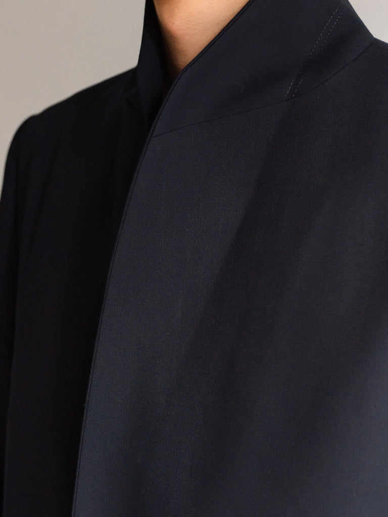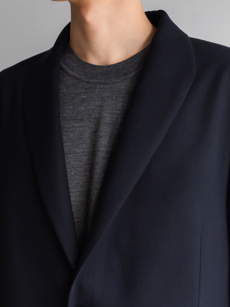 通常のショールカラーの衿の形に微細なカットの変化を加え、身頃やアームには程よくゆとりを入れて、洗練されたバランスのパターン設計になっています。
