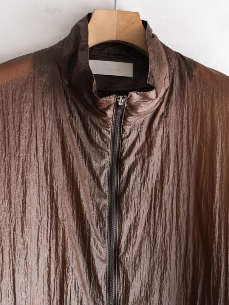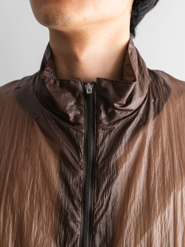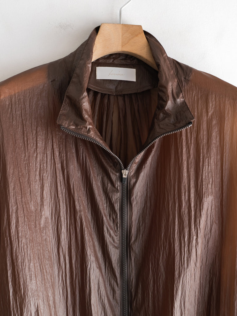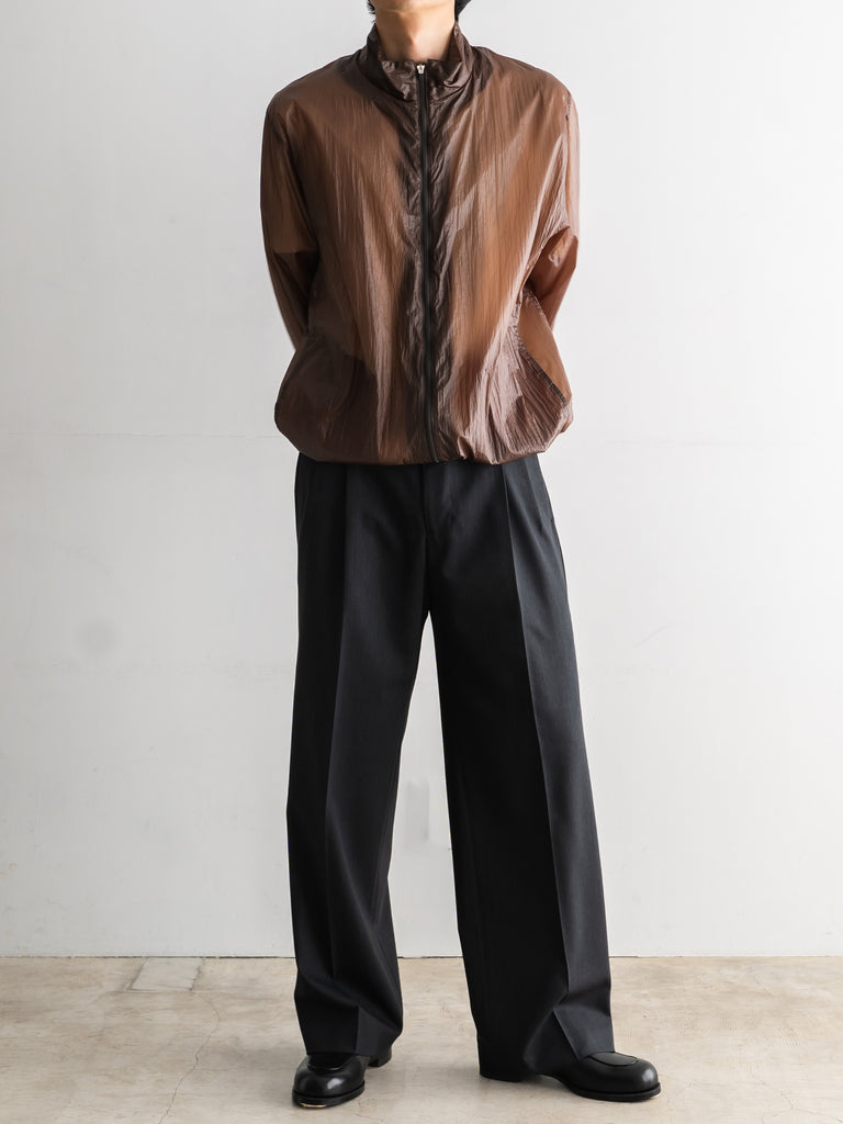 天然ワックスコーティングと撥水加工を施した超軽量ナイロン素材を使用した、一重仕立てのスタンドカラージップブルゾン。
