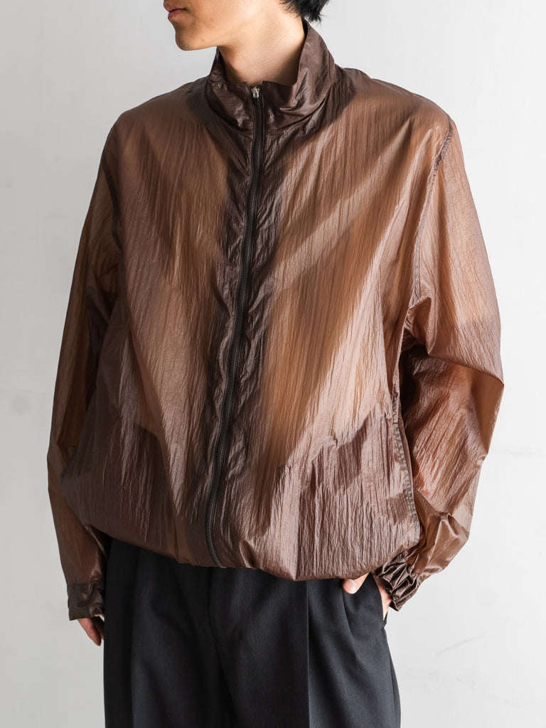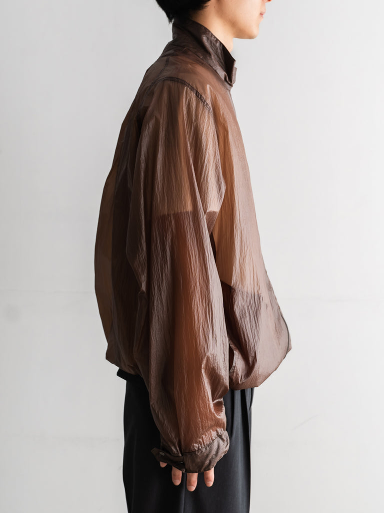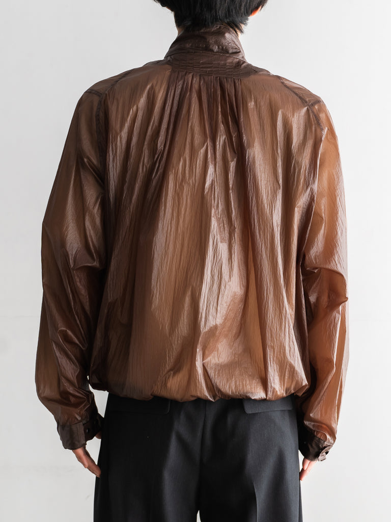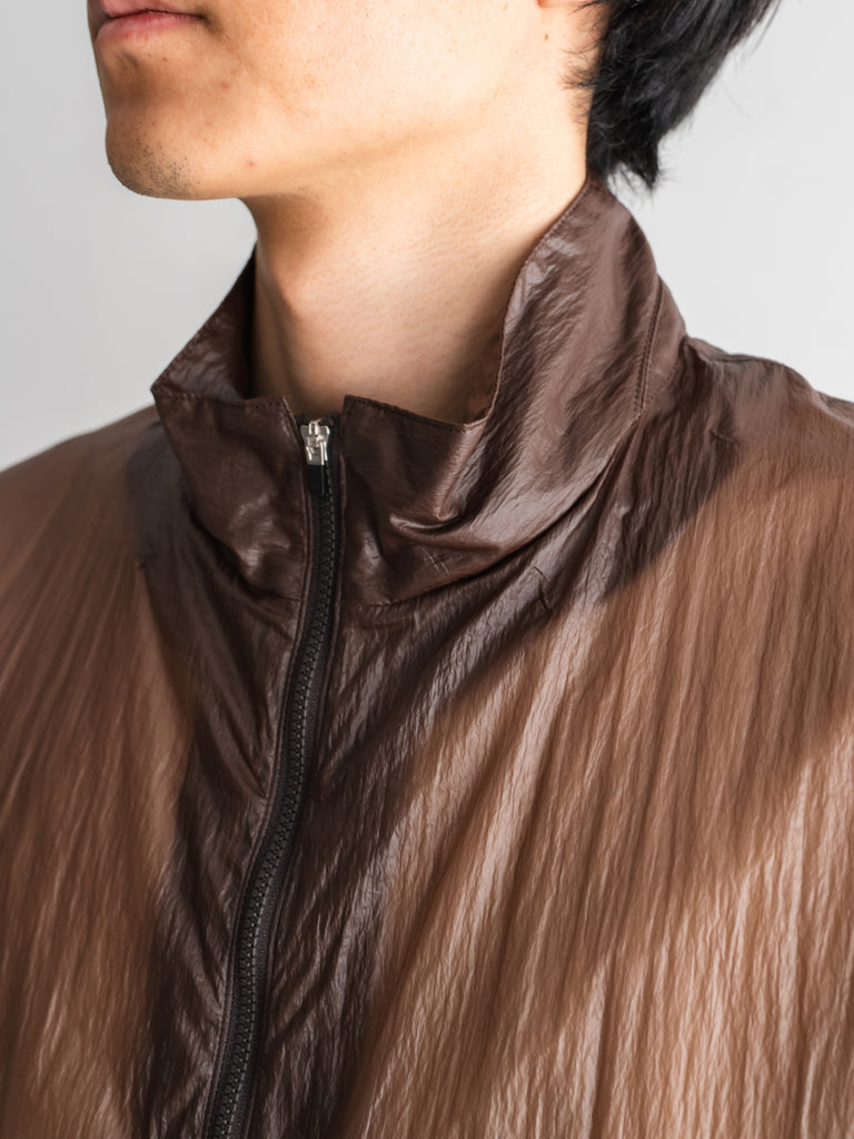 透け感があるほど薄いナイロン素材にコーティング加工を施すことで独特の表情とタッチを生み出しています。