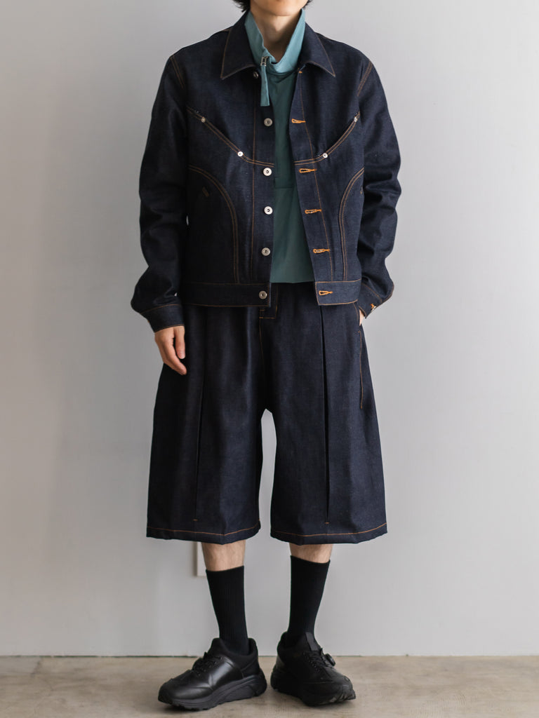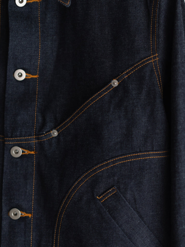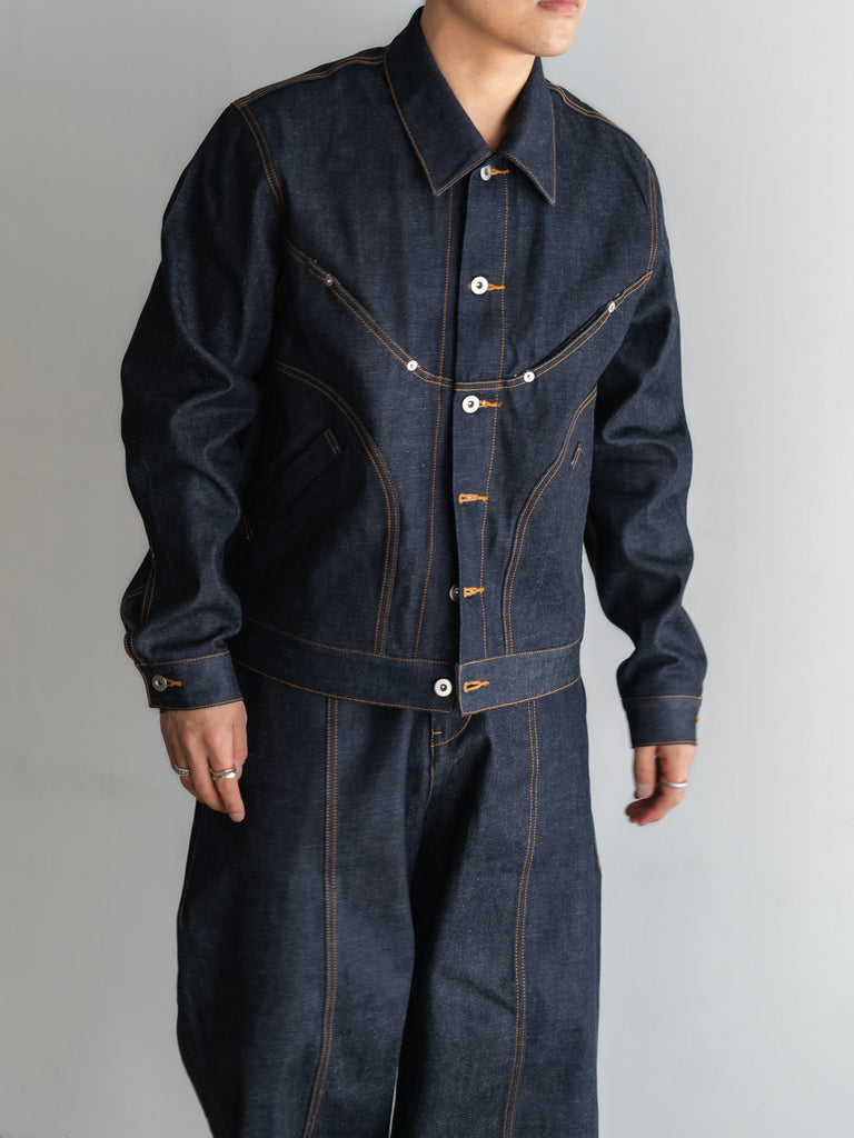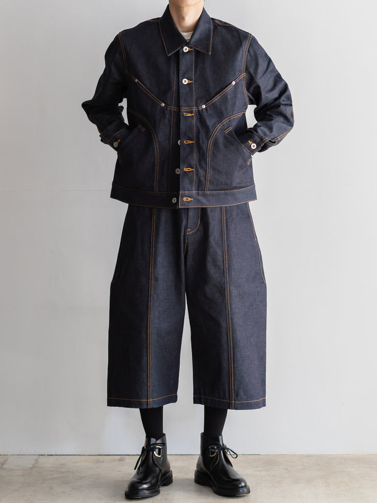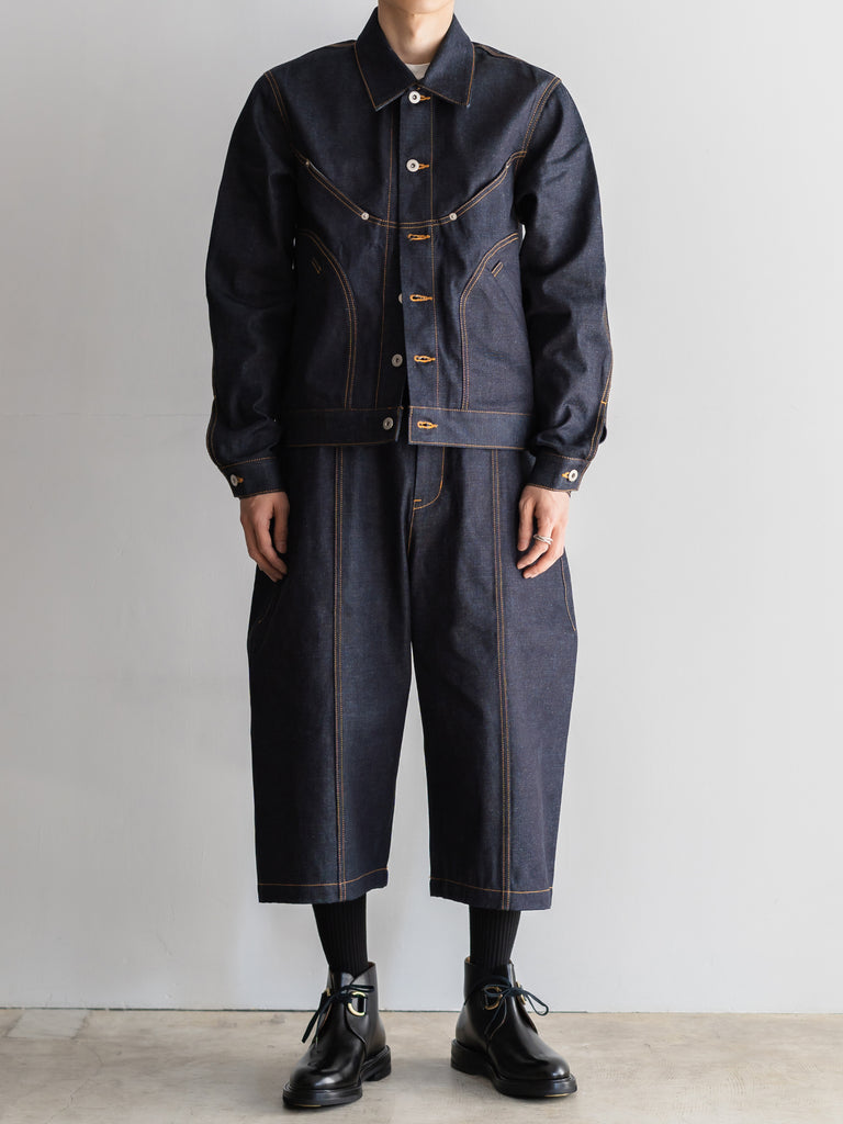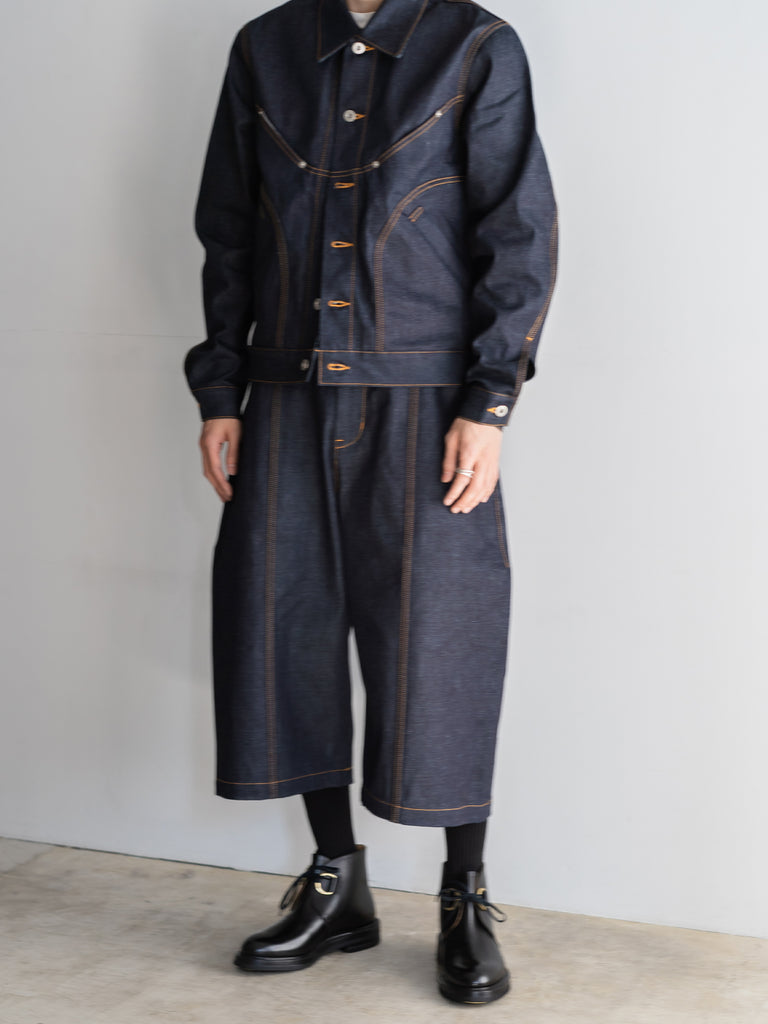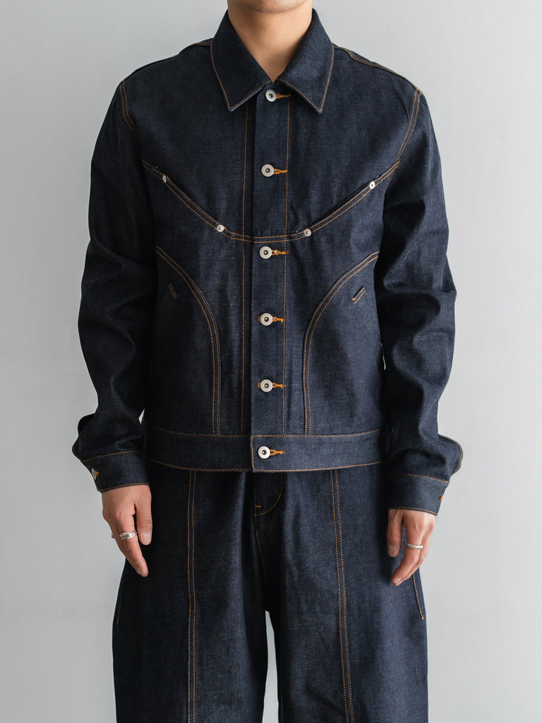 クロップド丈のジャケットで、曲線的なパネル使いやシームに沿った胸ポケットの配置が印象的なデニムジャケット。