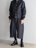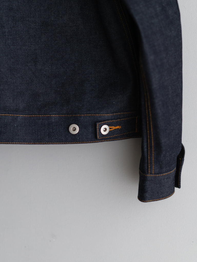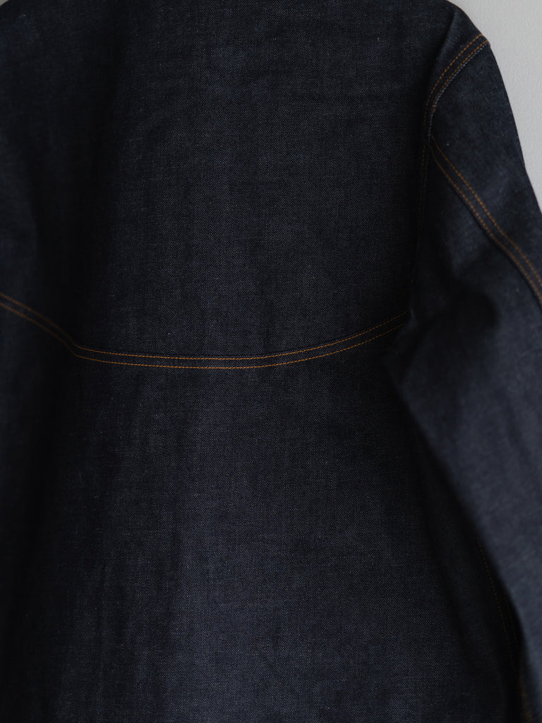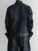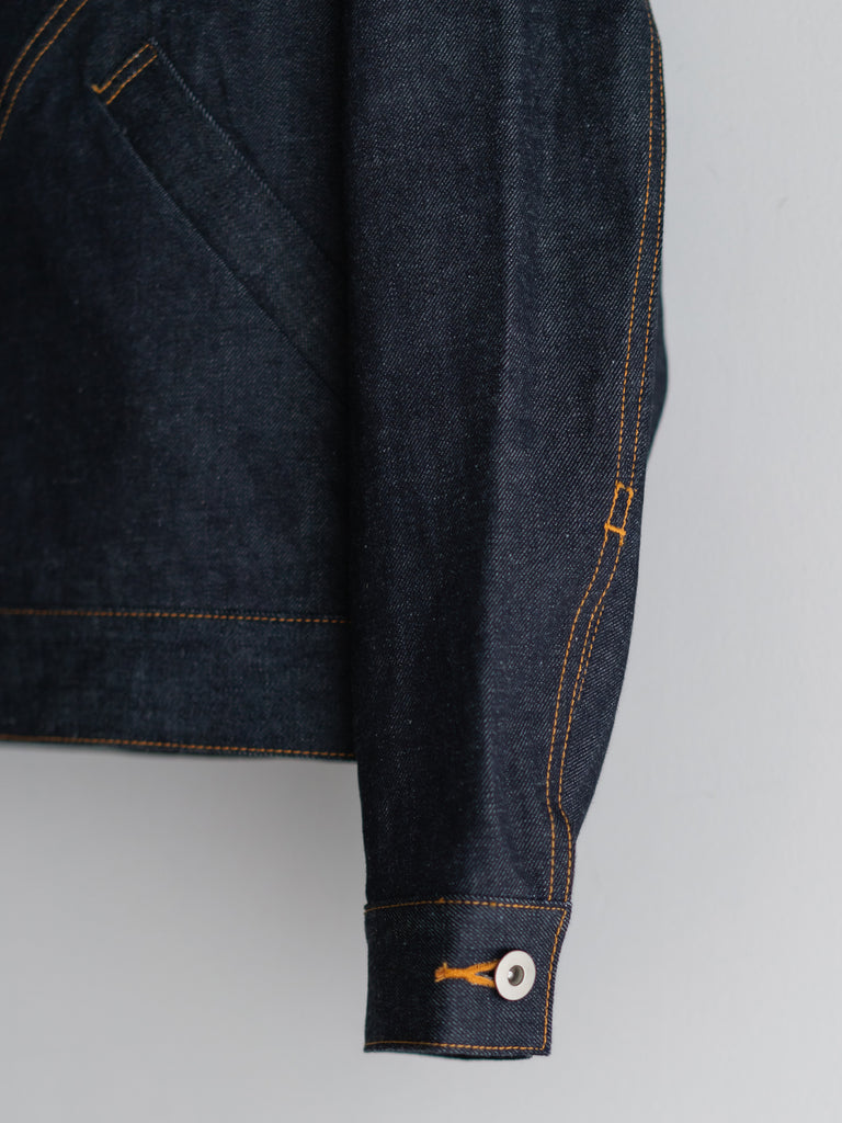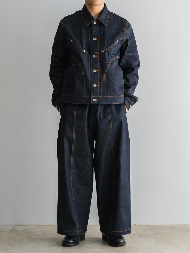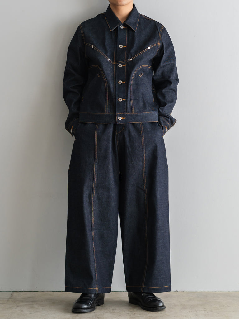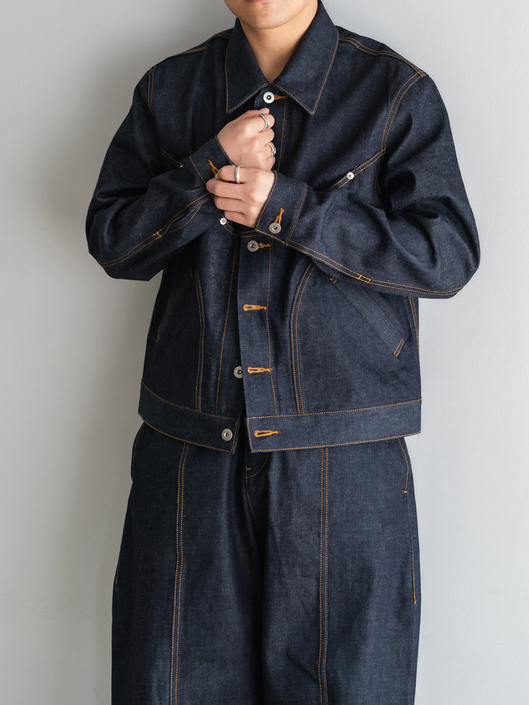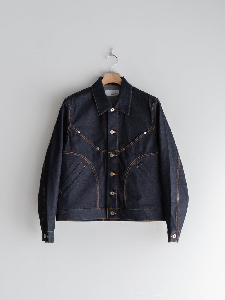 クロップド丈のジャケットで、曲線的なパネル使いやシームに沿った胸ポケットの配置が印象的なデニムジャケット。
