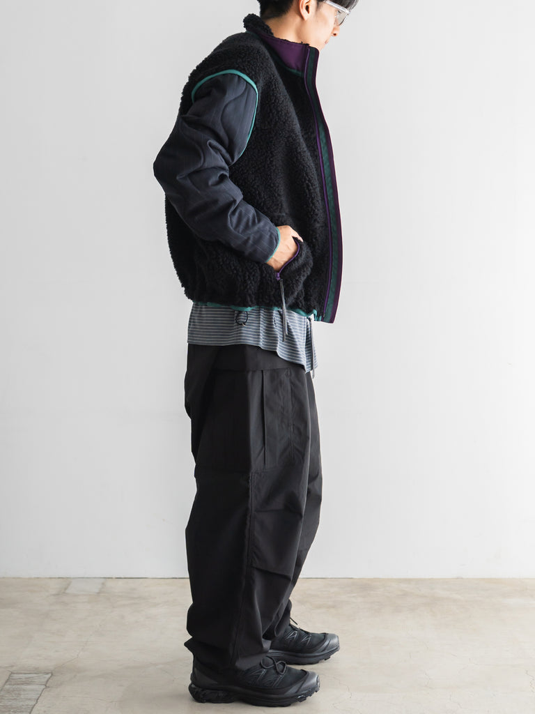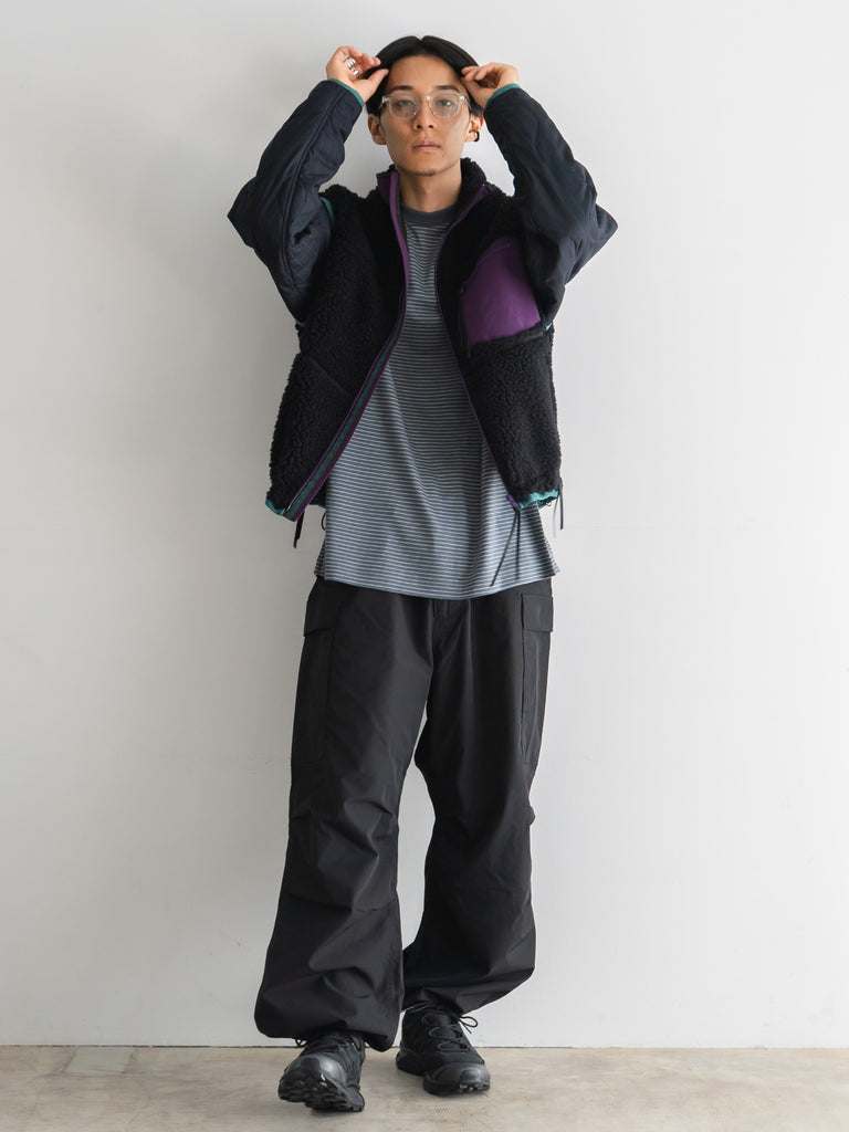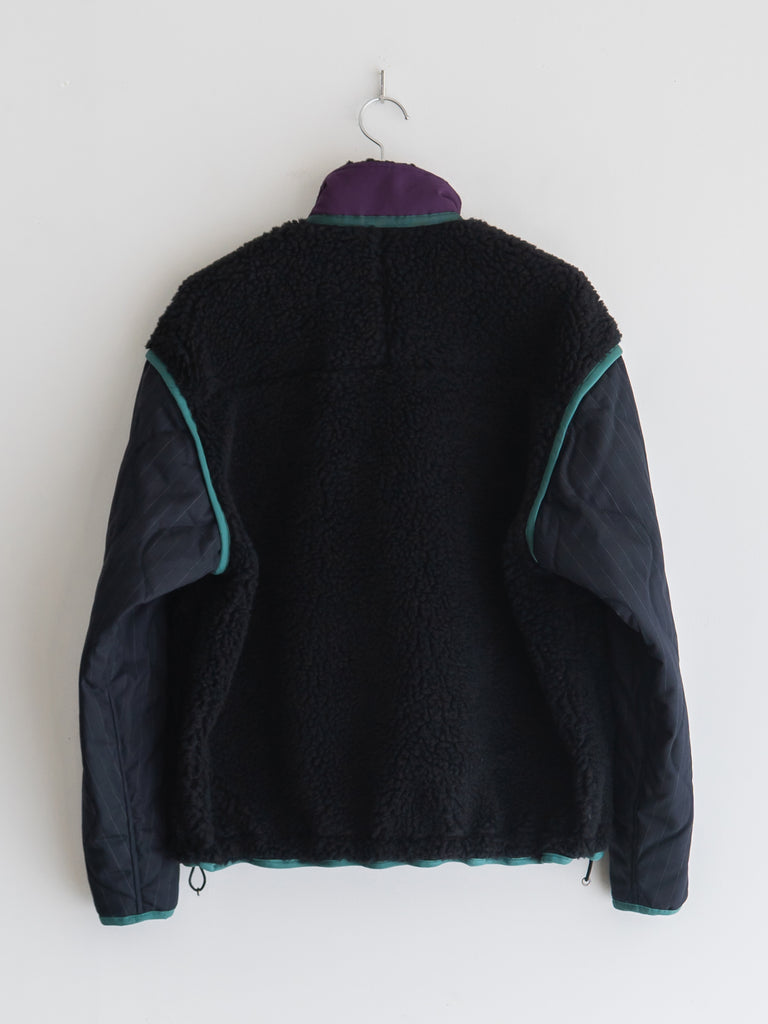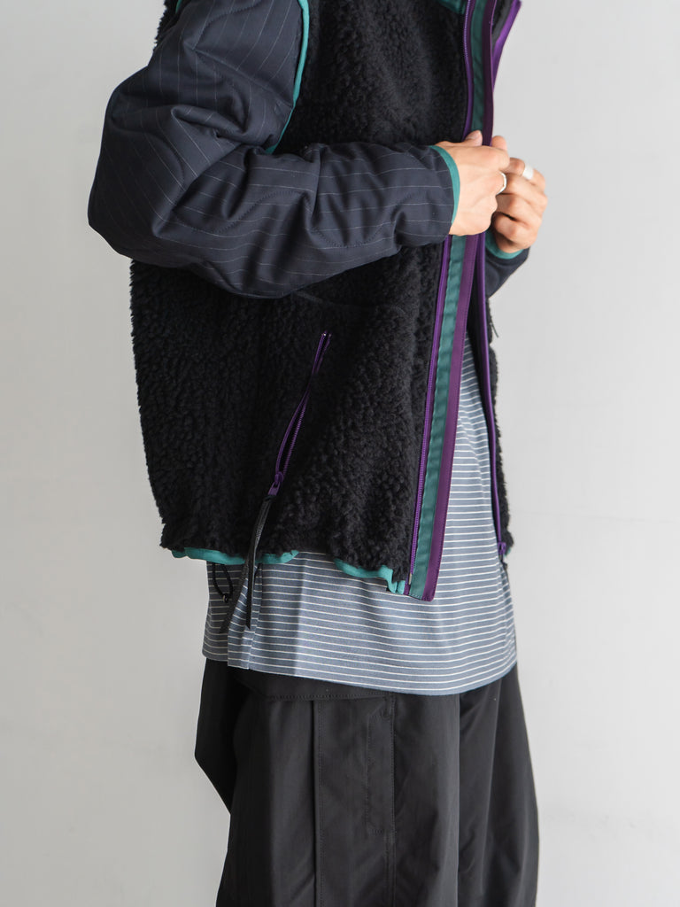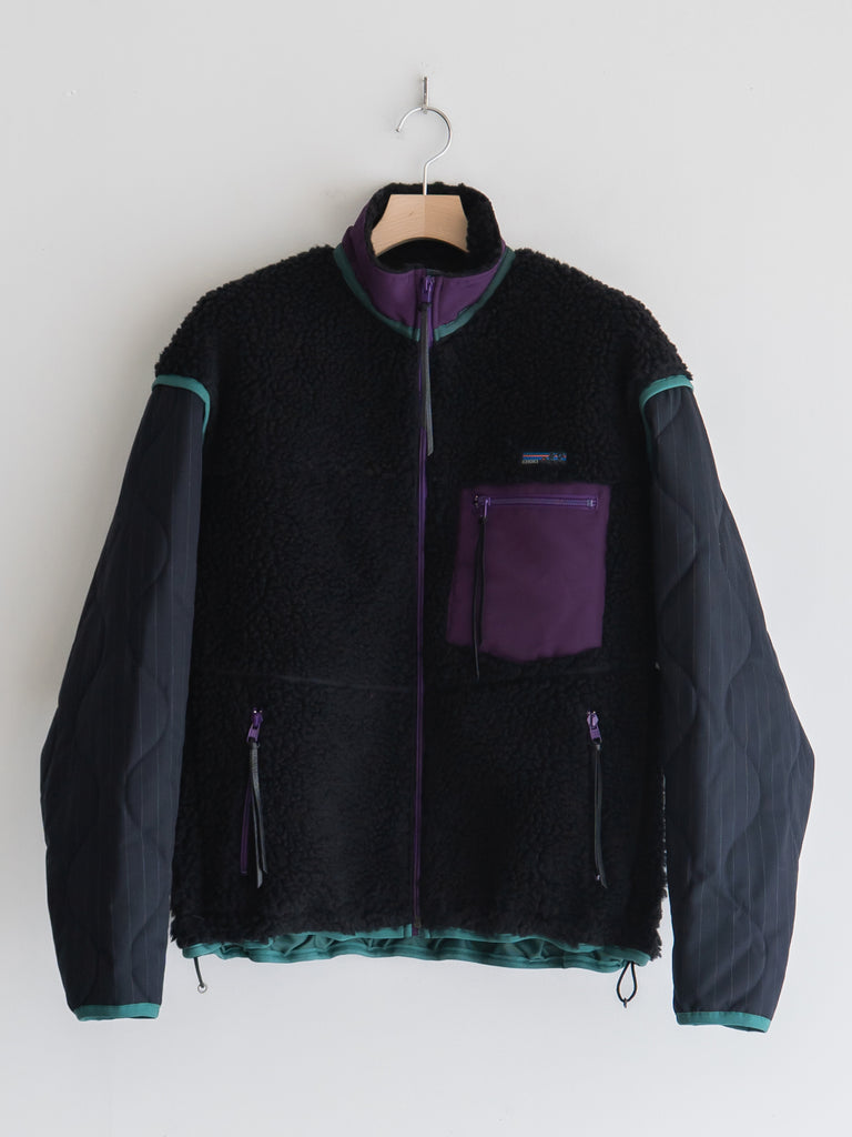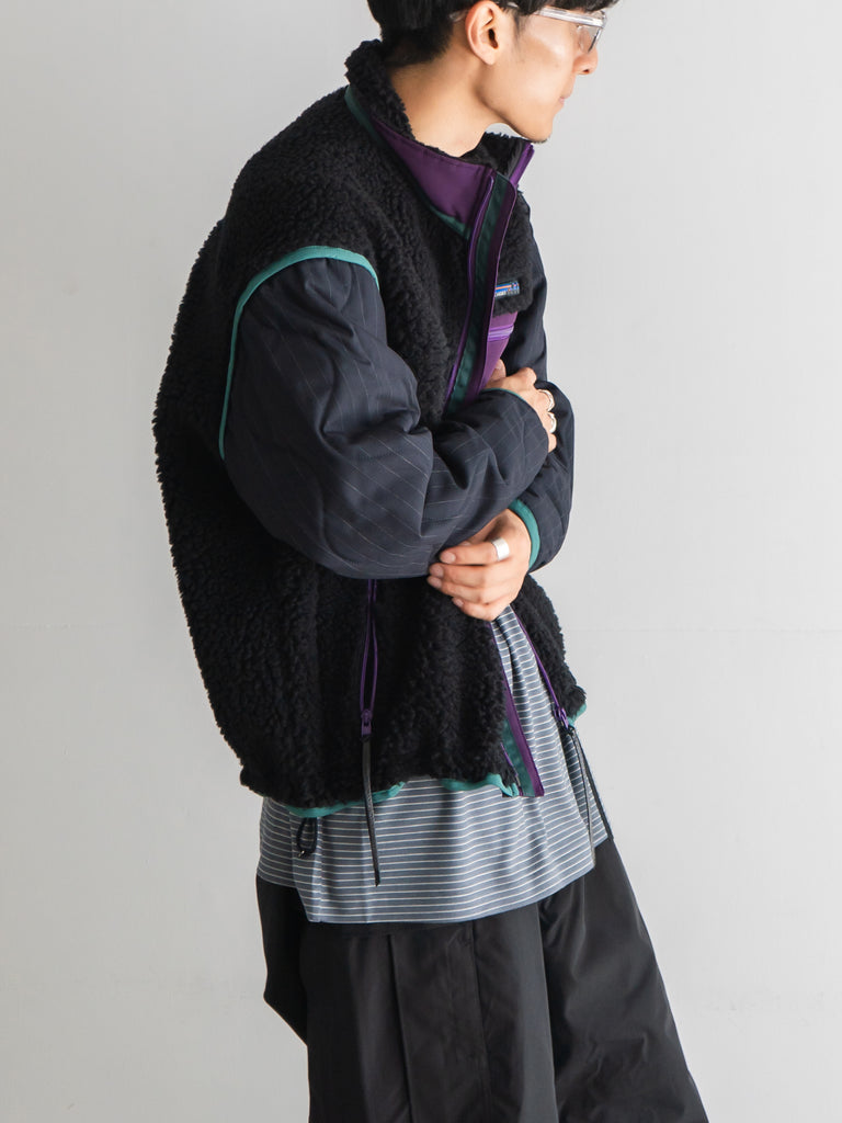 時代を超えて愛される定番アイテムをベースにしたフリースジャケットに、ドレス生地を組み合わせ、機能美とあえての過剰さを融合させた、ファッションデザインの楽しさを存分に味わえる一枚に仕上がっています。