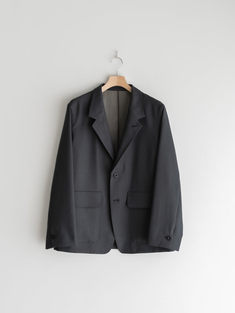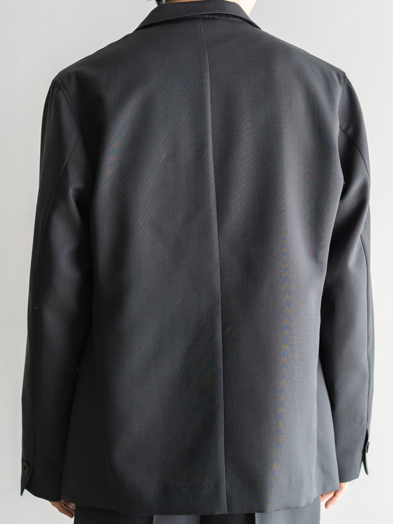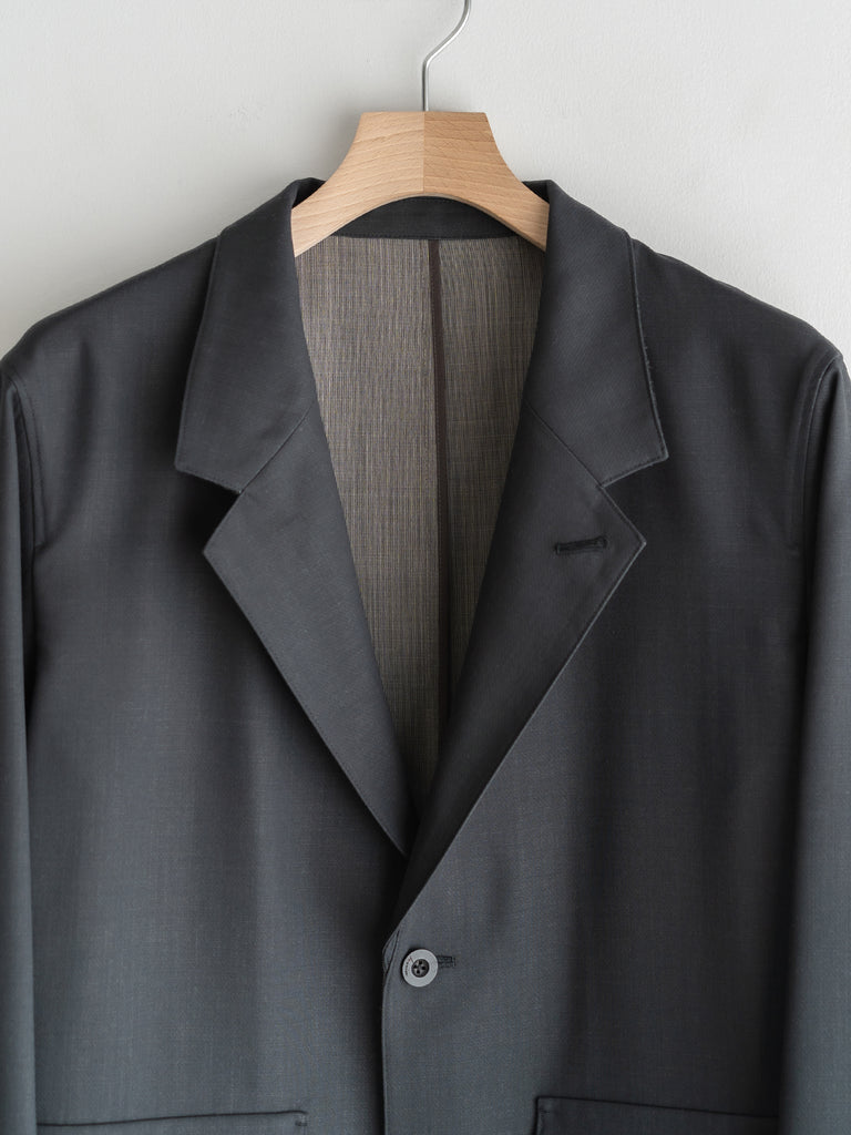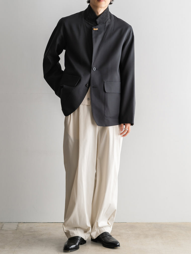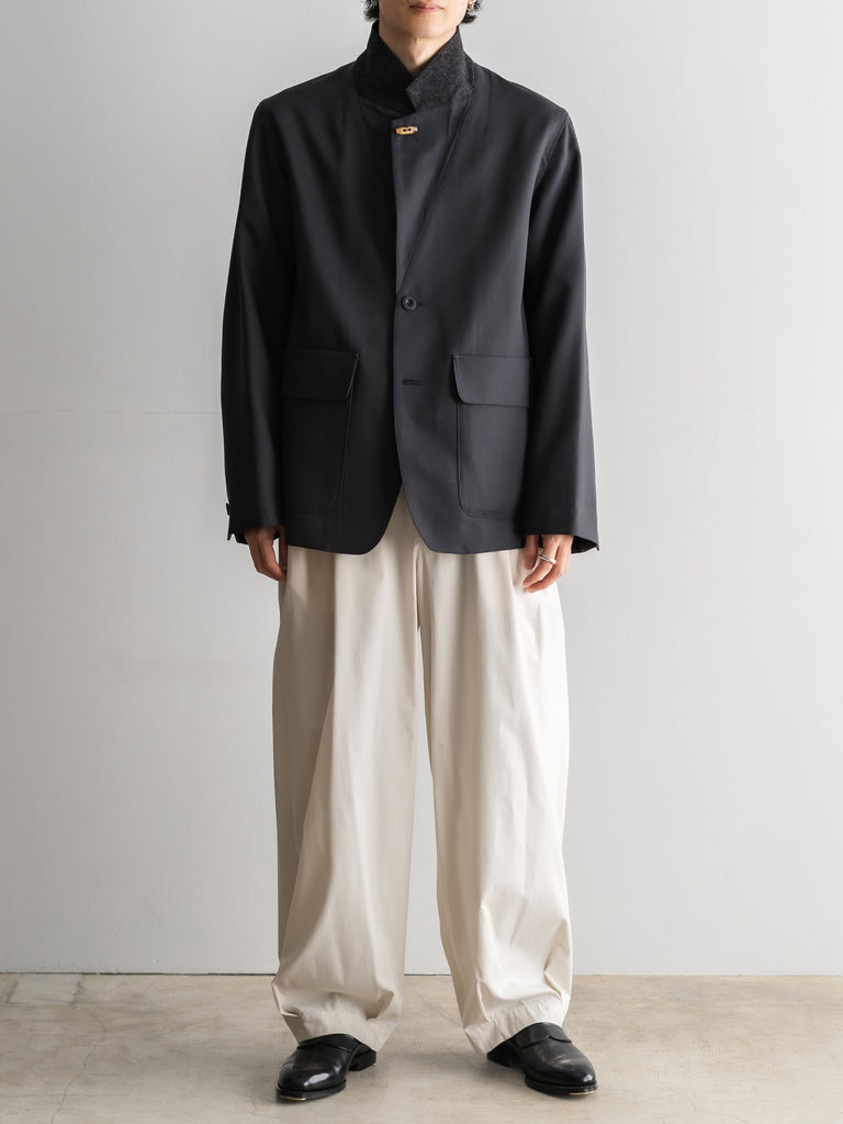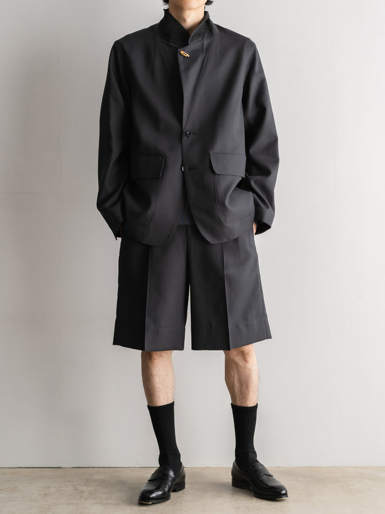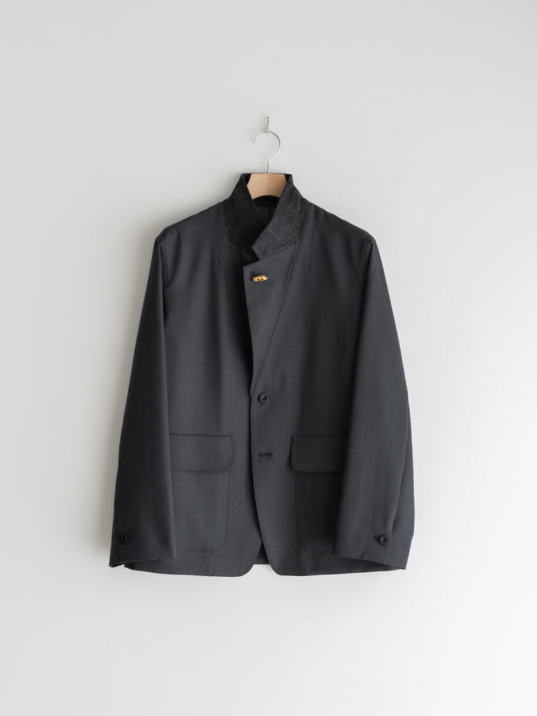 二重織のサマーウール素材を使用した、一重仕立ての立ち襟ジャケット。