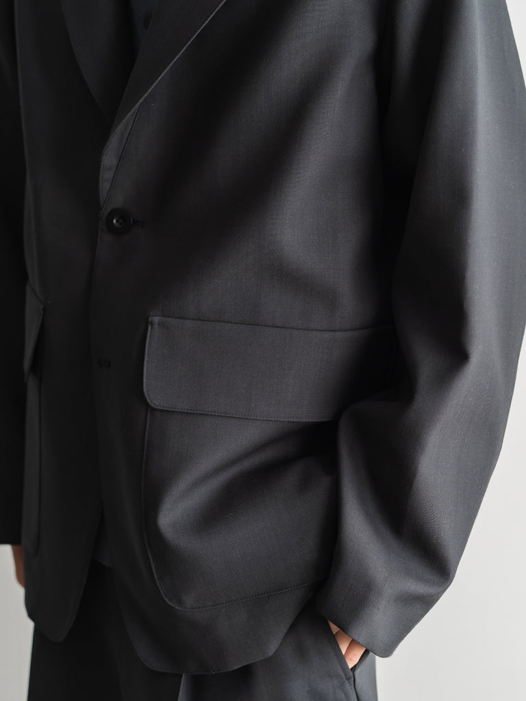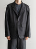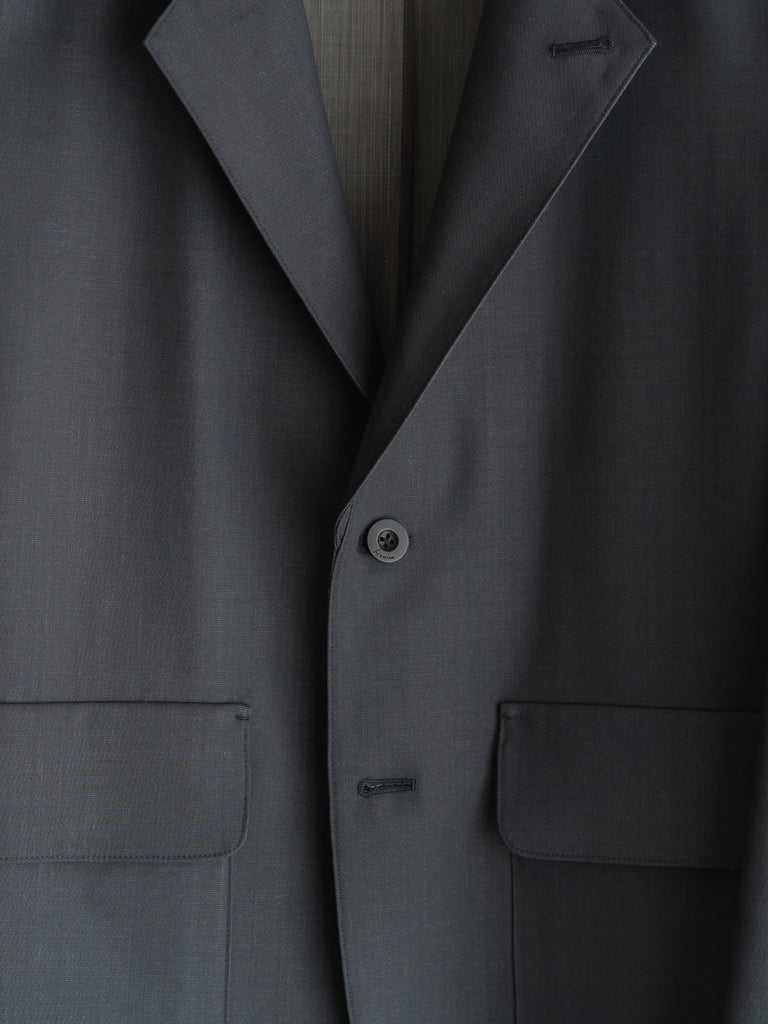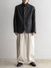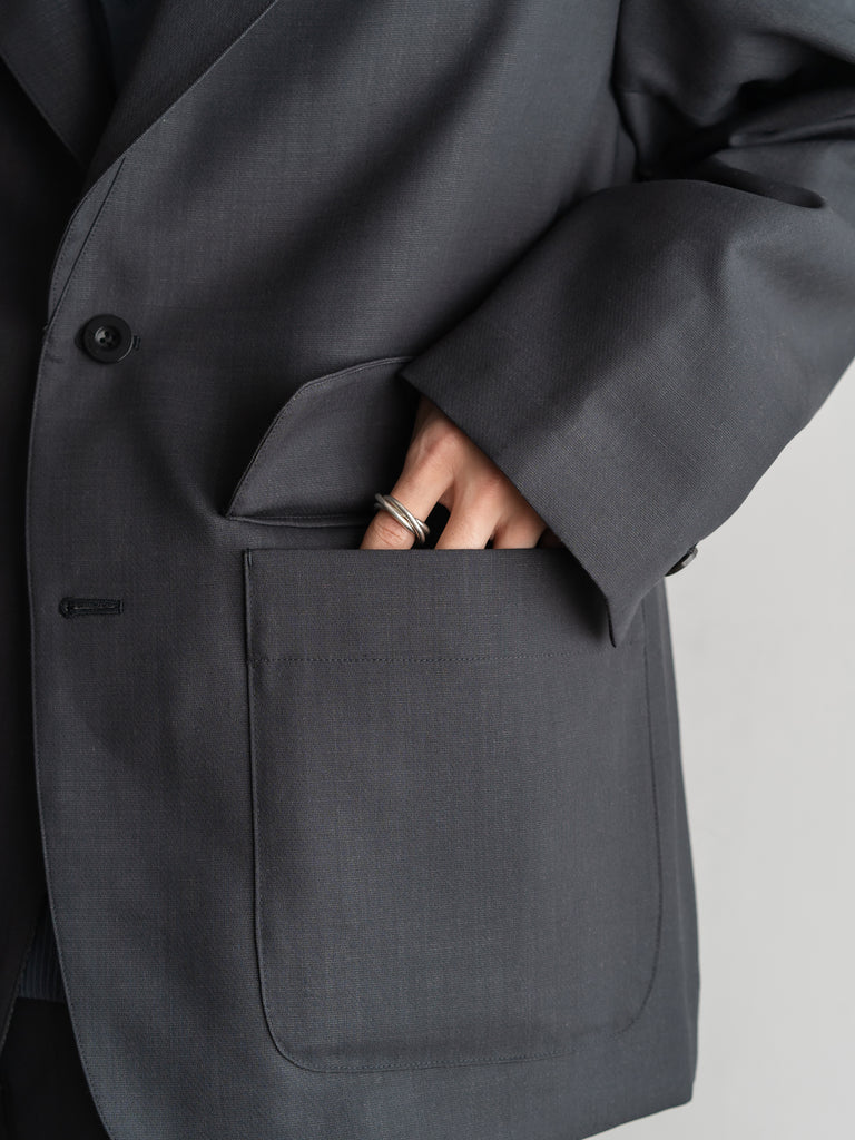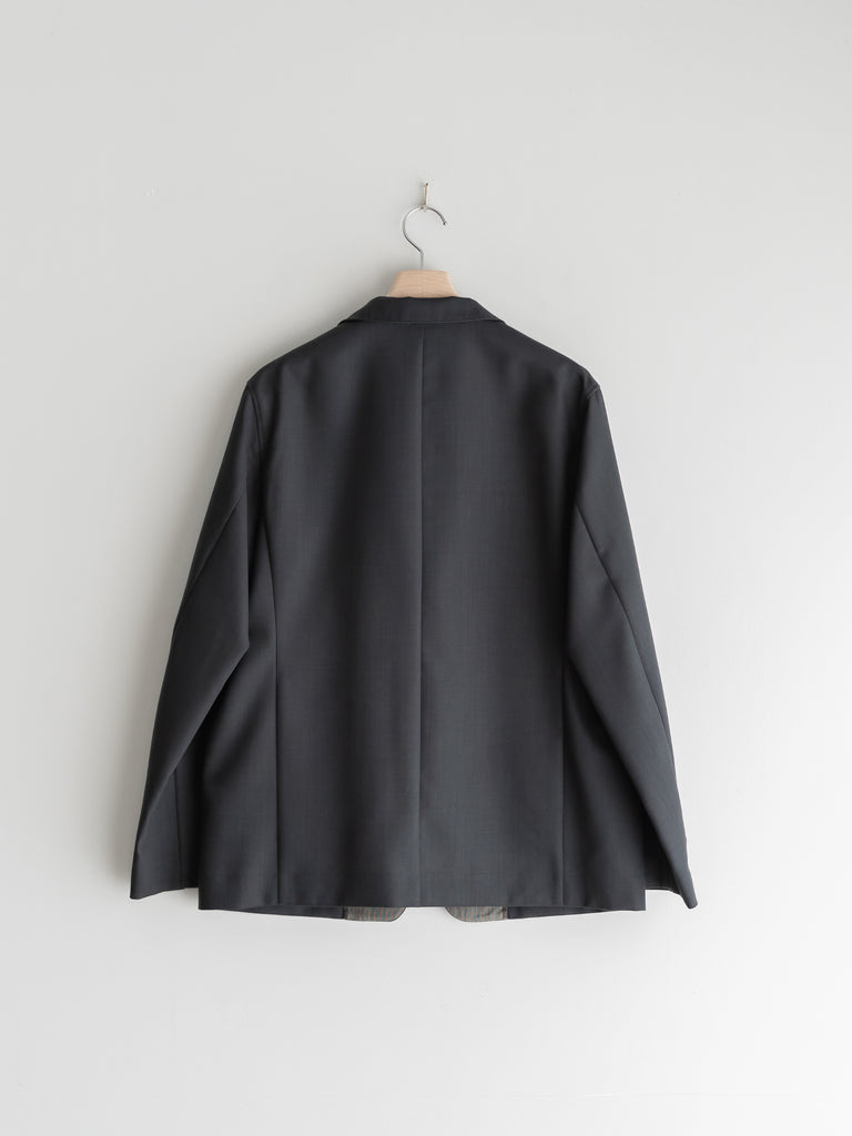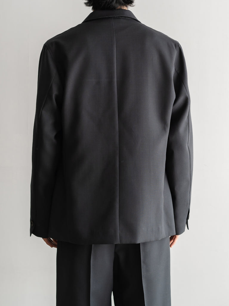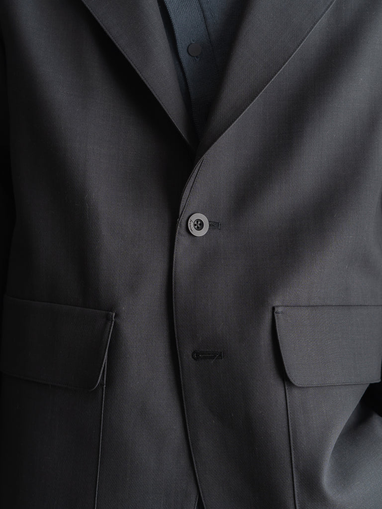 二重織のサマーウール素材を使用した、一重仕立ての立ち襟ジャケット。