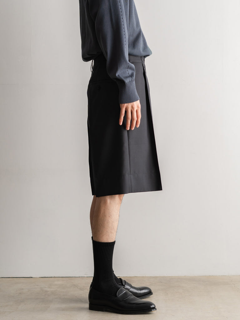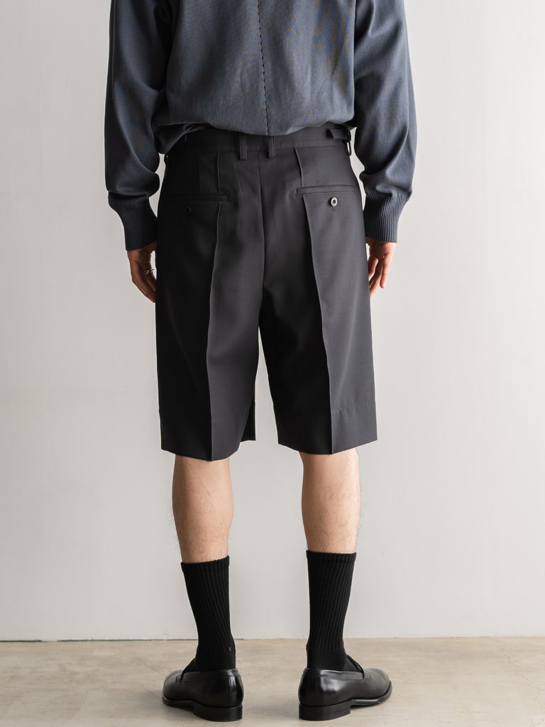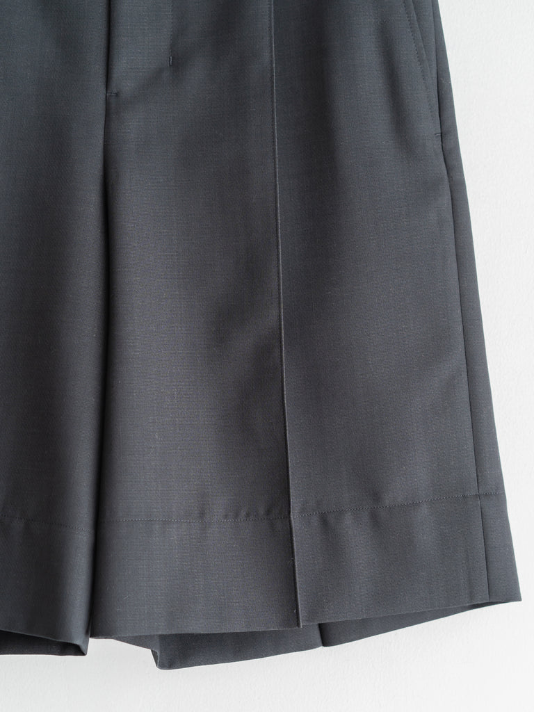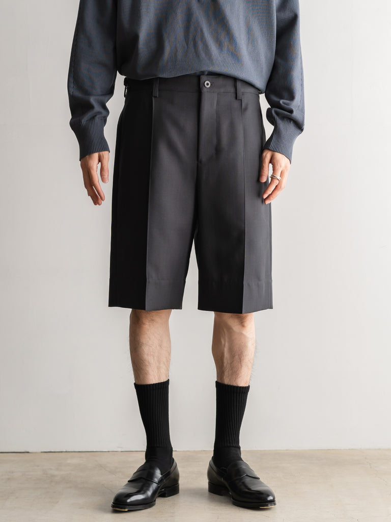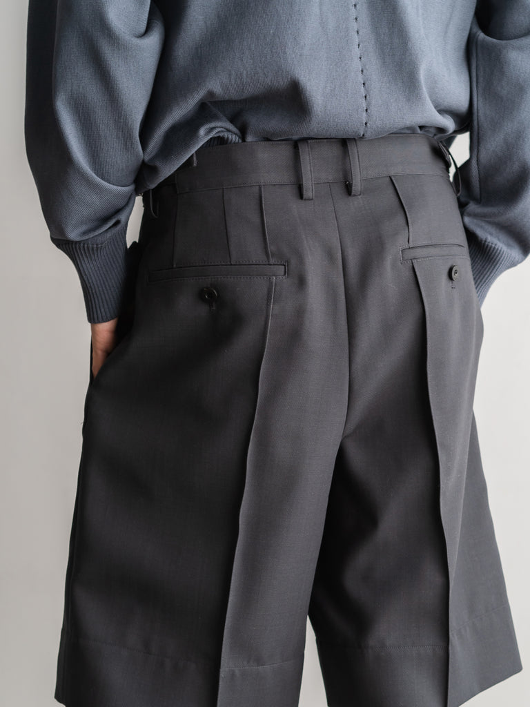 二重織りのサマーウール素材を使用した、裏無しの1タックストレートショーツ 。